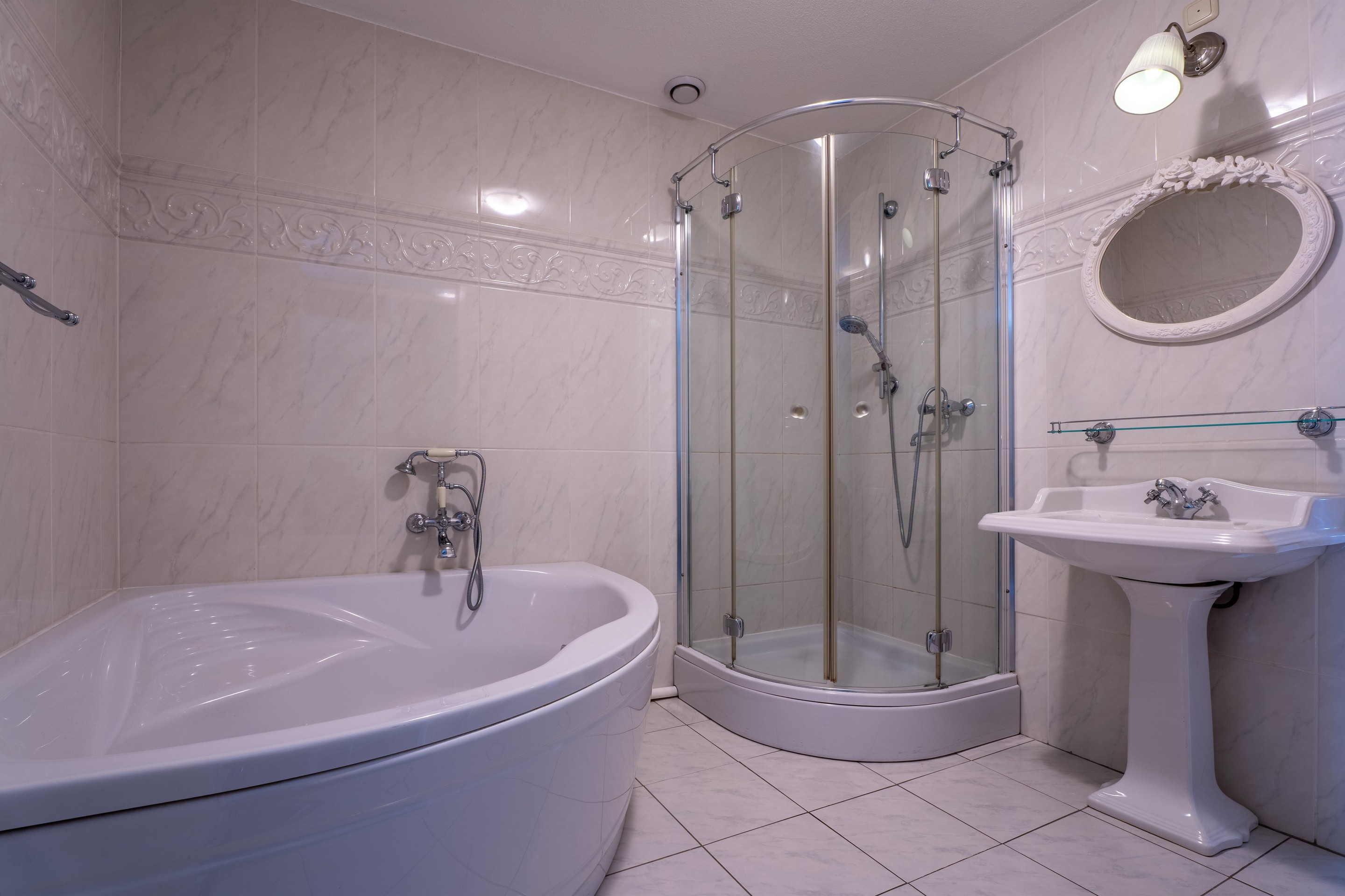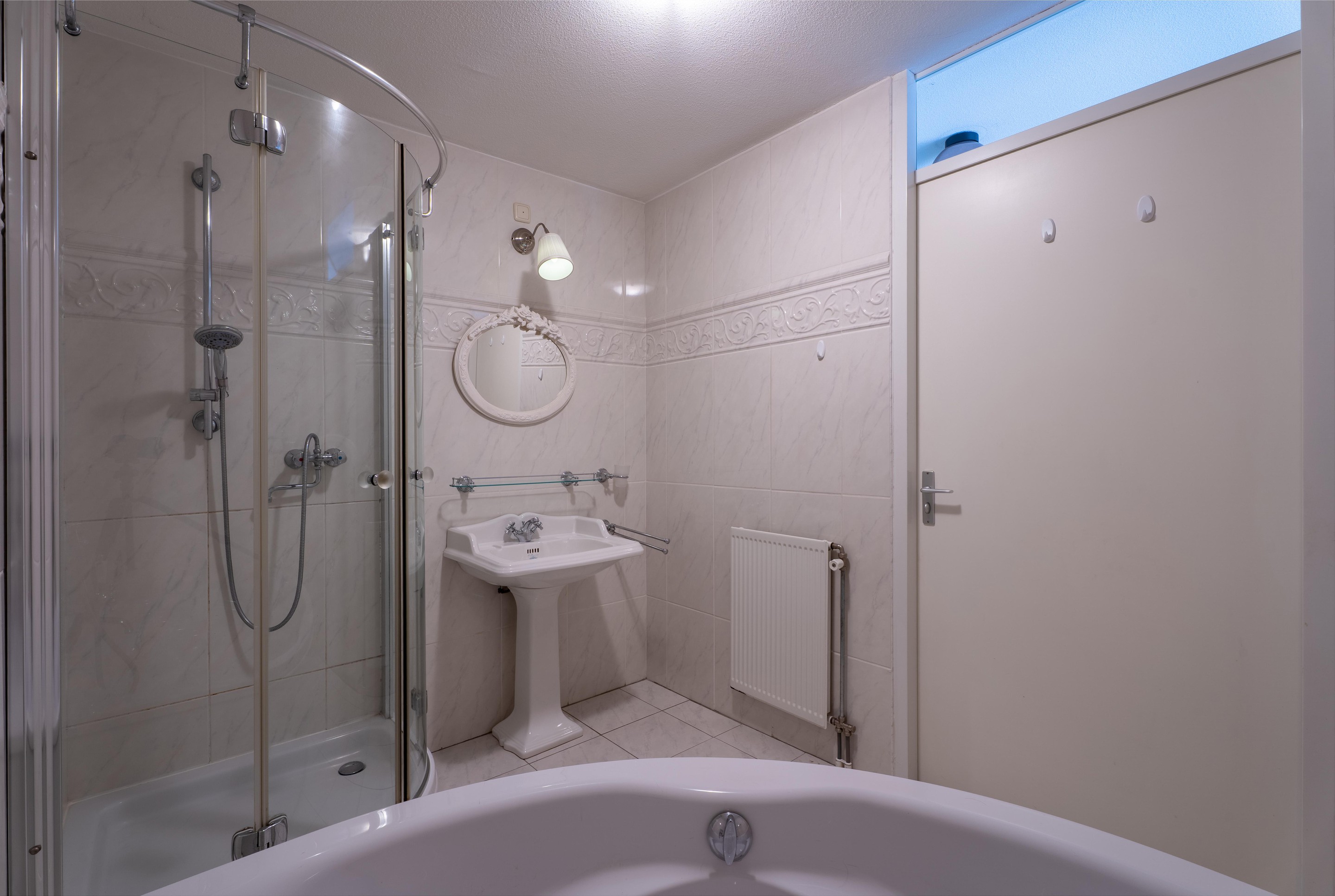 De verzorgde badkamer is beschikt over een hoekbad, een douchecabine en een wastafel.