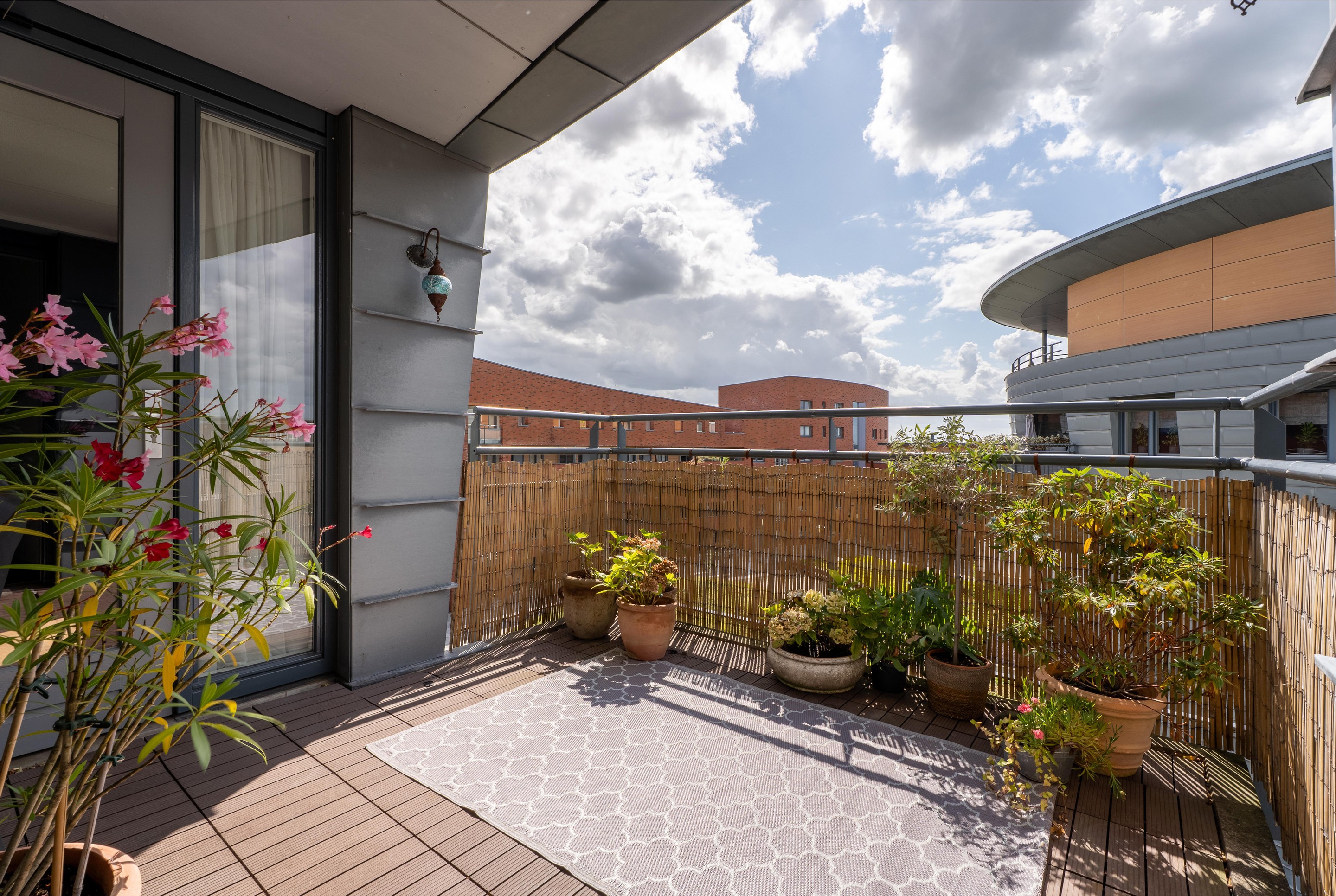 Zowel vanuit de woonkamer als de hoofdslaapkamer heb je toegang tot het deels overdekte balkon van 9 vierkante meter, waar je het hele jaar door kunt genieten van het buitenleven.