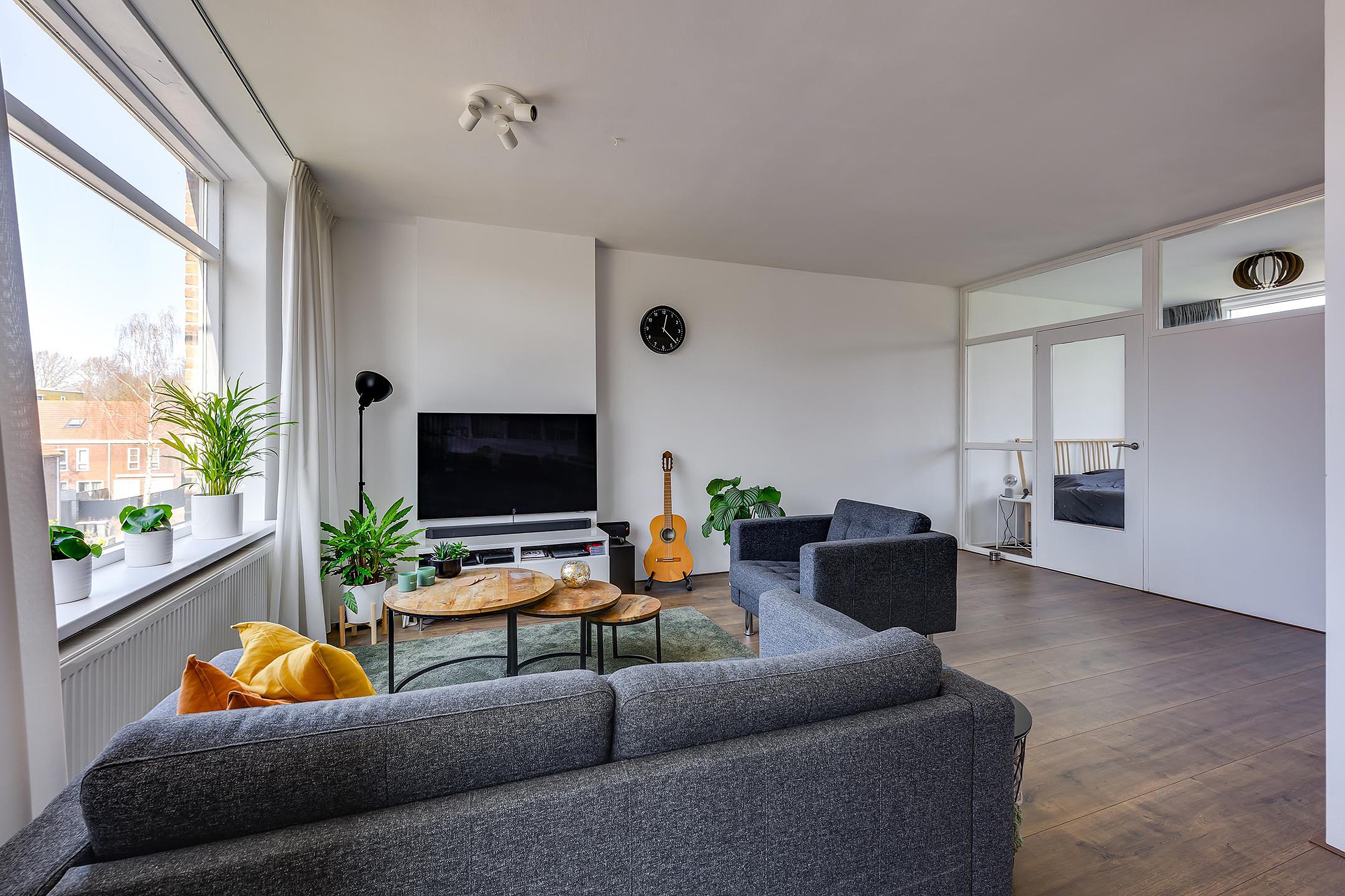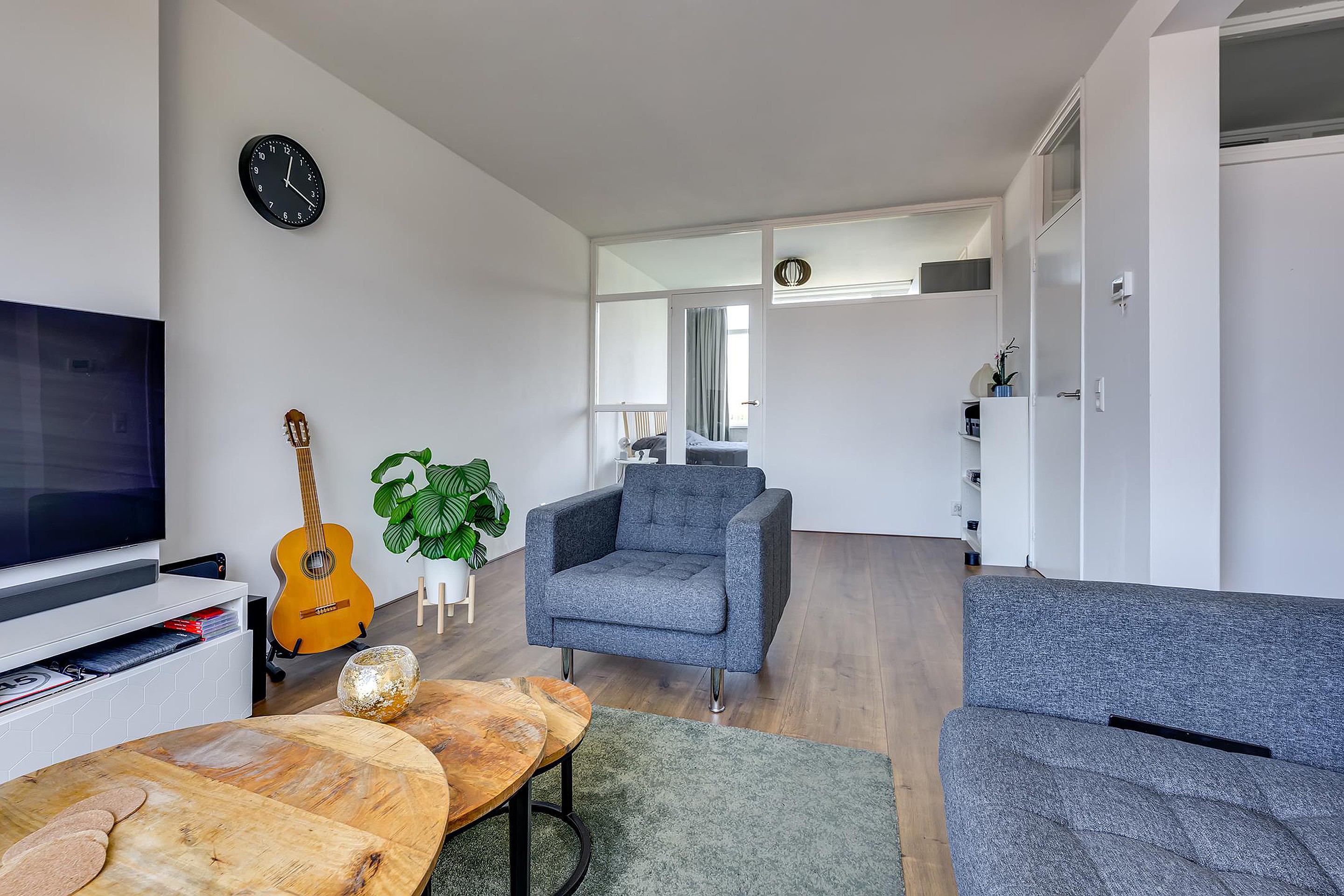 De woonkamer is ruim en licht van opzet dankzij de grote raampartijen. Hierdoor ontstaat een prettige leefruimte met veel daglicht. De woonkamer is eenvoudig in te delen in een comfortabel zitgedeelte en een gezellige eethoek. Vanuit de woonkamer is er directe toegang tot het balkon aan de voorzijde van de woning, gelegen op het zuidwesten.