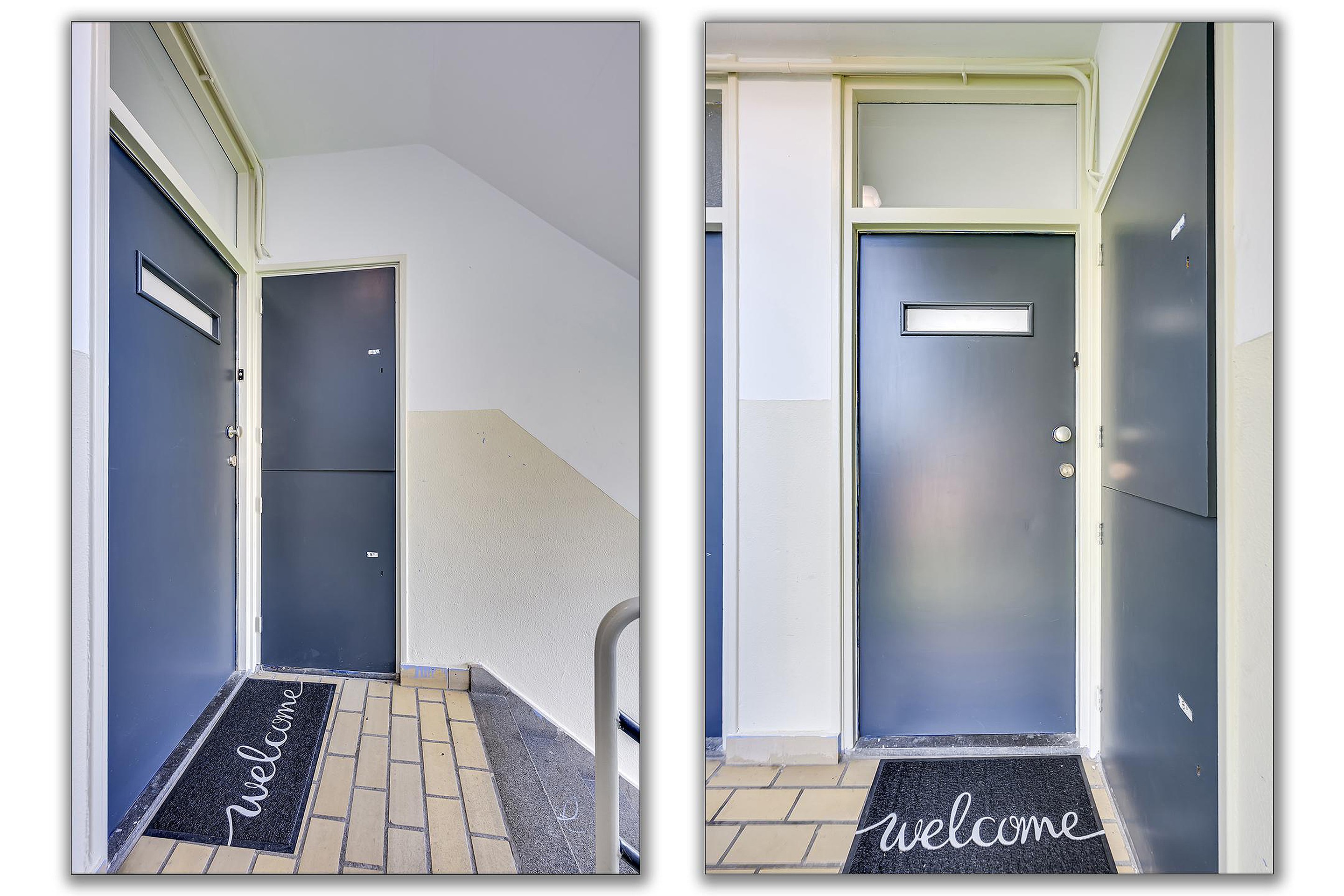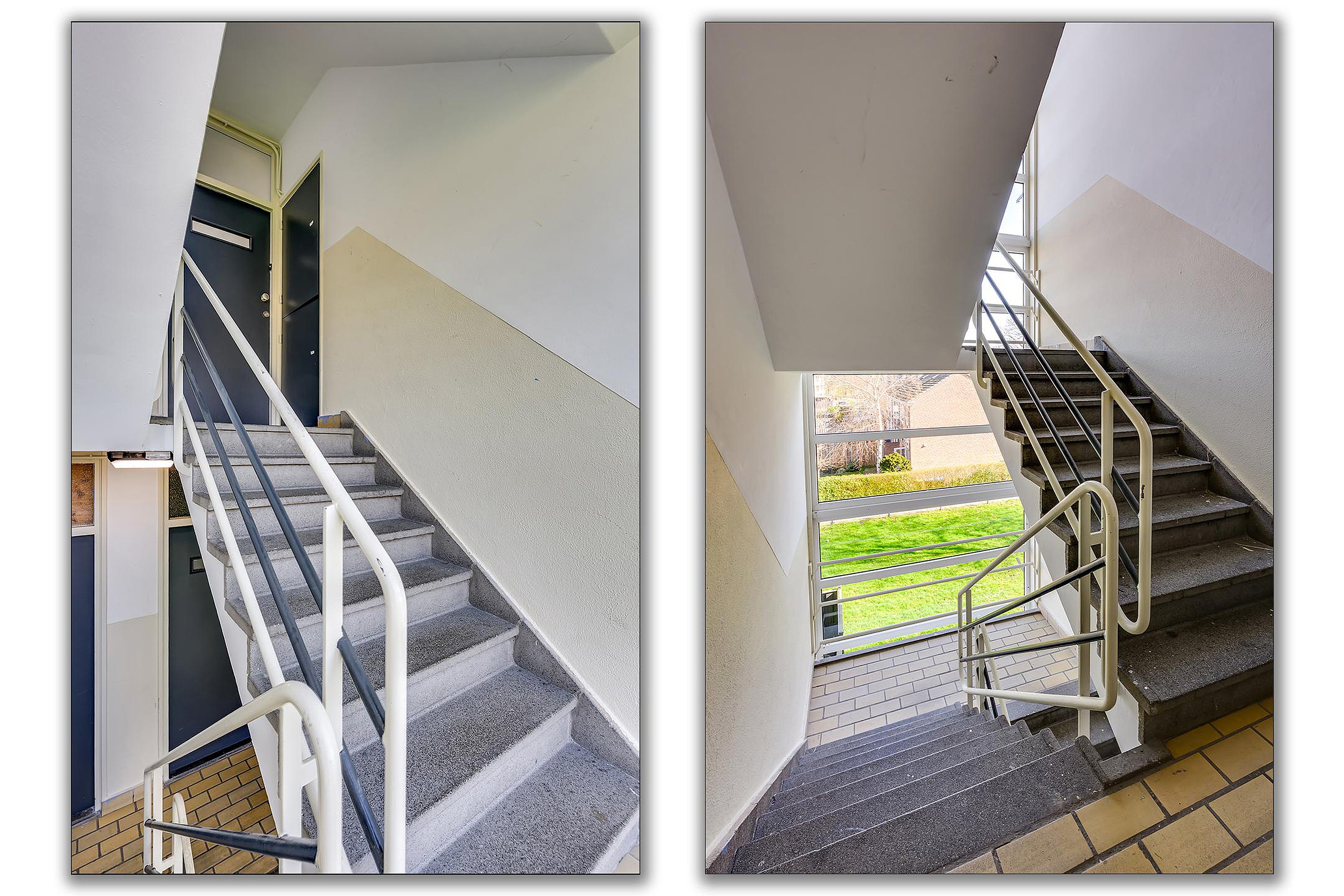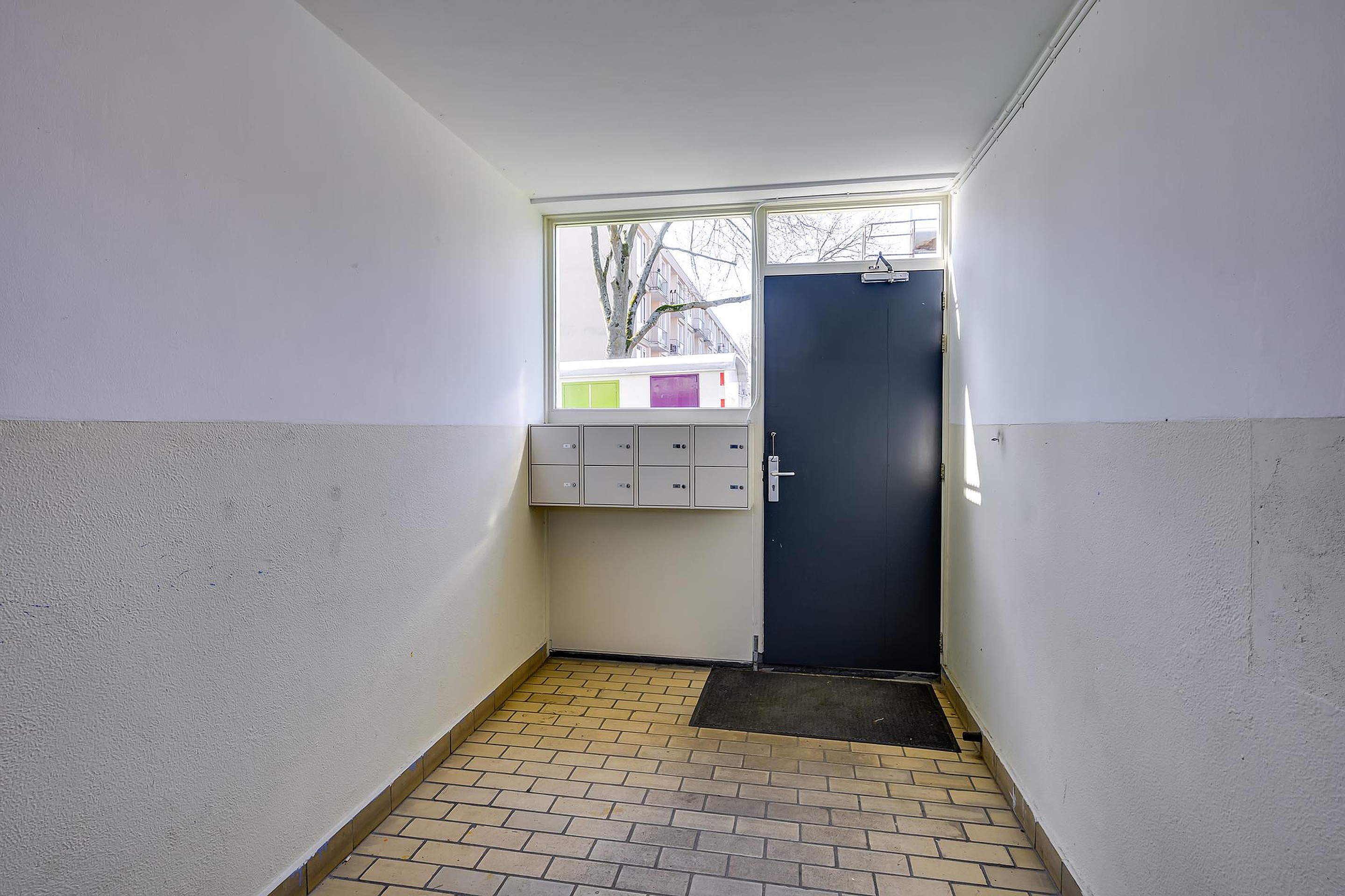 Afgesloten entree met brievenbussen, toegang tot het trappenhuis en de bergingen.