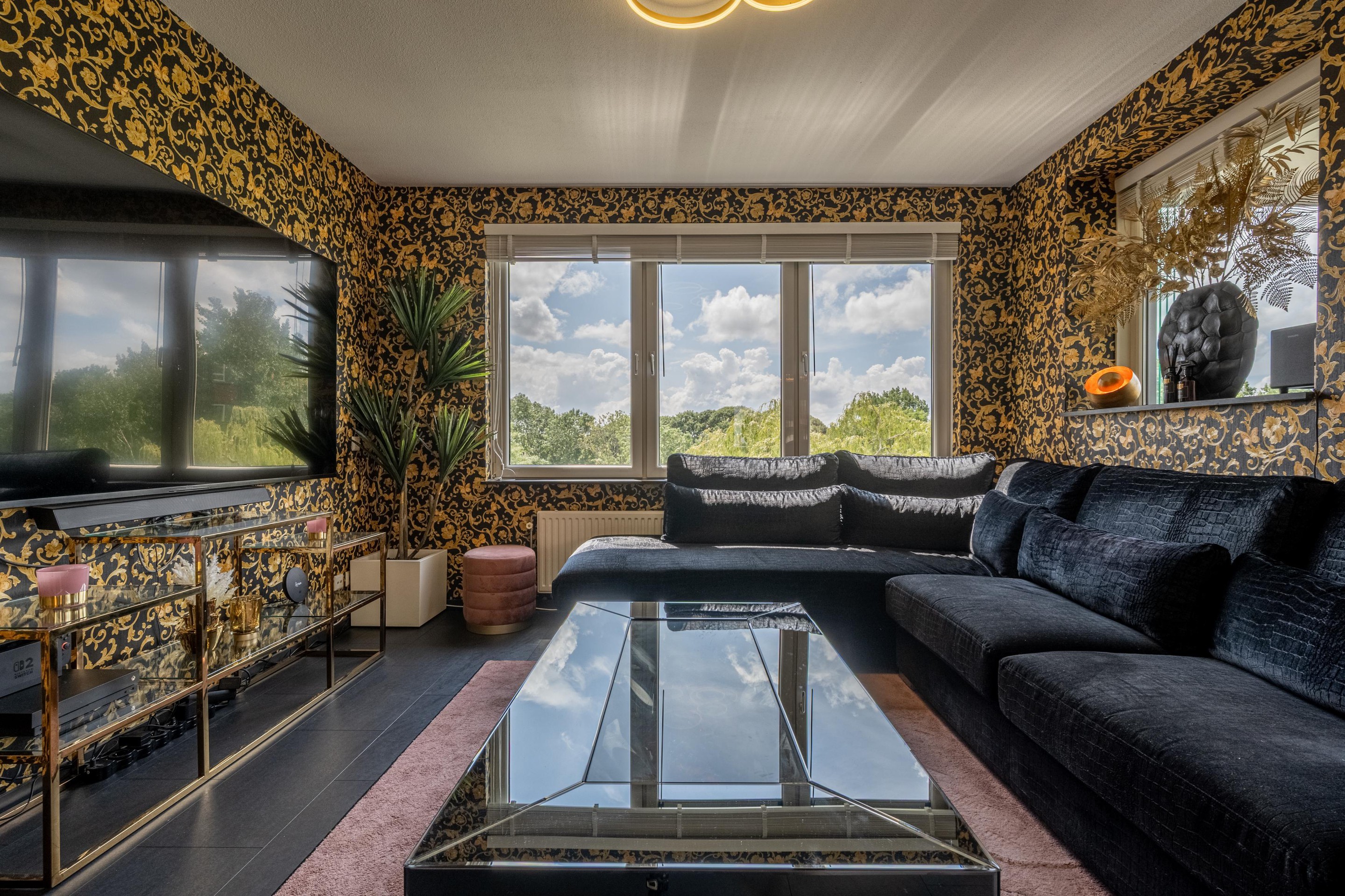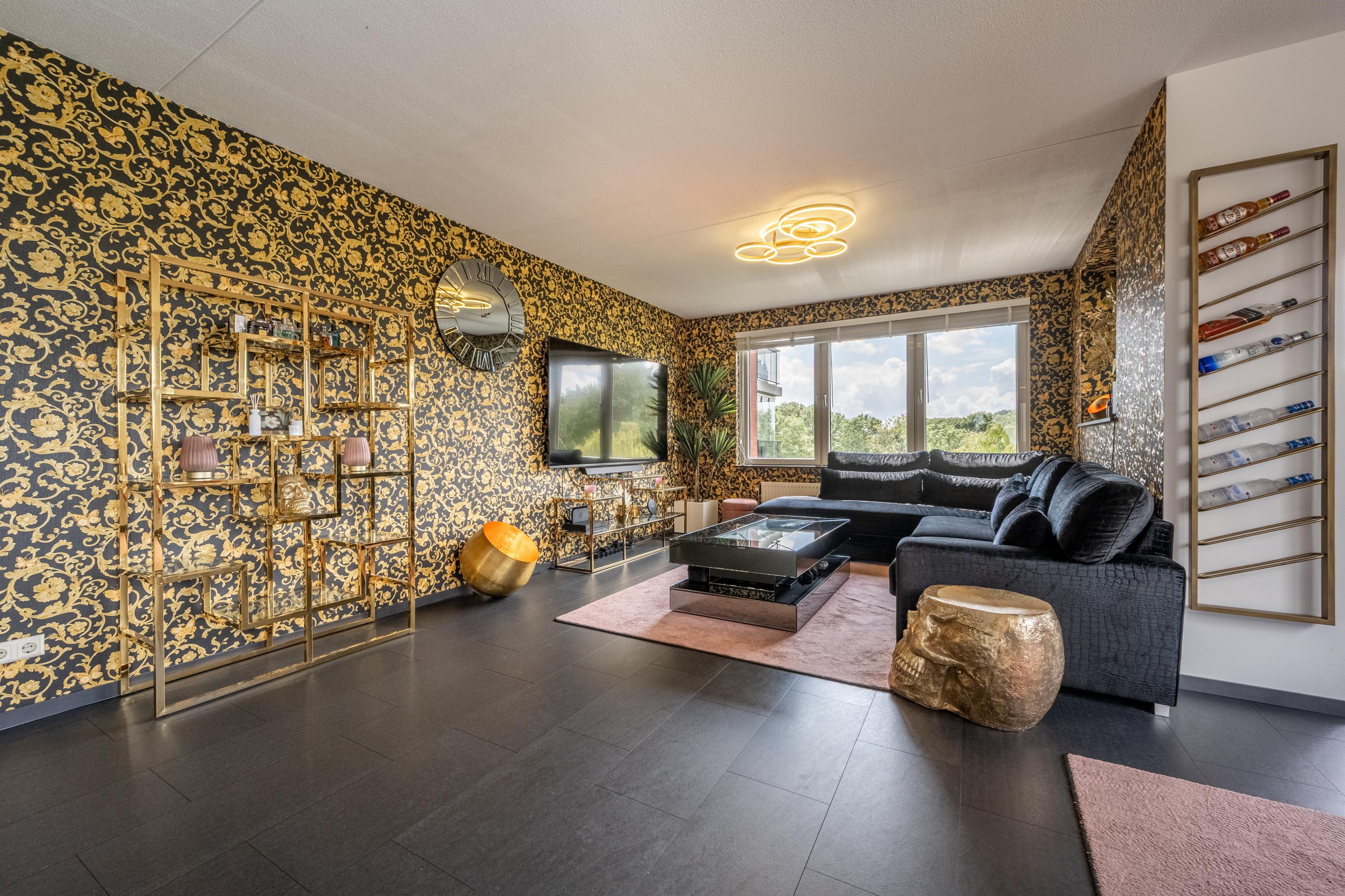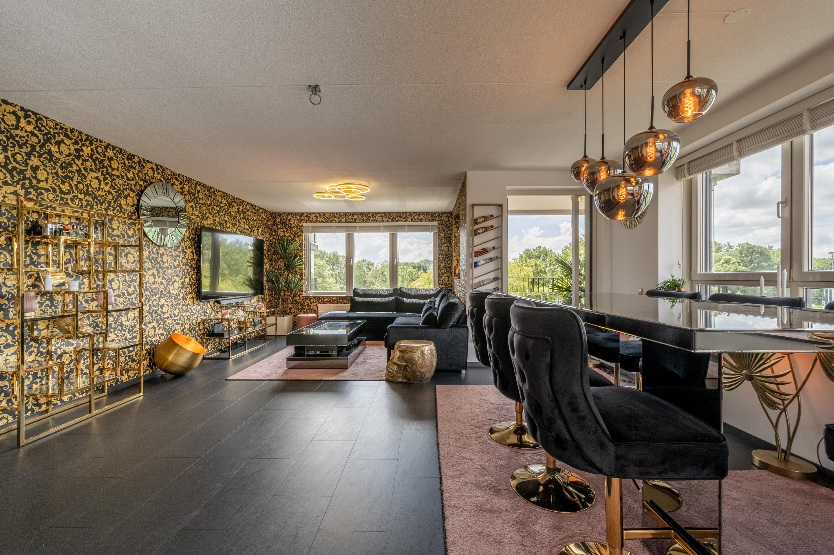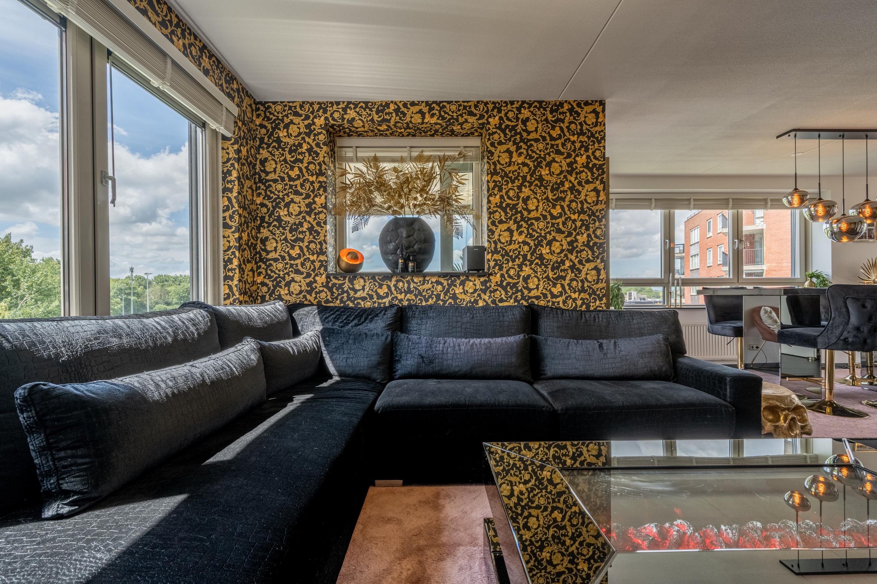 De royale L-vormige woonkamer is heerlijk licht dankzij de grote kunststof raampartijen met HR++ glas en biedt een prachtig uitzicht over de omliggende waterpartijen. De sfeervolle gashaard maakt het woongenot compleet. De nette laminaatvloer geeft het geheel een moderne uitstraling.