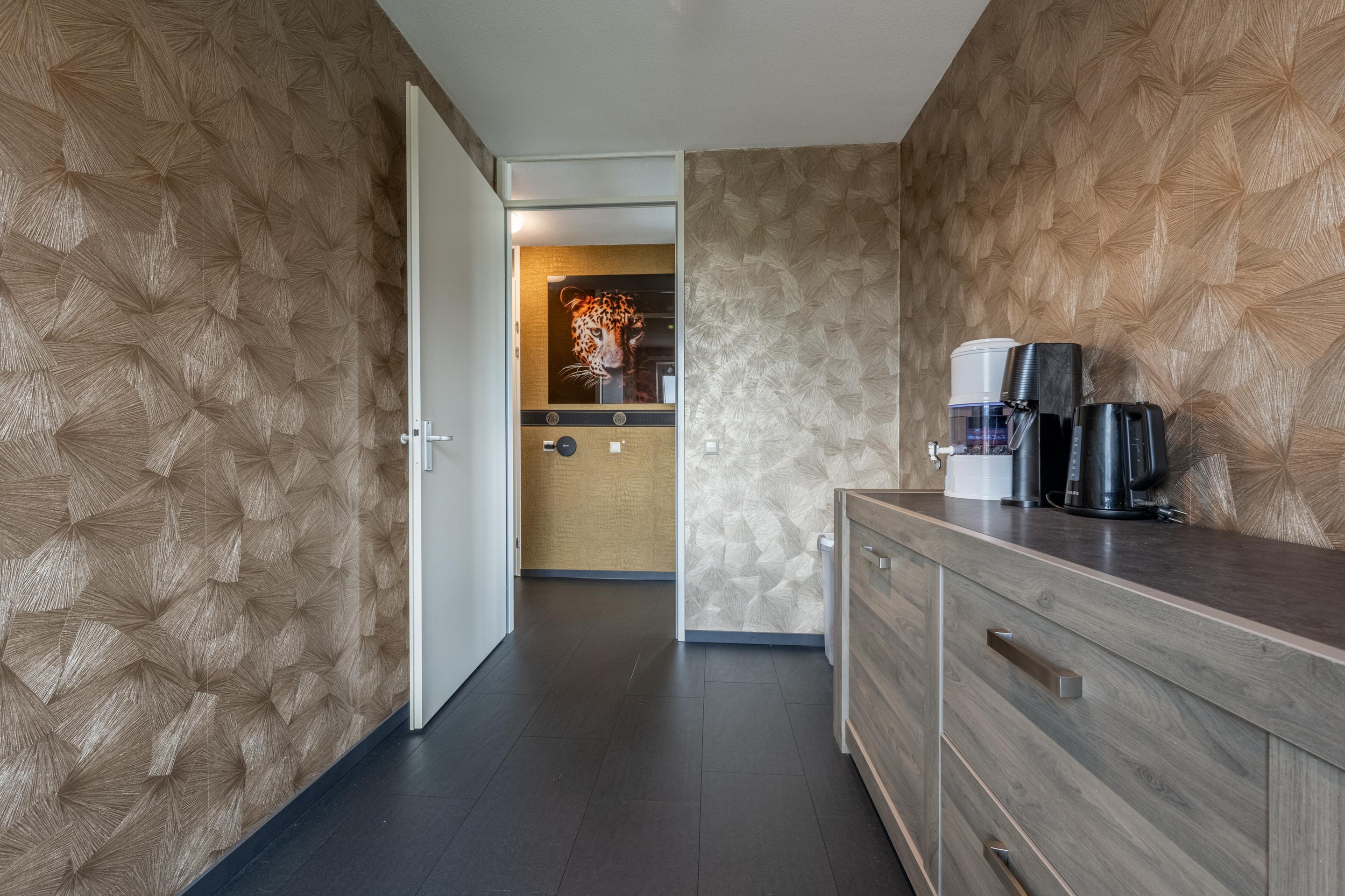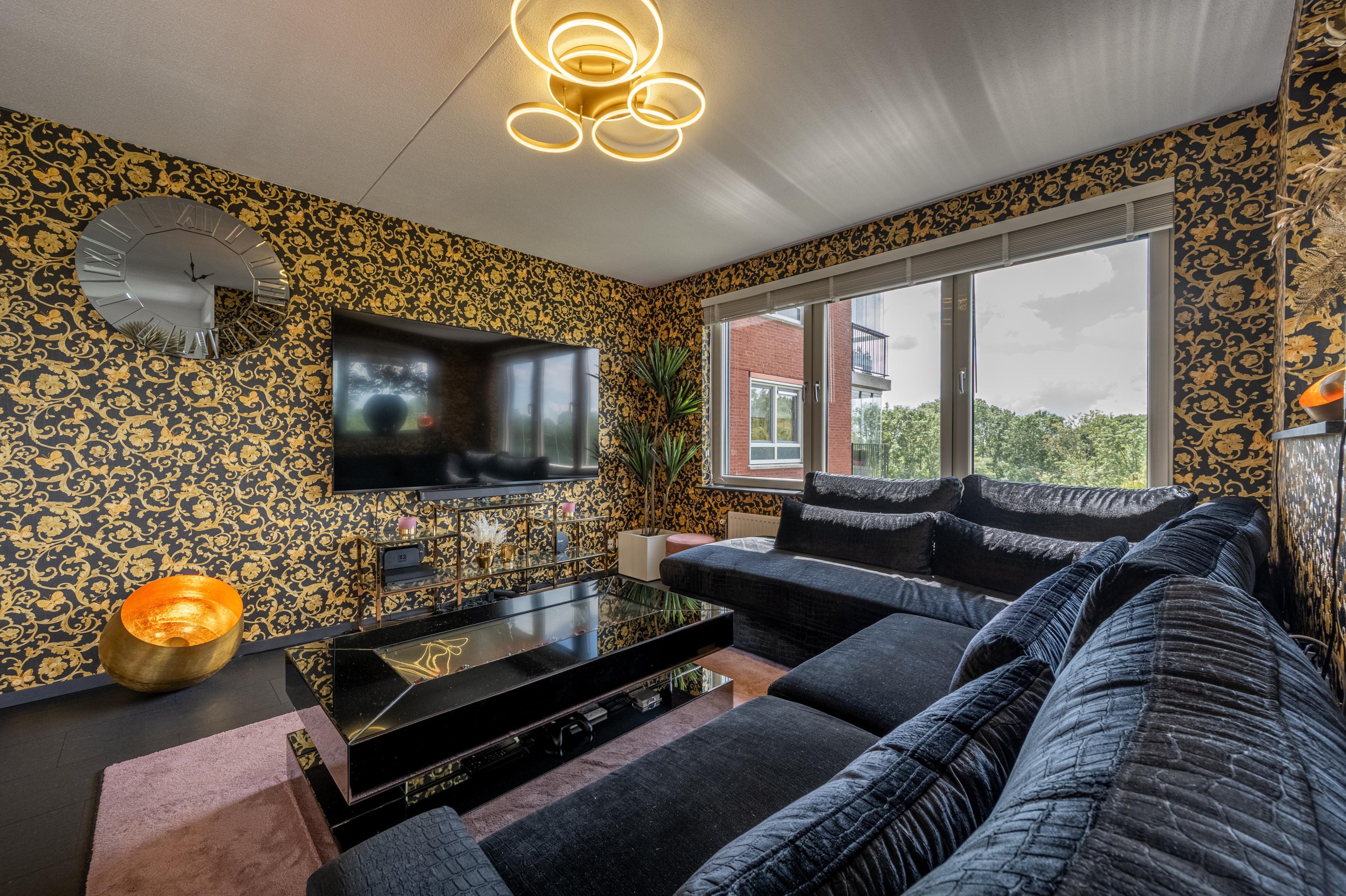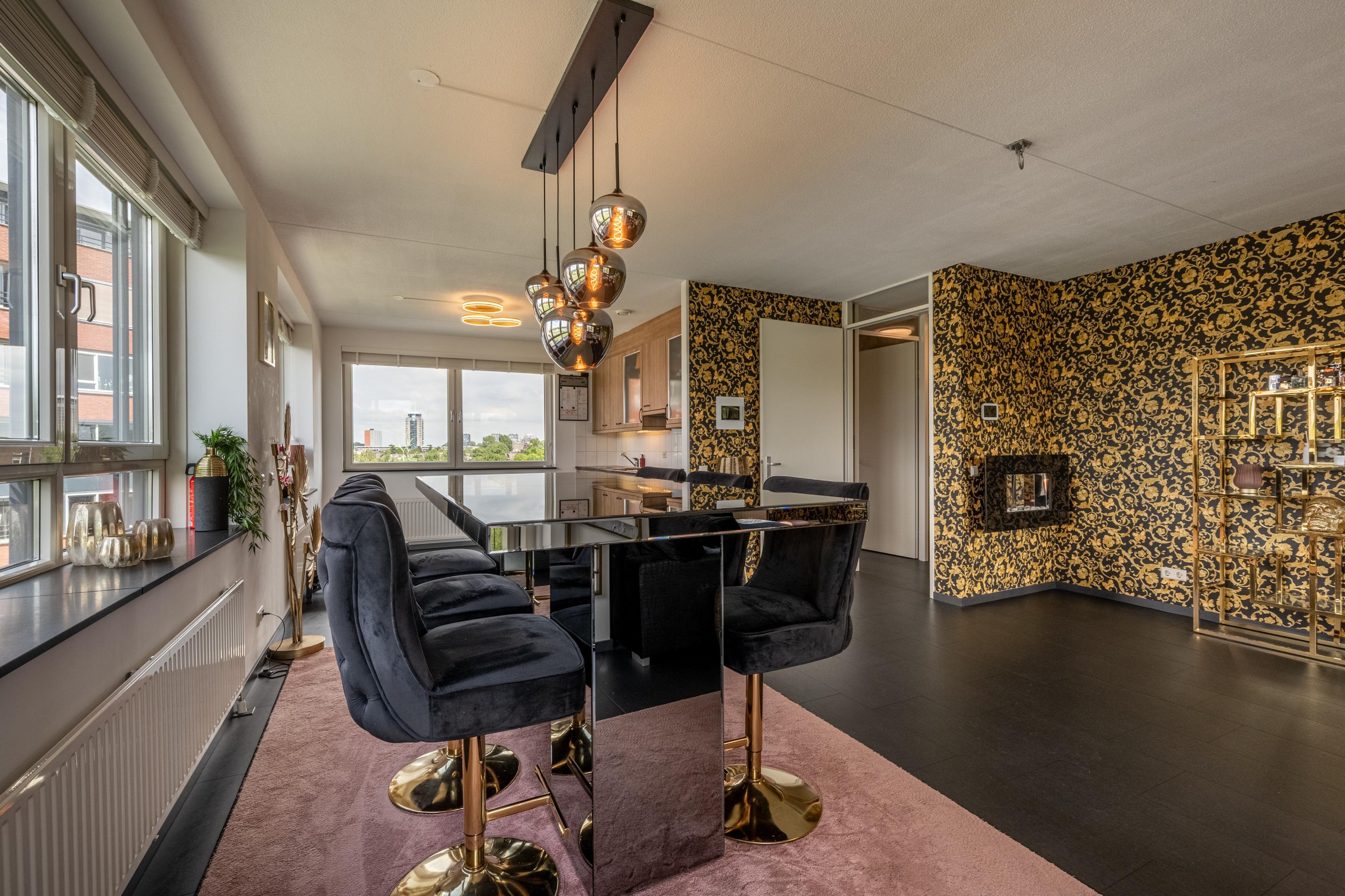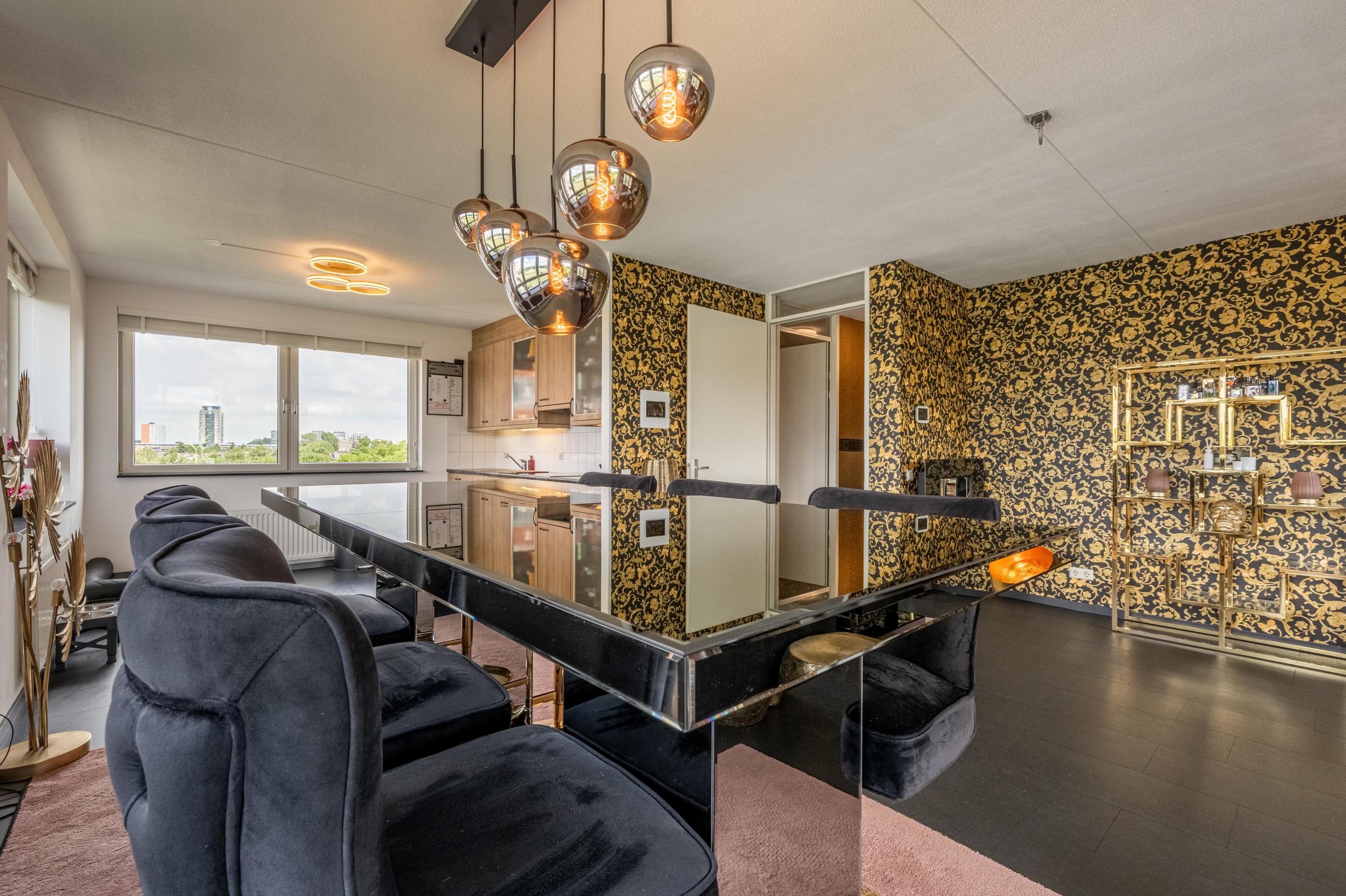 De royale L-vormige woonkamer is heerlijk licht dankzij de grote kunststof raampartijen met HR++ glas en biedt een prachtig uitzicht over de omliggende waterpartijen. De sfeervolle gashaard maakt het woongenot compleet. De nette laminaatvloer geeft het geheel een moderne uitstraling.