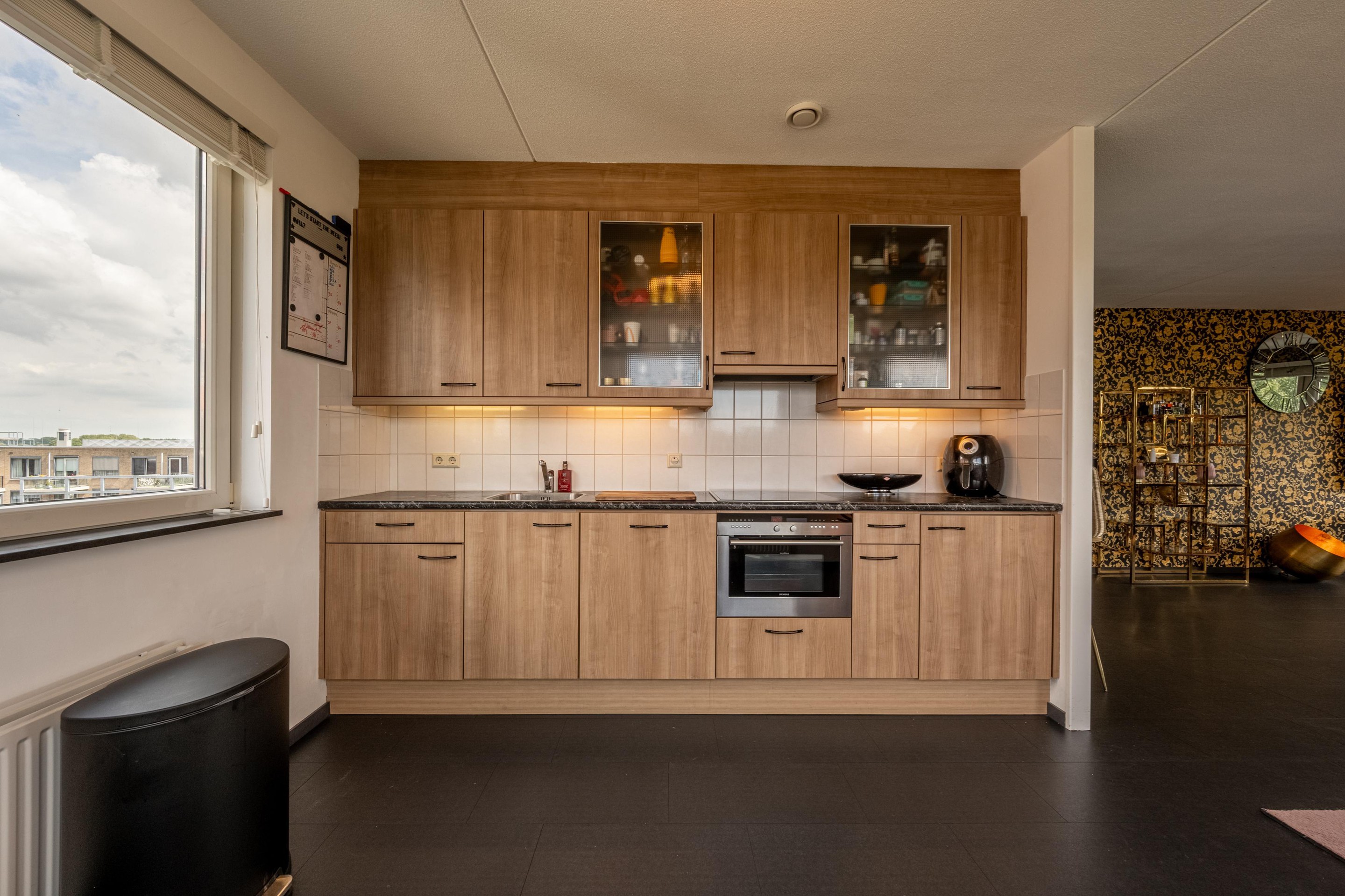 De keuken staat in open verbinding met de woonkamer en is opgesteld in een rechte lijn. De keuken is uitgerust met moderne inbouwapparatuur, waaronder een 4-pits inductiekookplaat, afzuigkap, combi-oven en vaatwasser.
