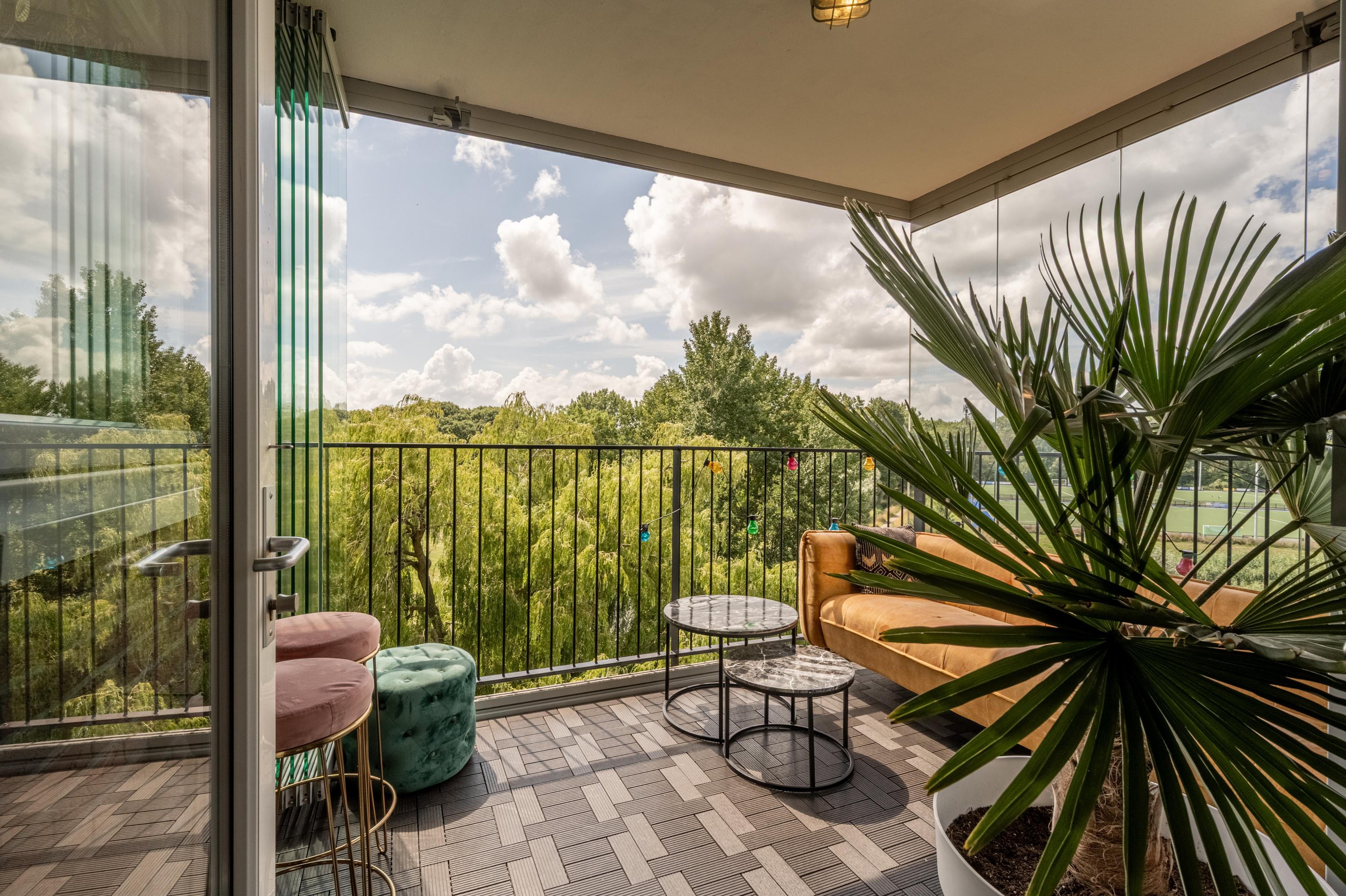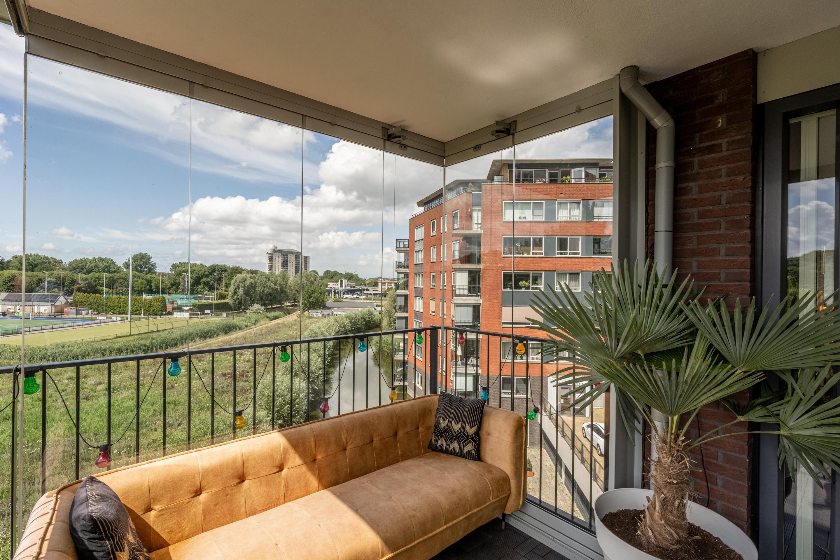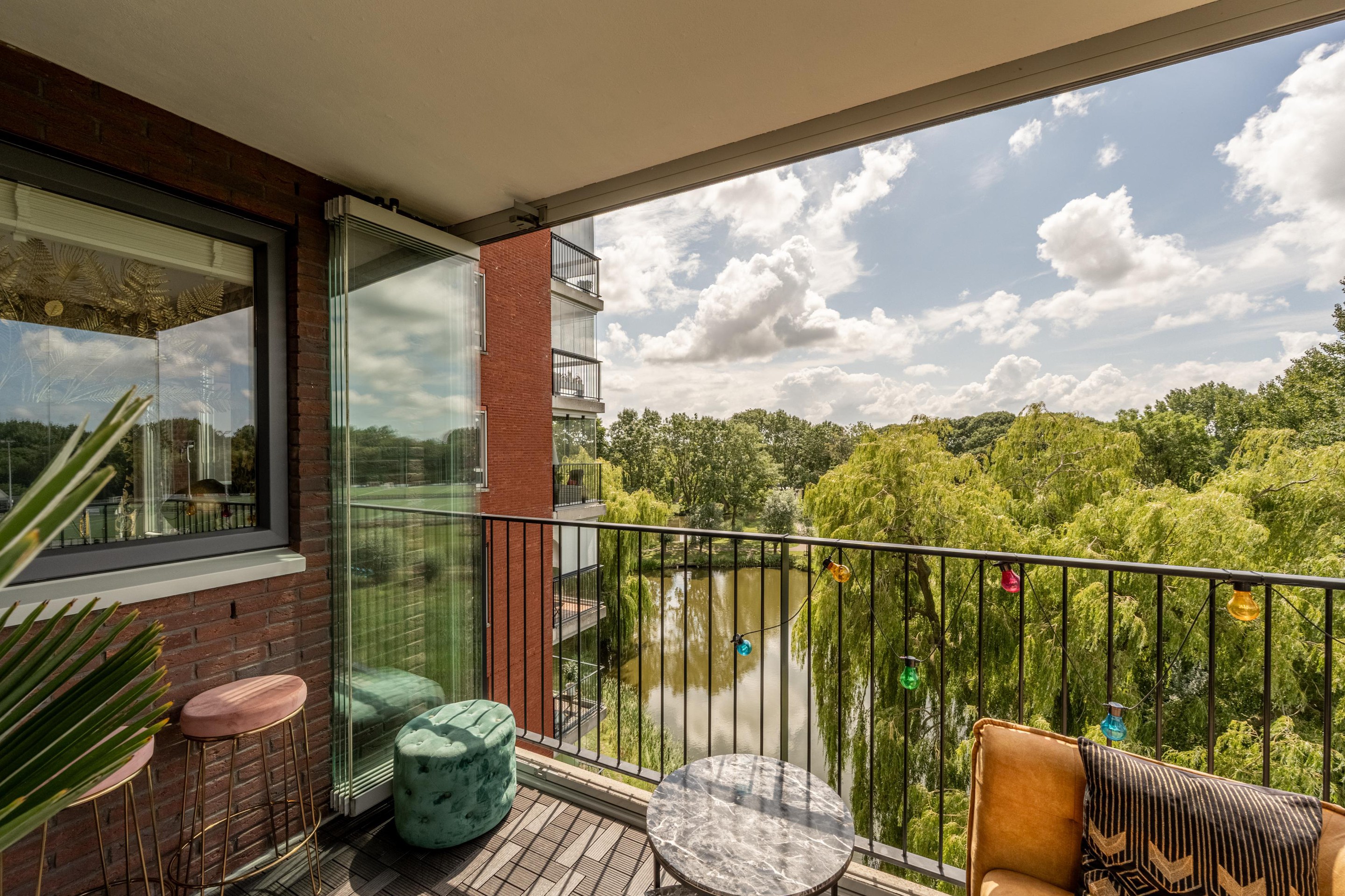 Via de woonkamer bereik je het westelijk gelegen balkon, dat is voorzien van afsluitbare glazen panelen. Zo geniet je het hele jaar door – zelfs in de winter – van het buitenleven en het uitzicht.