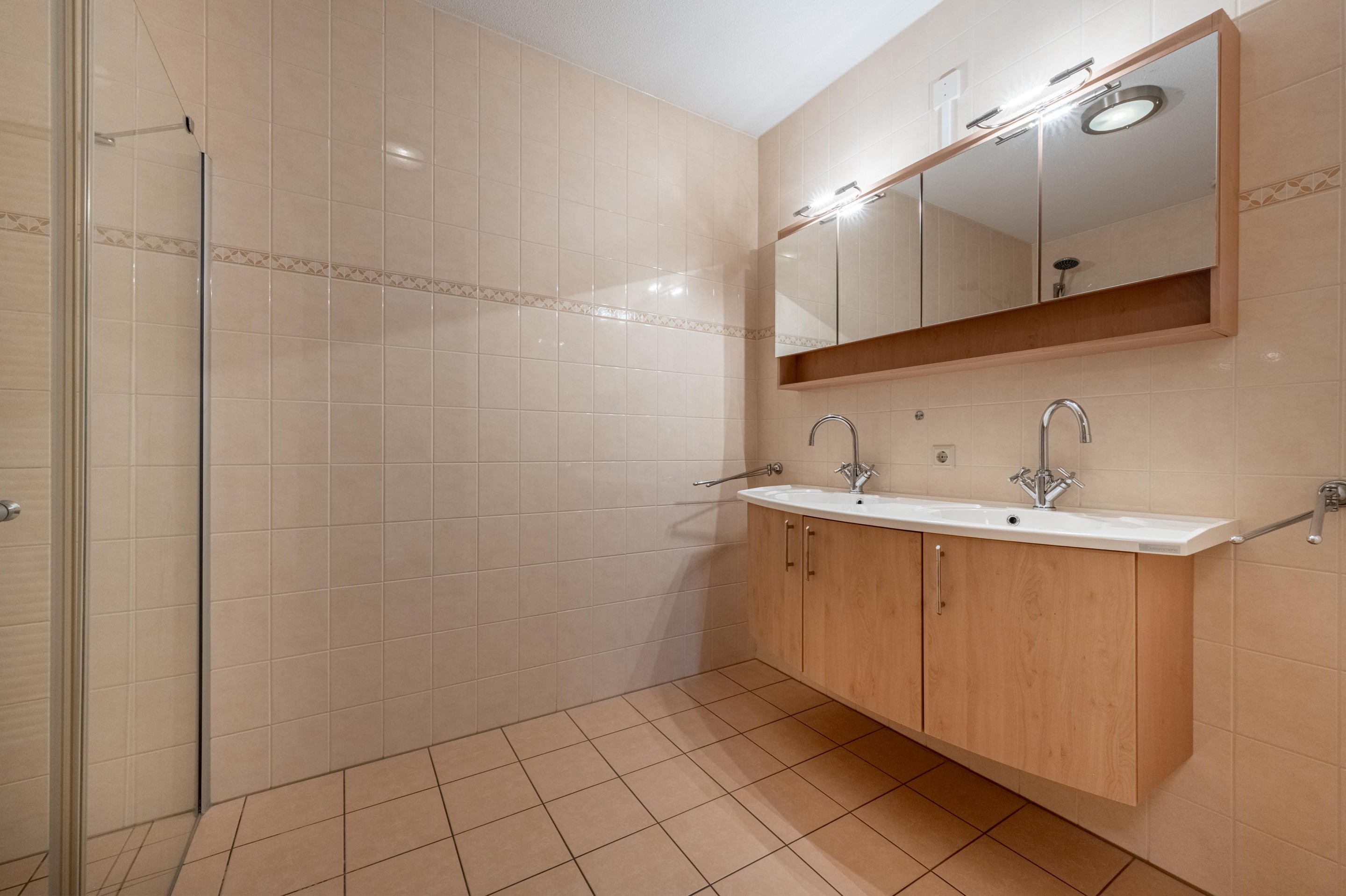 De volledig betegelde badkamer beschikt over een douche, een stijlvol wastafelmeubel, een designradiator en mechanische ventilatie.