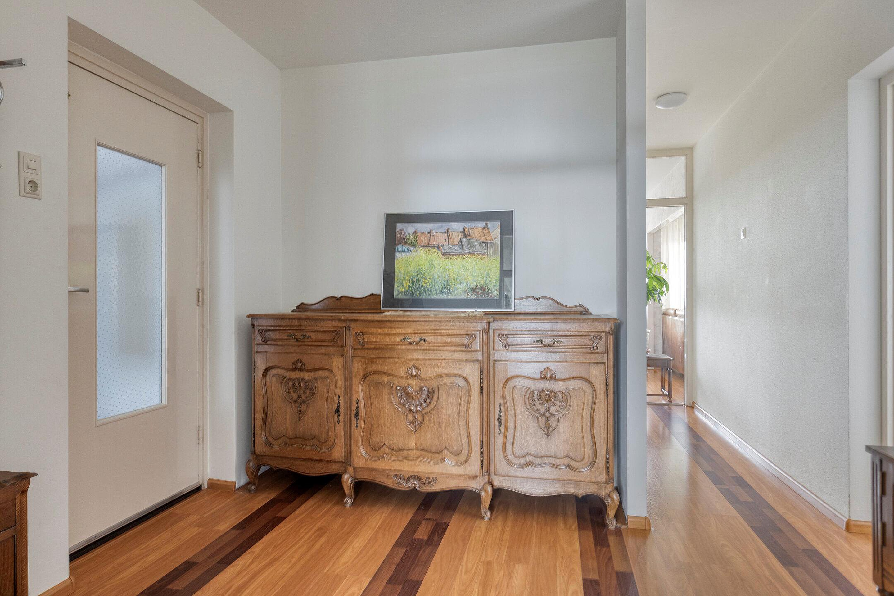 Ruime entree met hal, meterkast, videofoon en garderoberuimte. Toilet met handwasbakje en een praktische inpandige berging/bijkeuken.