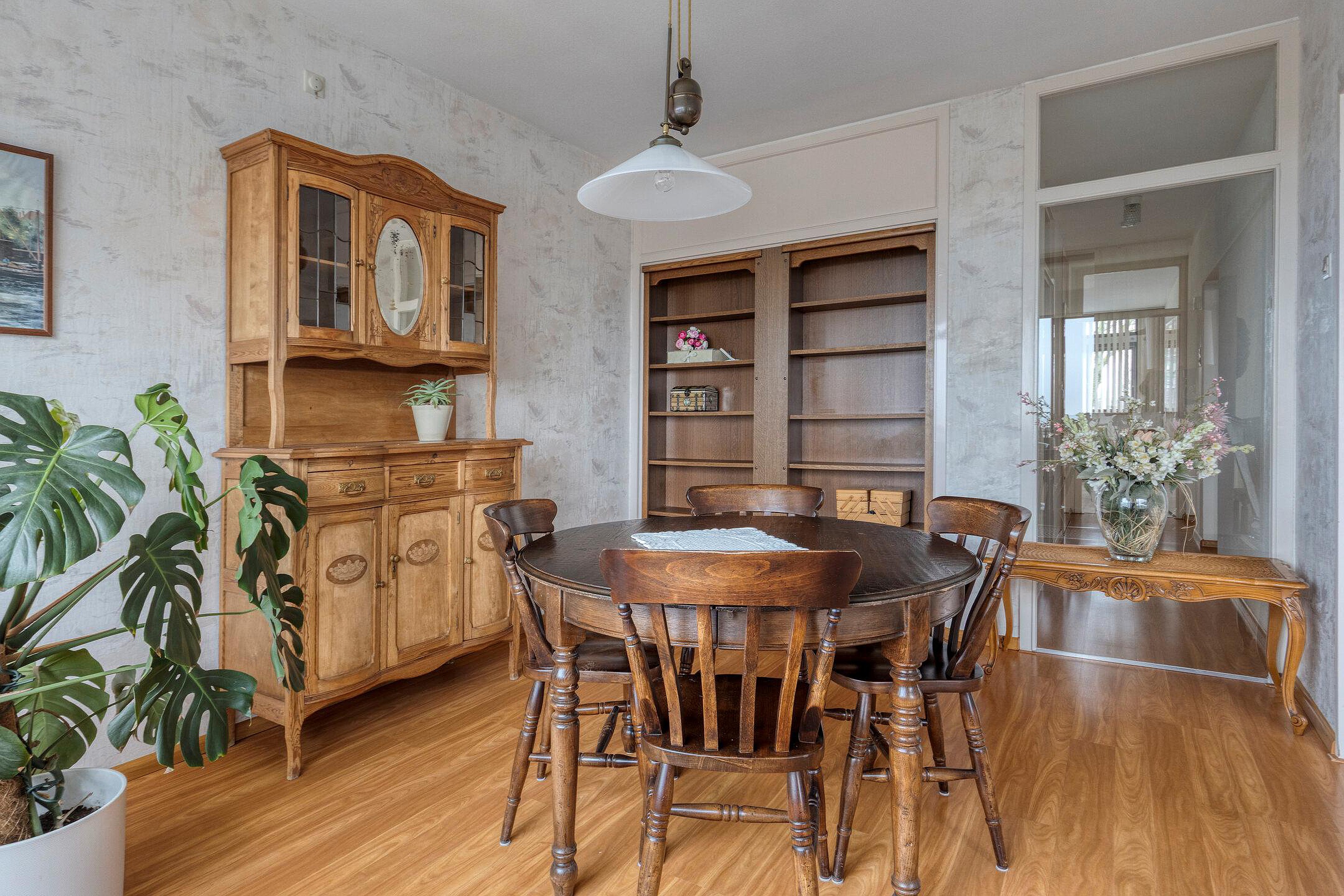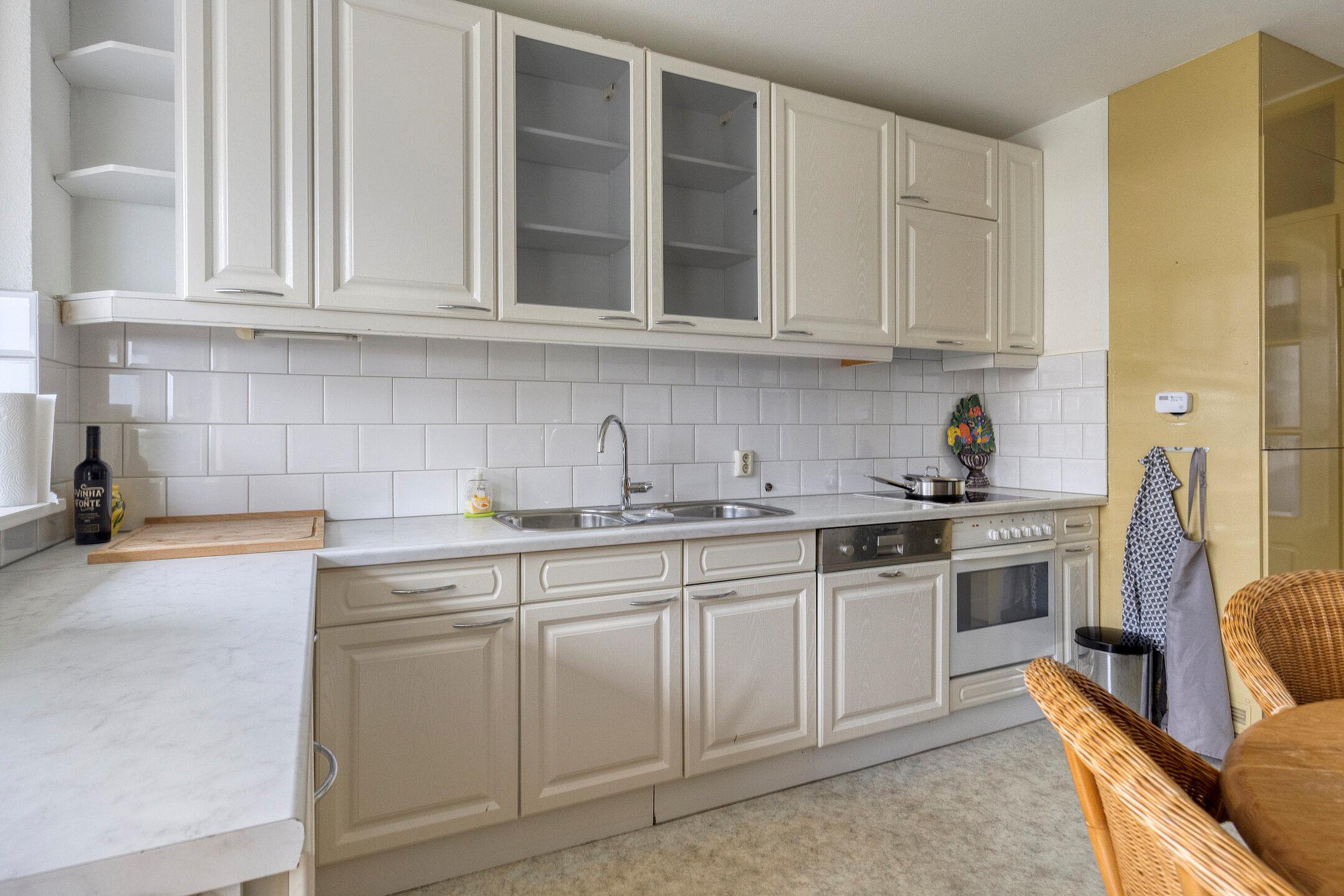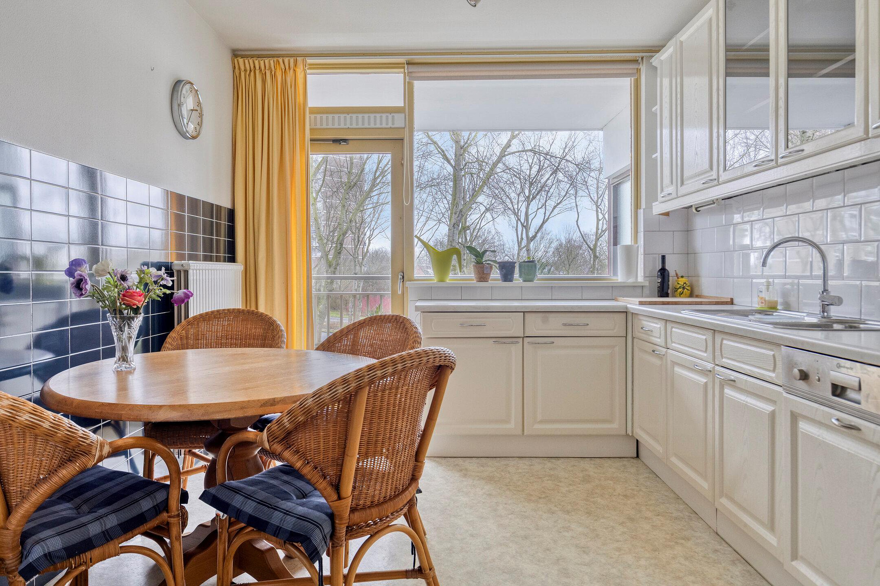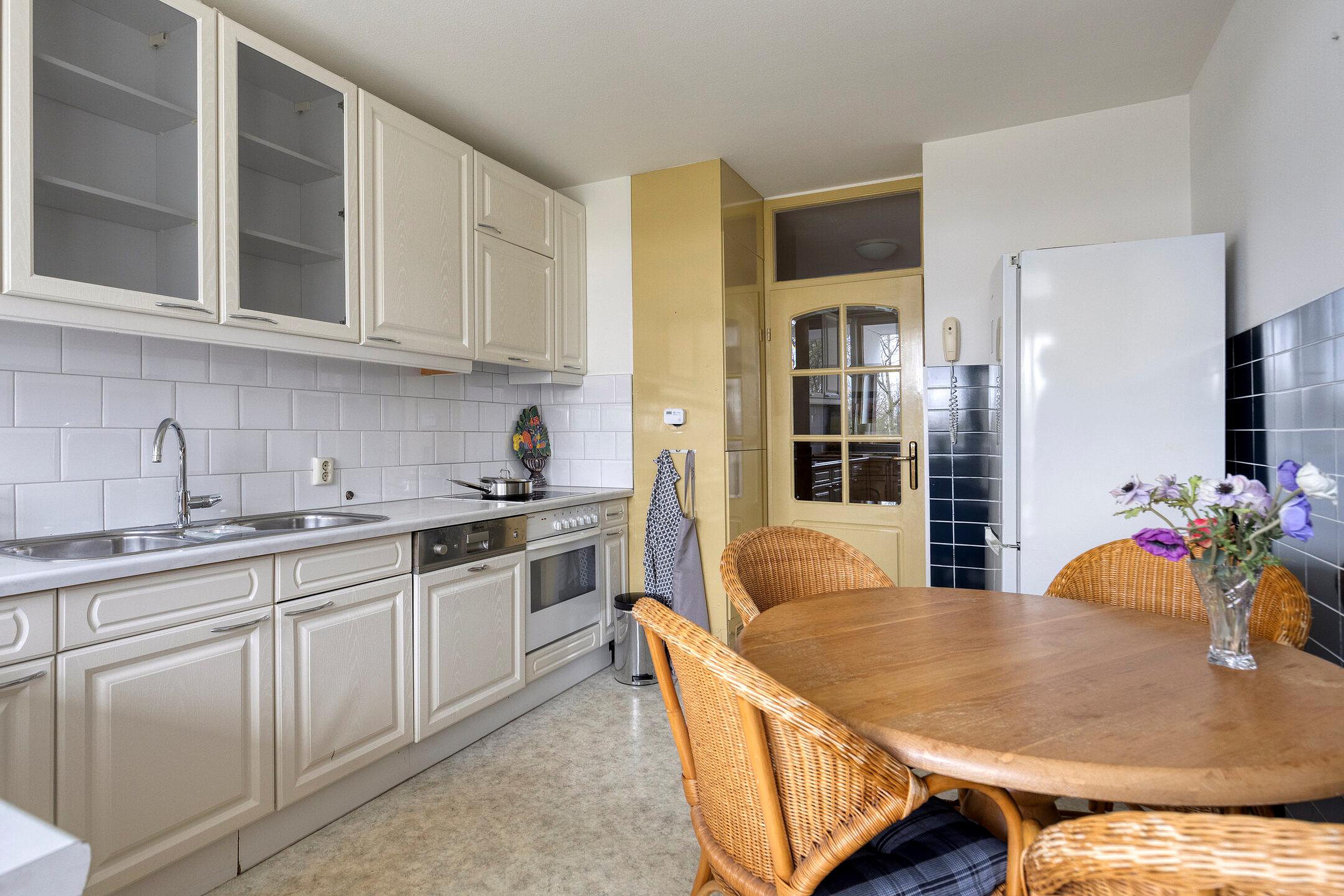 De keuken aan de achterzijde van het appartement heeft een fijn uitzicht op gemeente groen. Een echte woonkeuken, meer dan voldoende ruimte voor een eettafel.