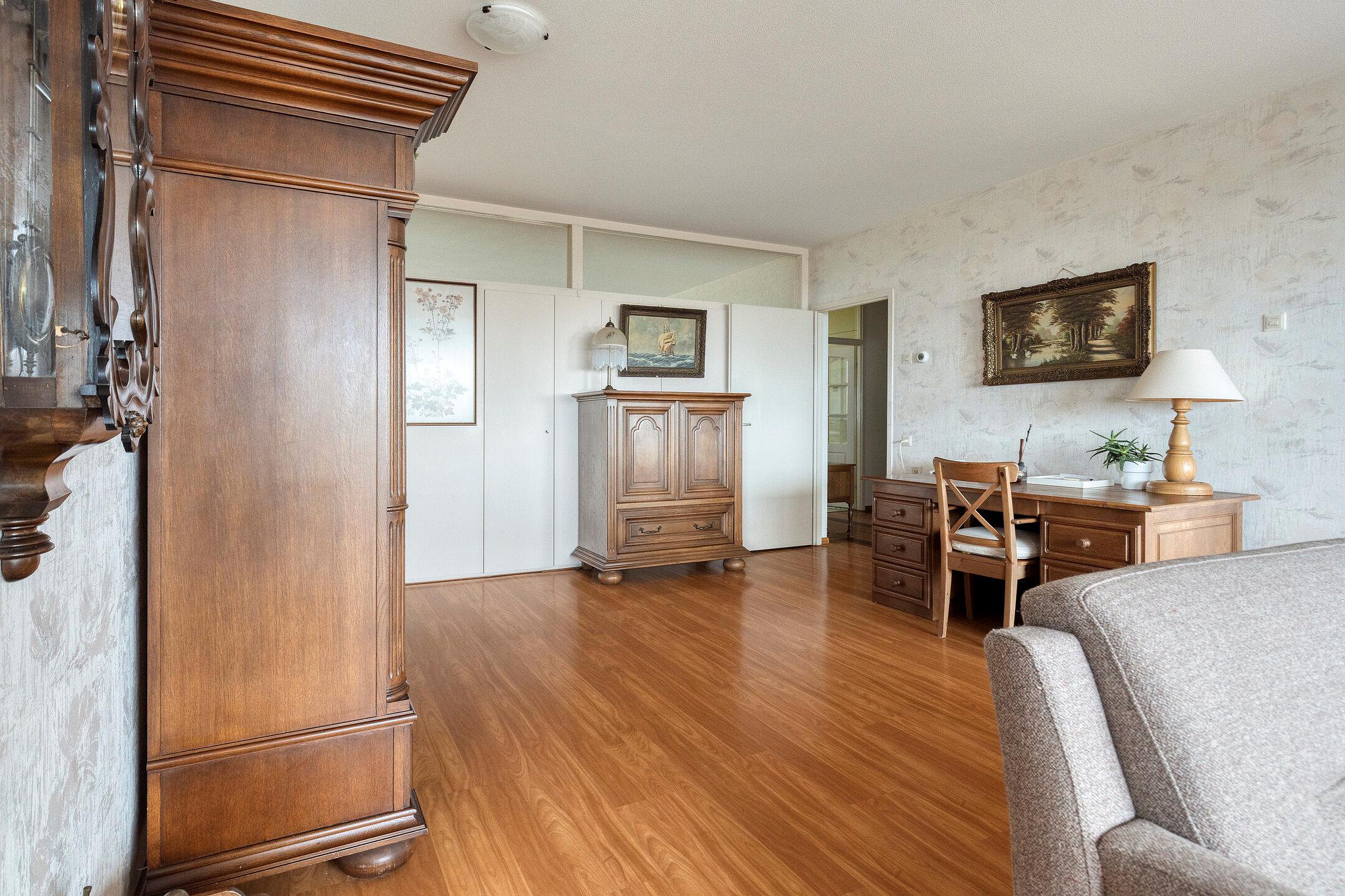 Vanuit de hal betreedt u de zeer ruime en lichte woonkamer welke zich aan de zijde van het water bevindt, waardoor een schitterend uitzicht, dit verveelt nooit! Doordat twee slaapkamers bij de woonkamer zijn getrokken, is dit een riante ruimte geworden. In de woonkamer bevindt zich tevens een vaste kastenwand.