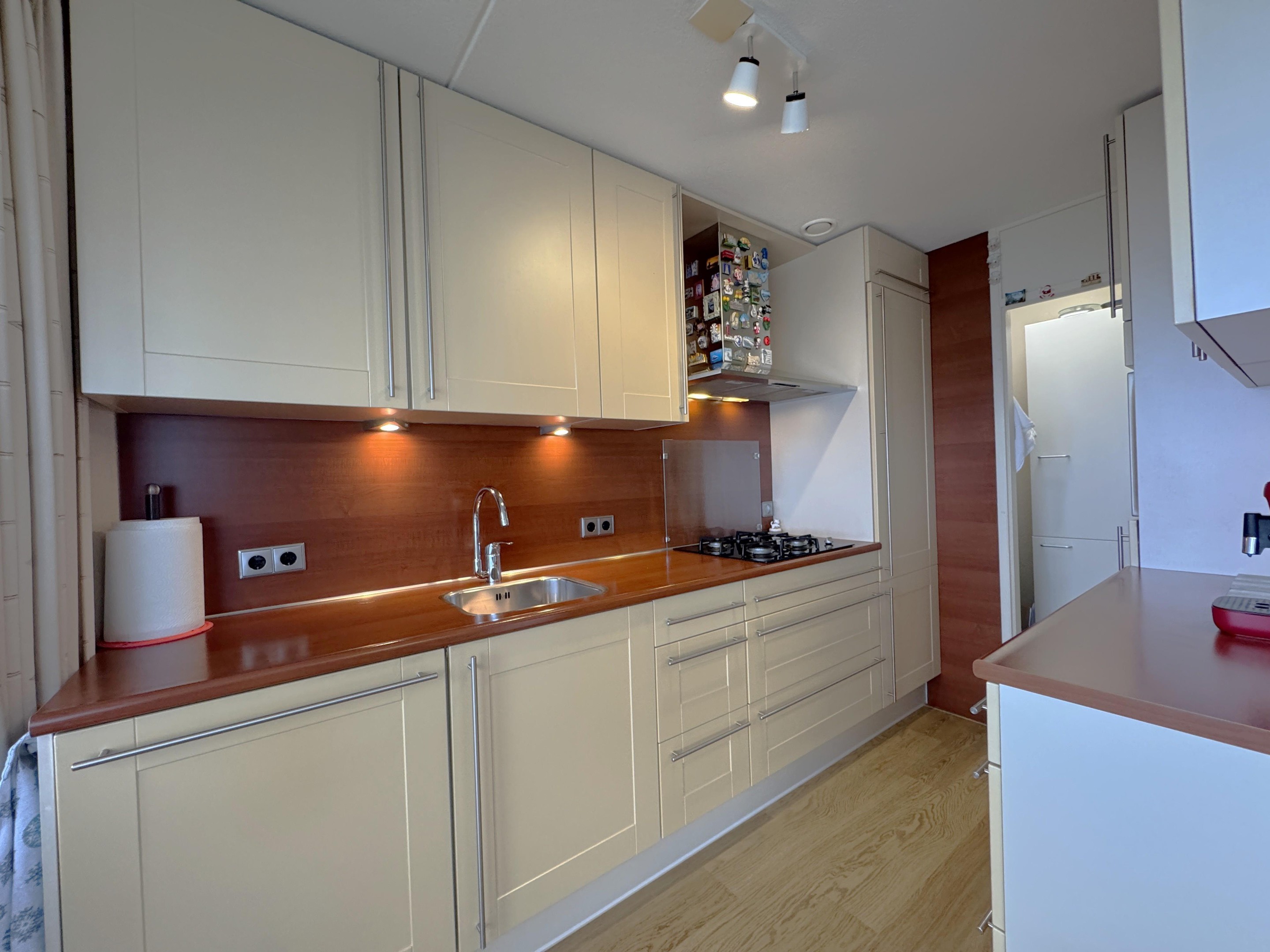 Binnenstappen voelt hier direct goed. De ruime woonkamer met grote raampartijen zorgt voor een zee aan licht én een panoramisch vergezicht dat nooit verveelt. De halfopen keuken is praktisch ingericht met diverse inbouwapparatuur en heeft aansluitend nog een handige berging. Vanuit de keuken wandel je zo het balkon op voor een kop koffie in de zon — met uitzicht waar menig vakantieganger jaloers op zou zijn.