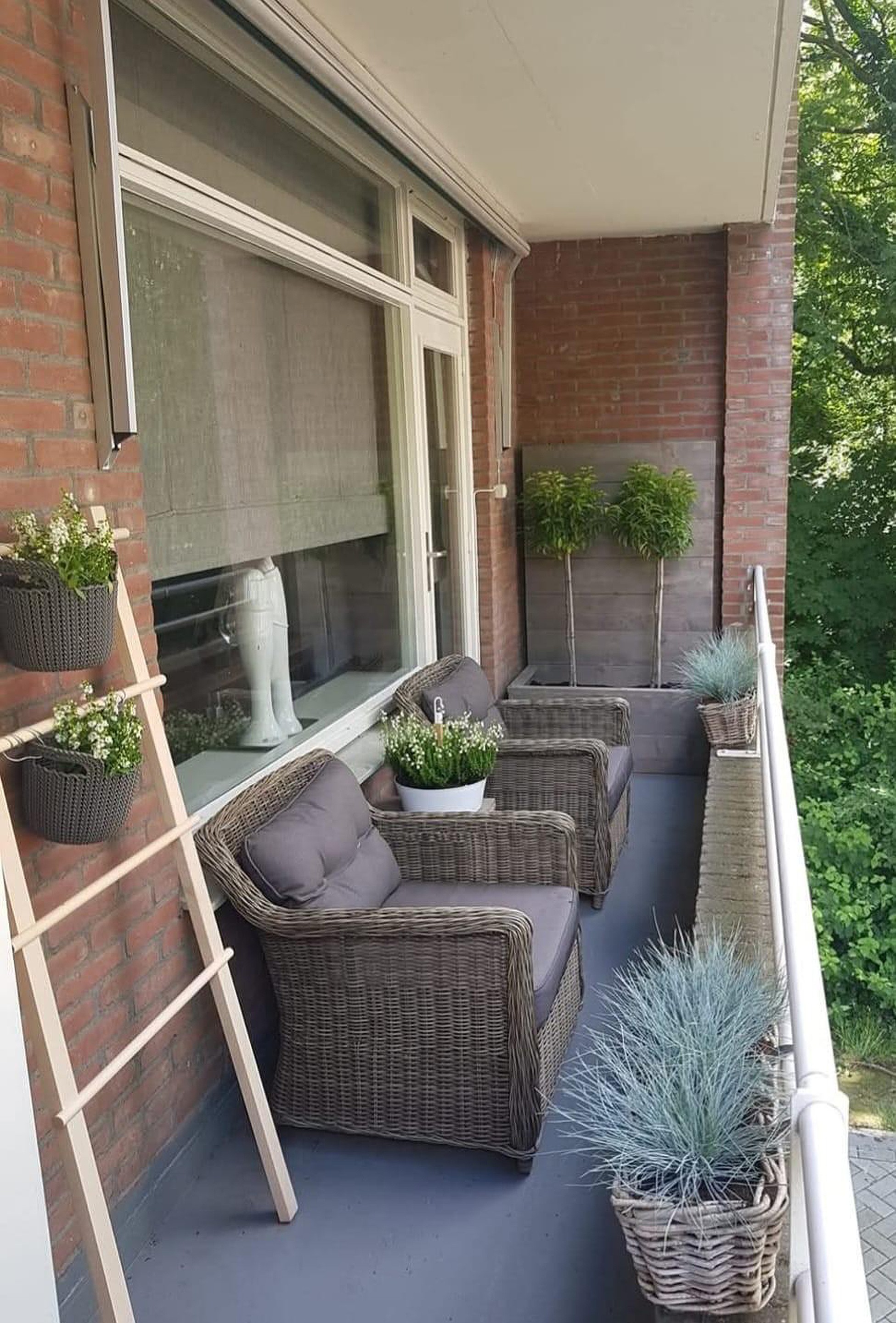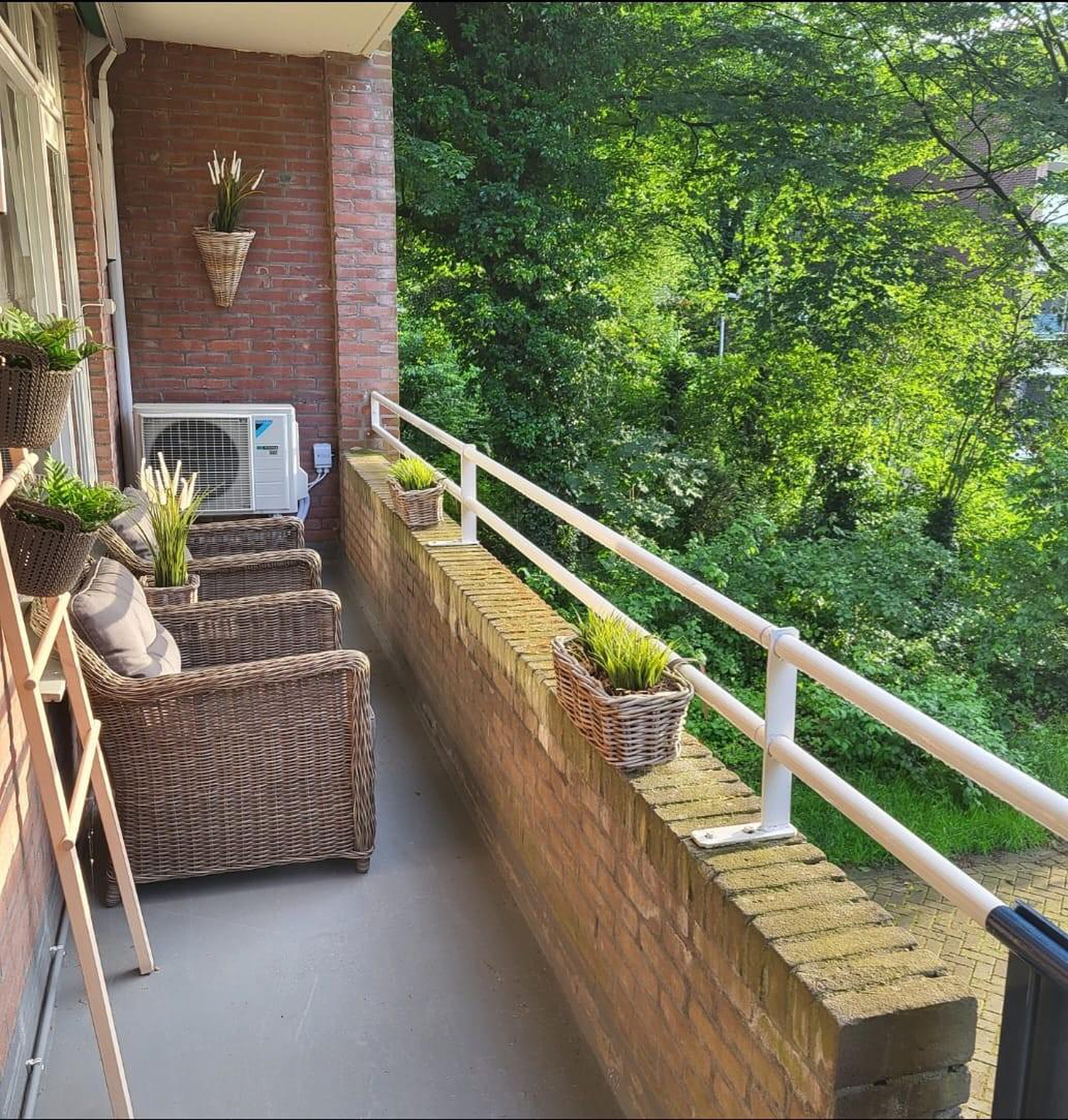 Vanuit de woonkamer en de keuken kunt u het grote balkon bereiken. Het balkon is voorzien van een elektrisch zonnescherm in donkergroene stof en een ijzeren beveiliging voor kat of hond.