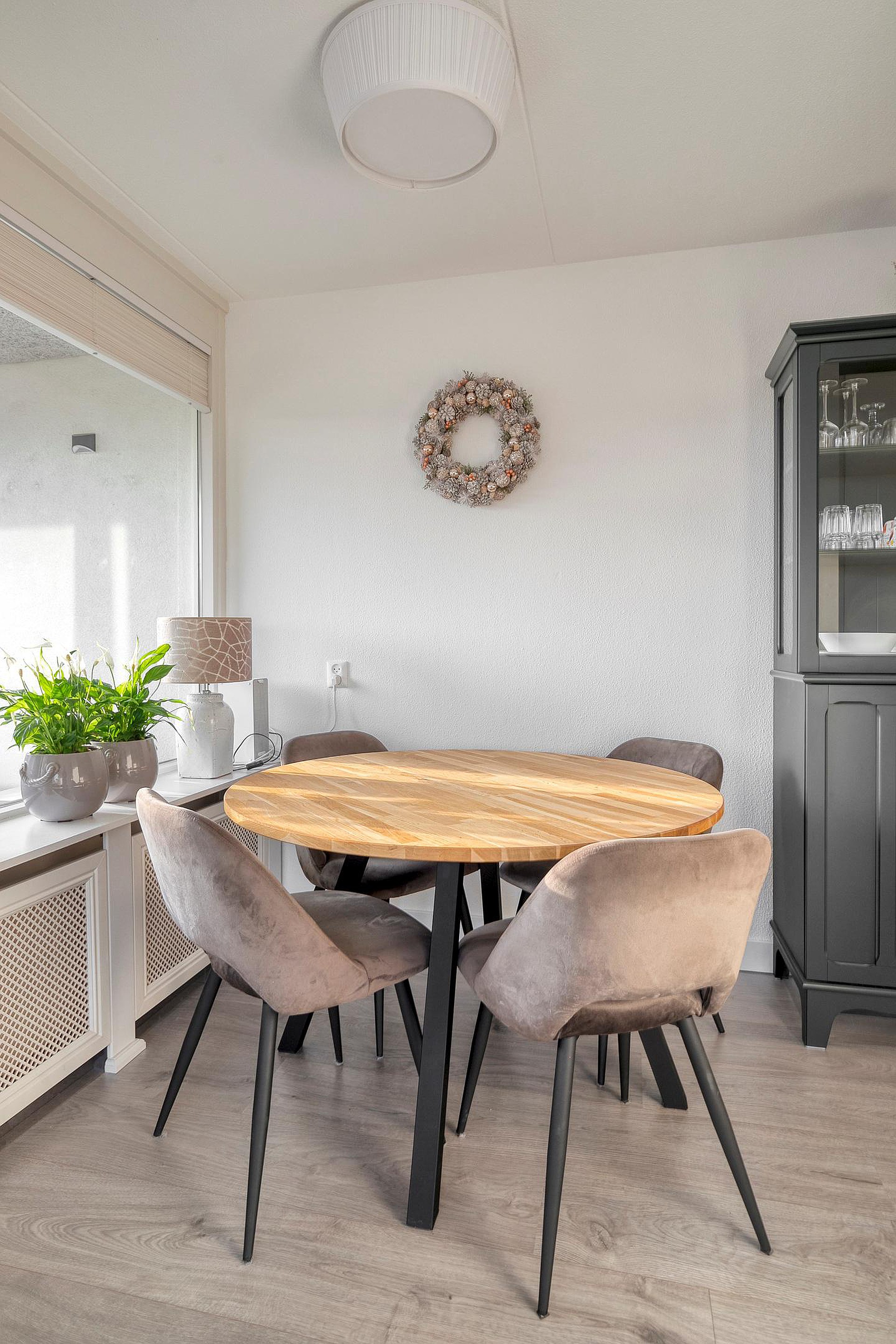 De woonkamer vormt het hart van het appartement. De grote raampartijen zorgen voor een overvloed aan licht. Door de open indeling zijn er volop mogelijkheden om een comfortabele zithoek en een gezellige eethoek te creëren. Vanuit de woonkamer heeft u direct toegang tot het balkon, wat een fijne plek biedt om te ontspannen of gasten te ontvangen. Het geheel voelt ruim en uitnodigend aan.