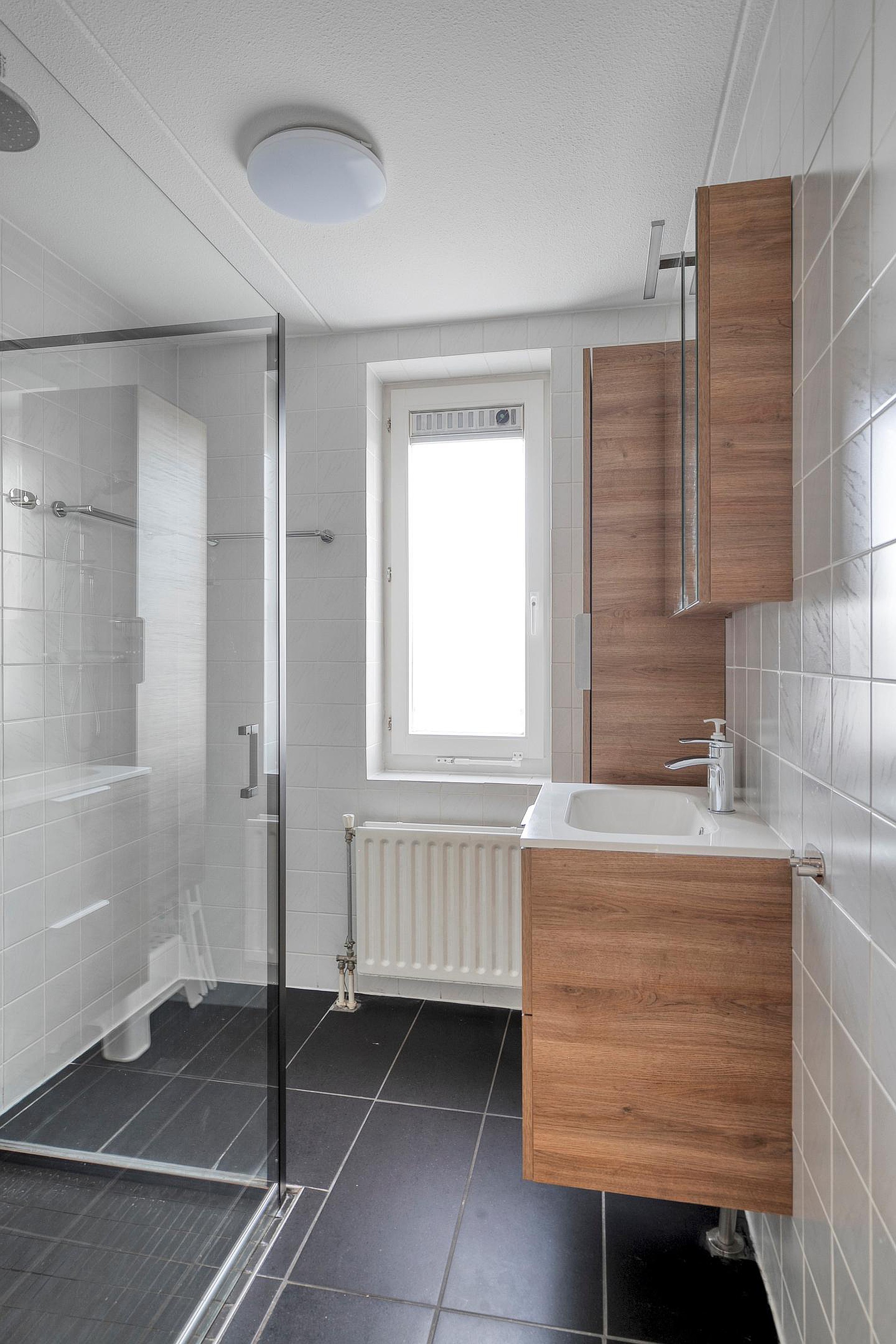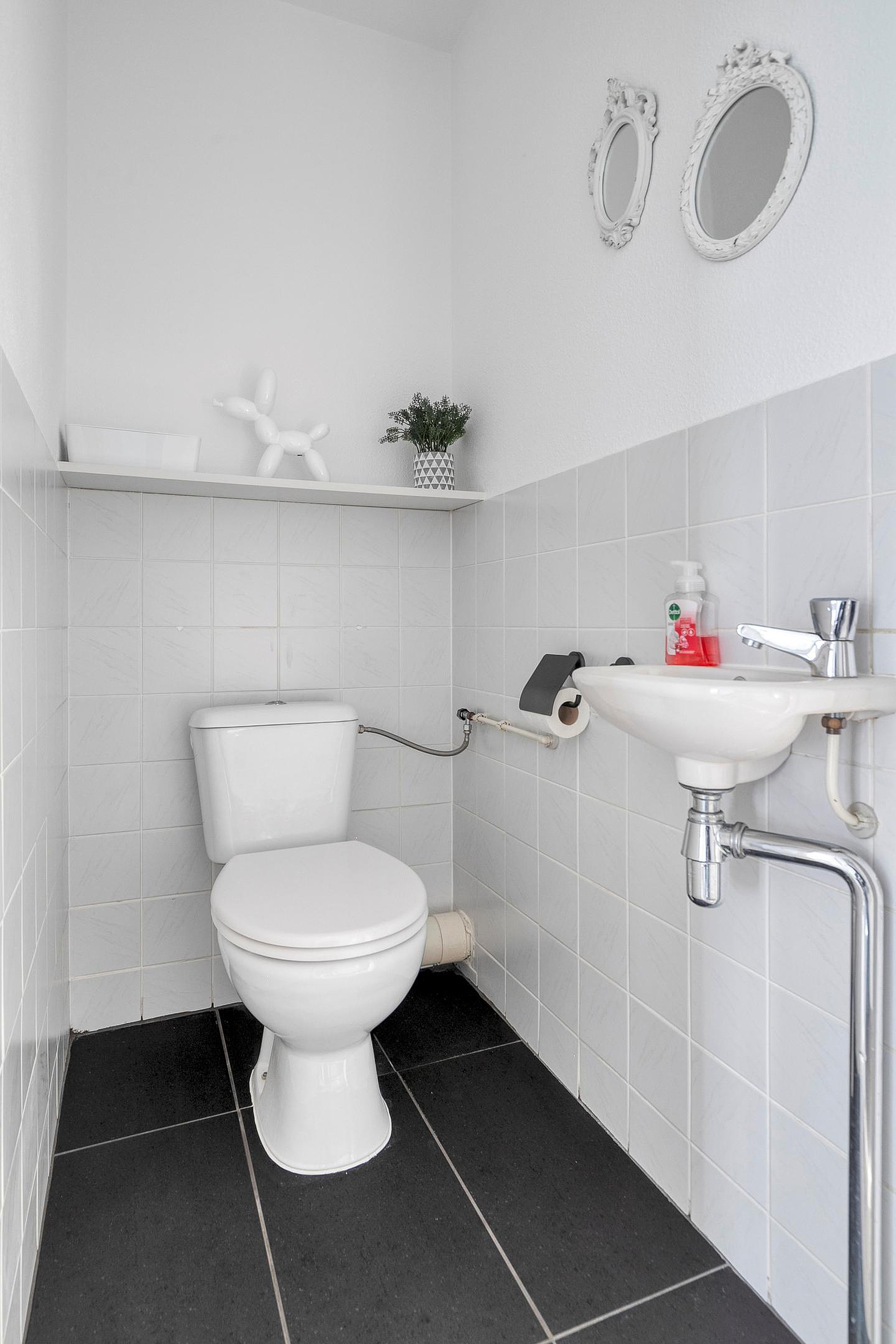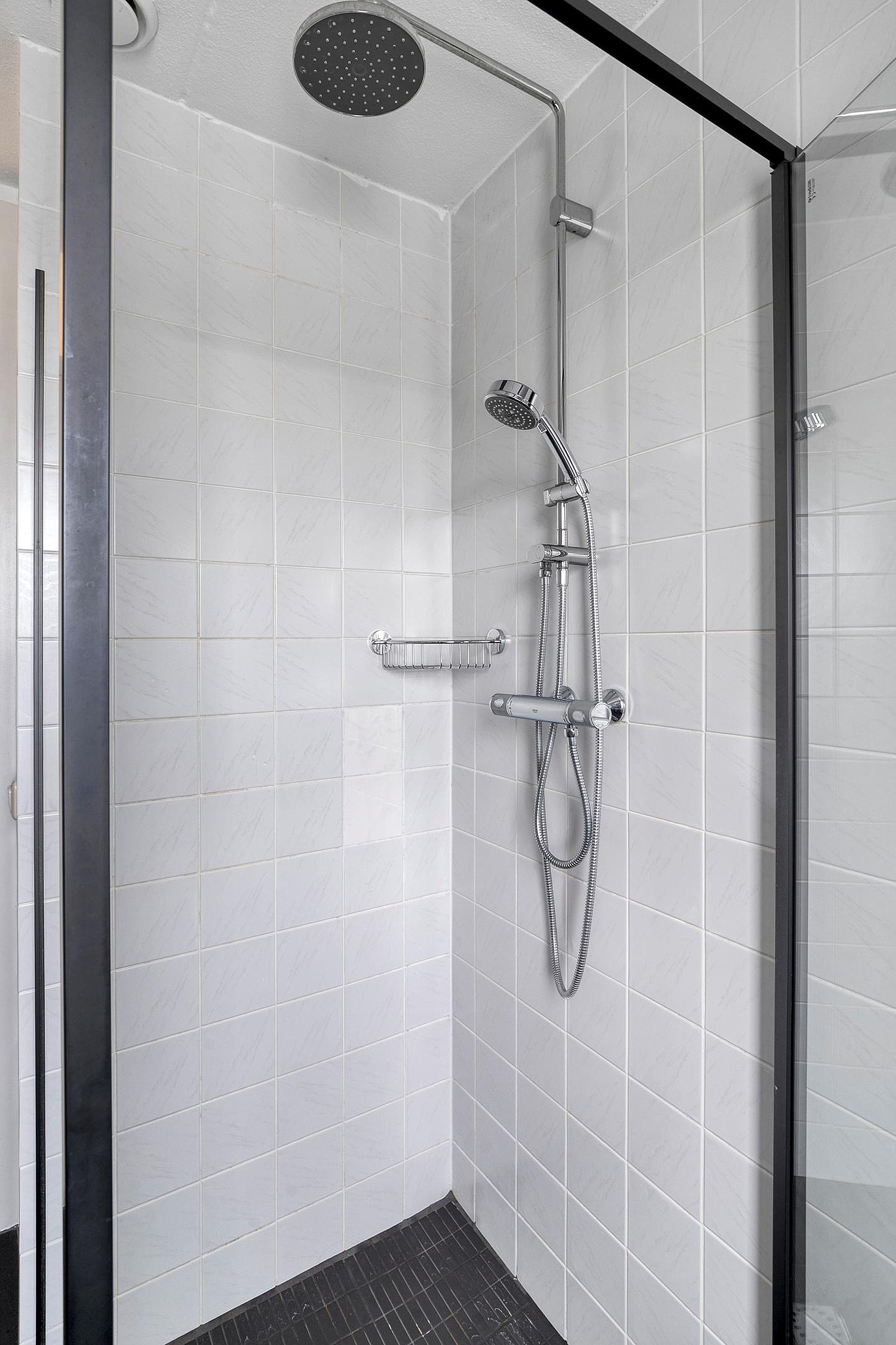 De volledig betegelde badkamer is modern en functioneel ingericht met een douche voorzien van een glazen deur, wastafel met spiegel en opberggelegenheid. Dit maakt het een fijne plek om uw dag te beginnen of eindigen. Daarnaast is er een separaat toilet aanwezig.