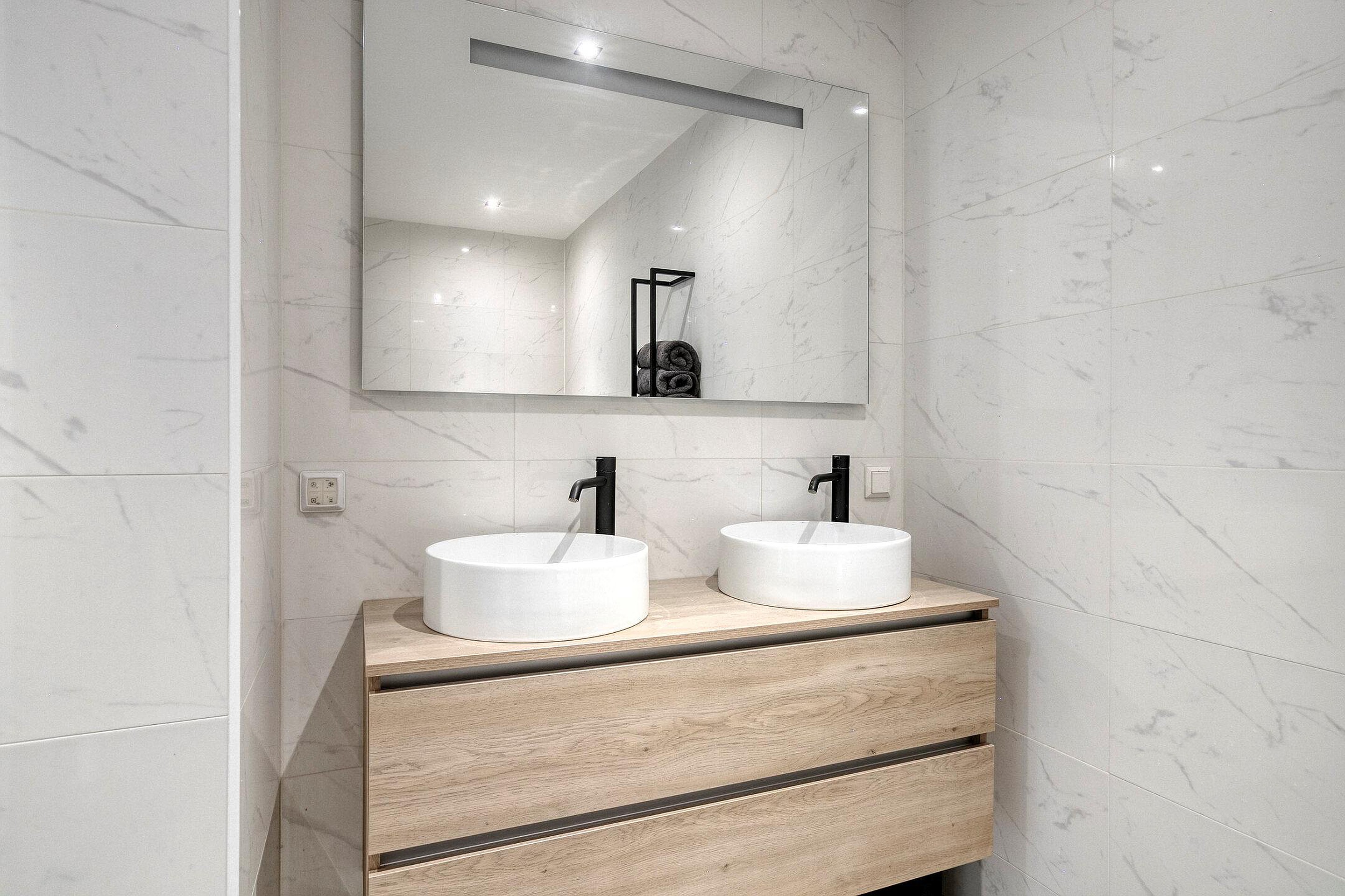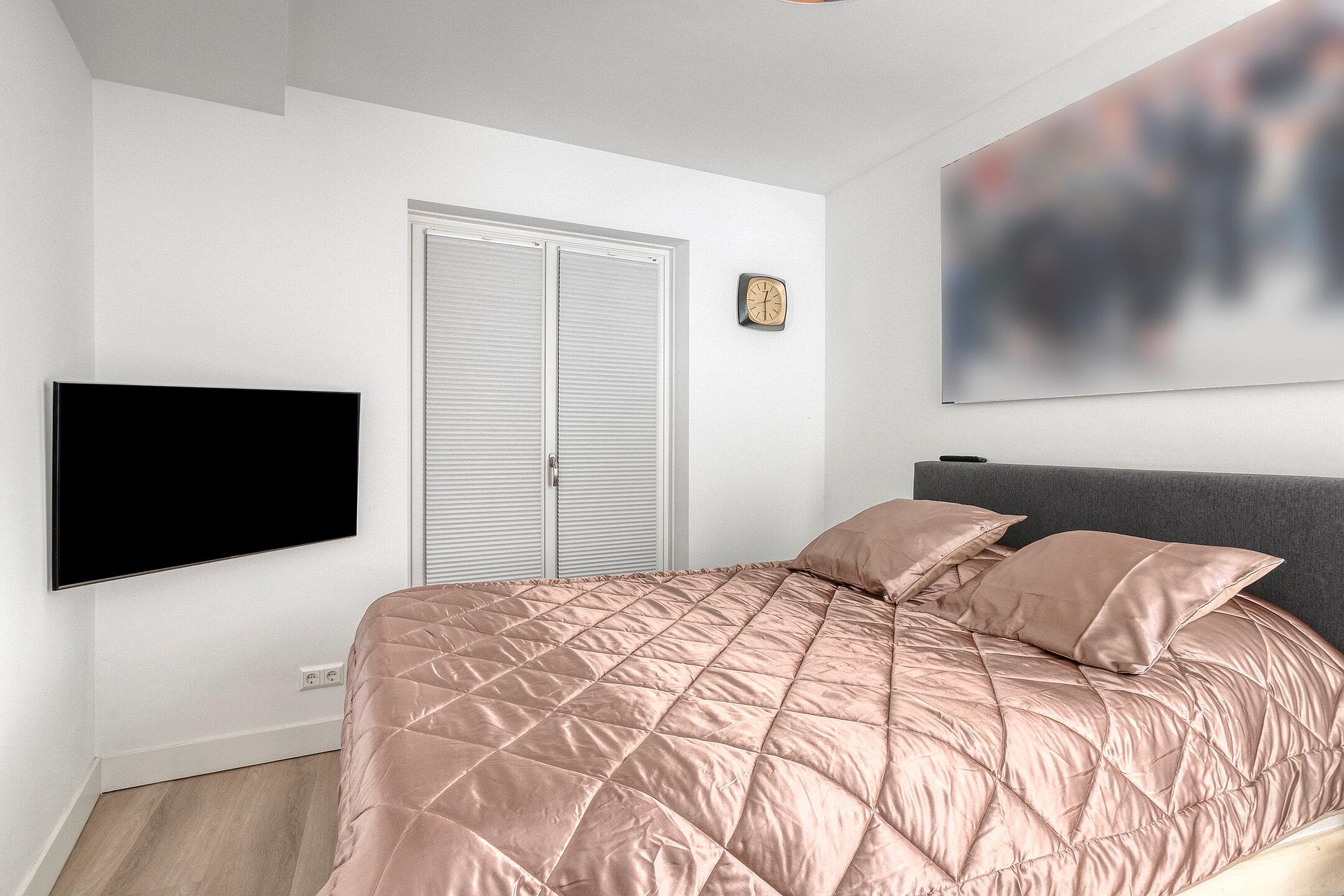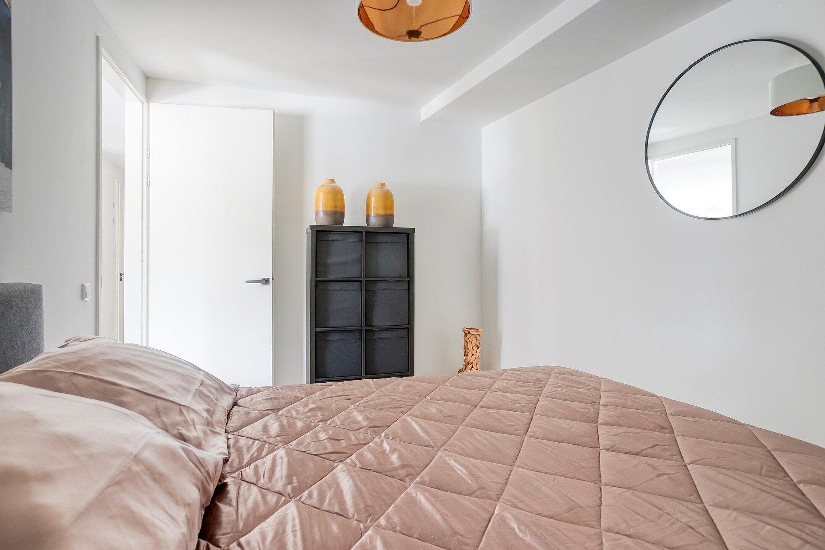 De slaapkamer is ruim en praktisch ingericht, met een openslaande deuren, die het daglicht rijkelijk laten binnenvallen. De luxueuze badkamer is modern betegeld en voorzien van een ligbad, inloop regendouche, badkamermeubel met dubbele waskom en verlichte spiegel.