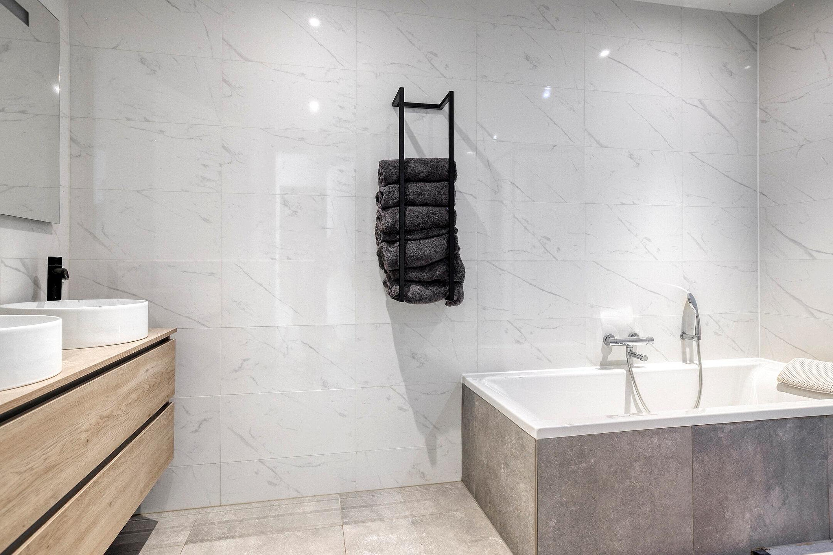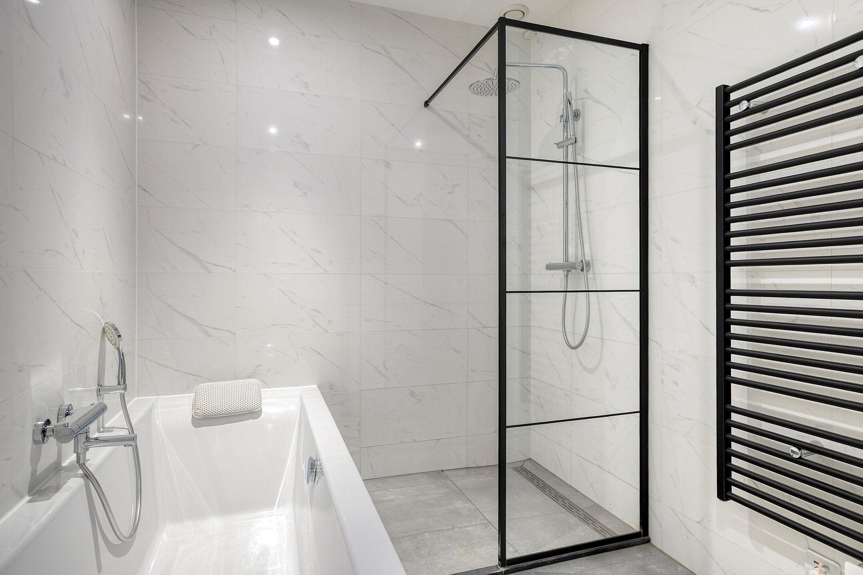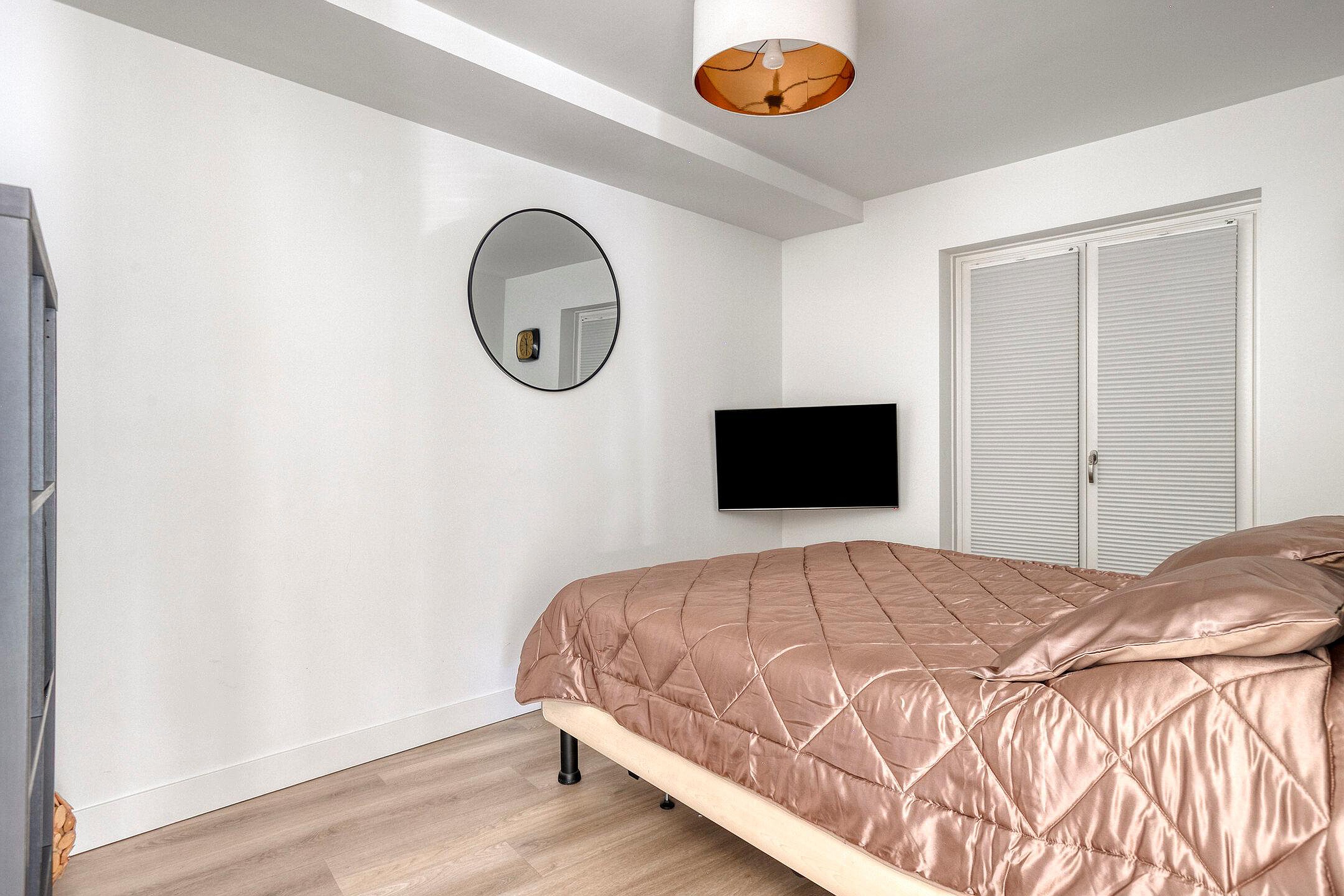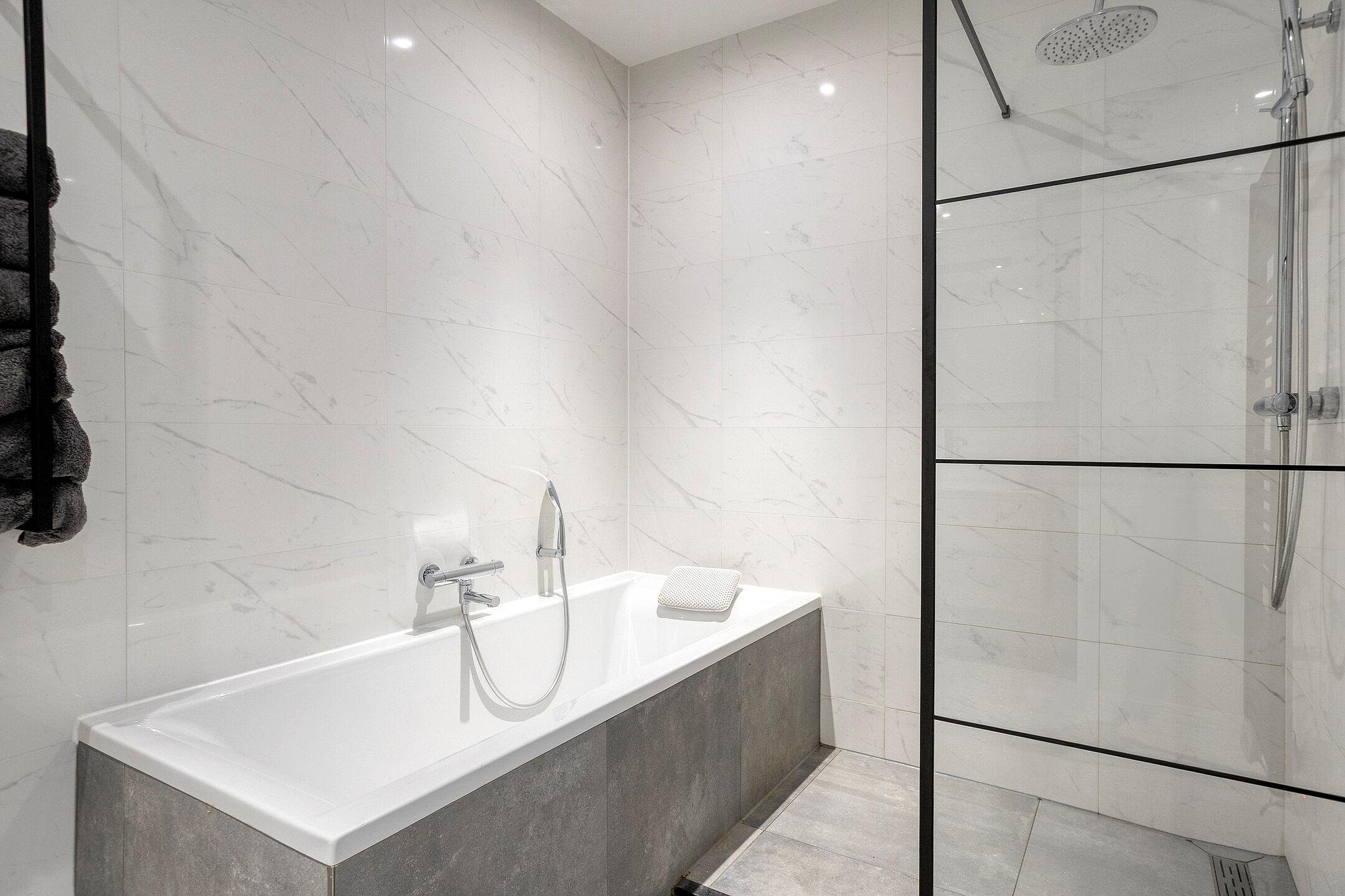 De slaapkamer is ruim en praktisch ingericht, met een openslaande deuren, die het daglicht rijkelijk laten binnenvallen. De luxueuze badkamer is modern betegeld en voorzien van een ligbad, inloop regendouche, badkamermeubel met dubbele waskom en verlichte spiegel.