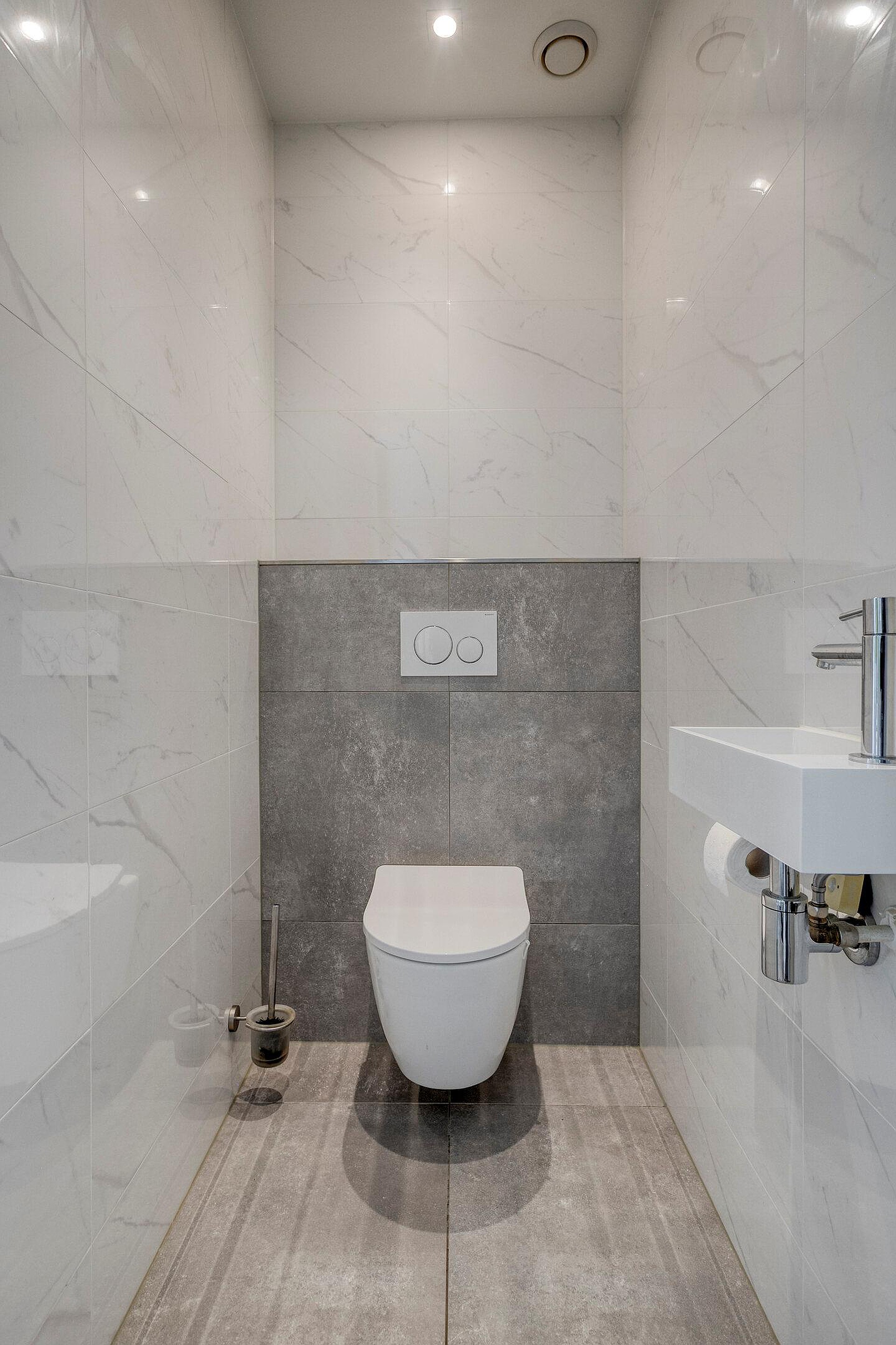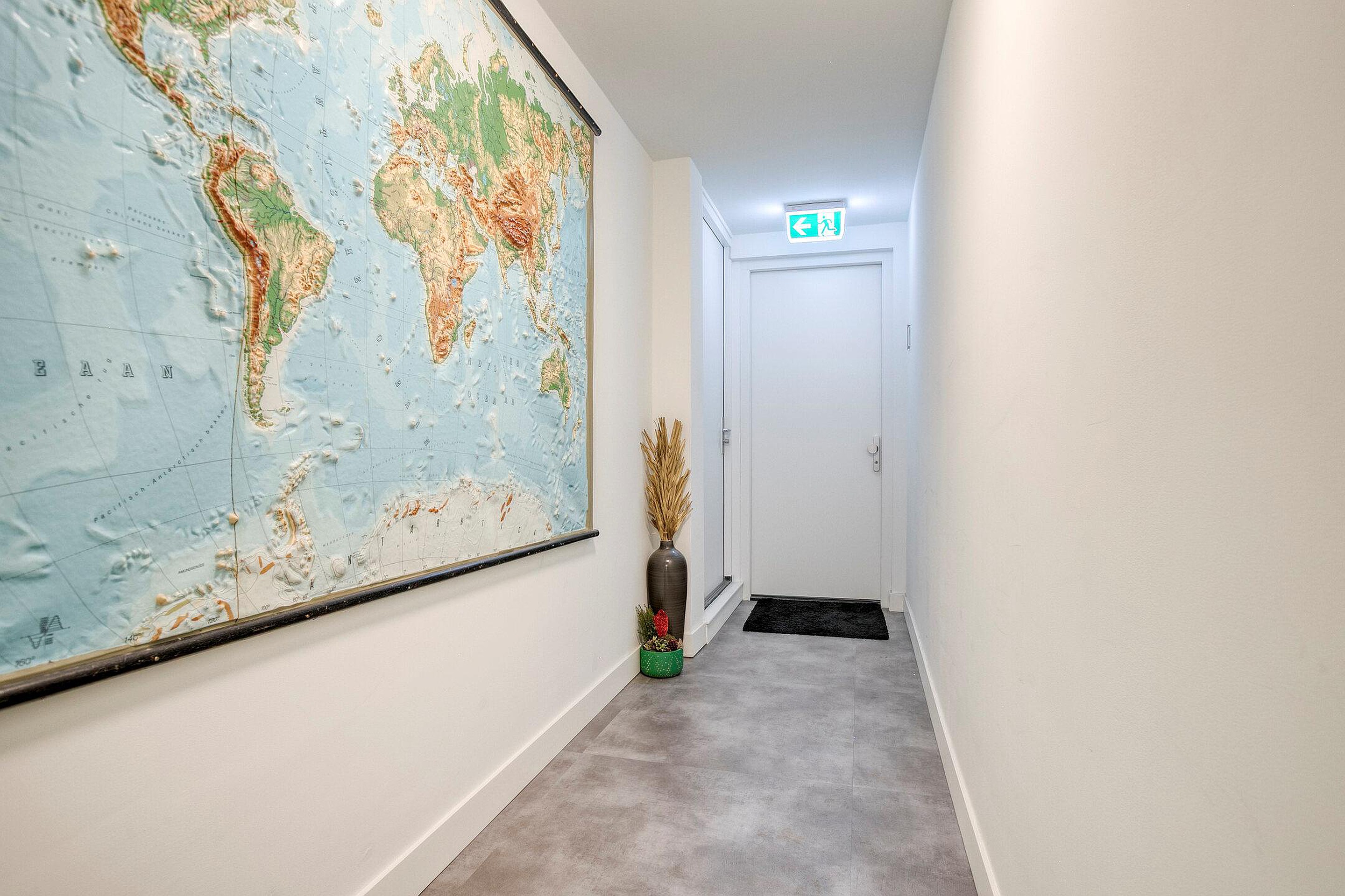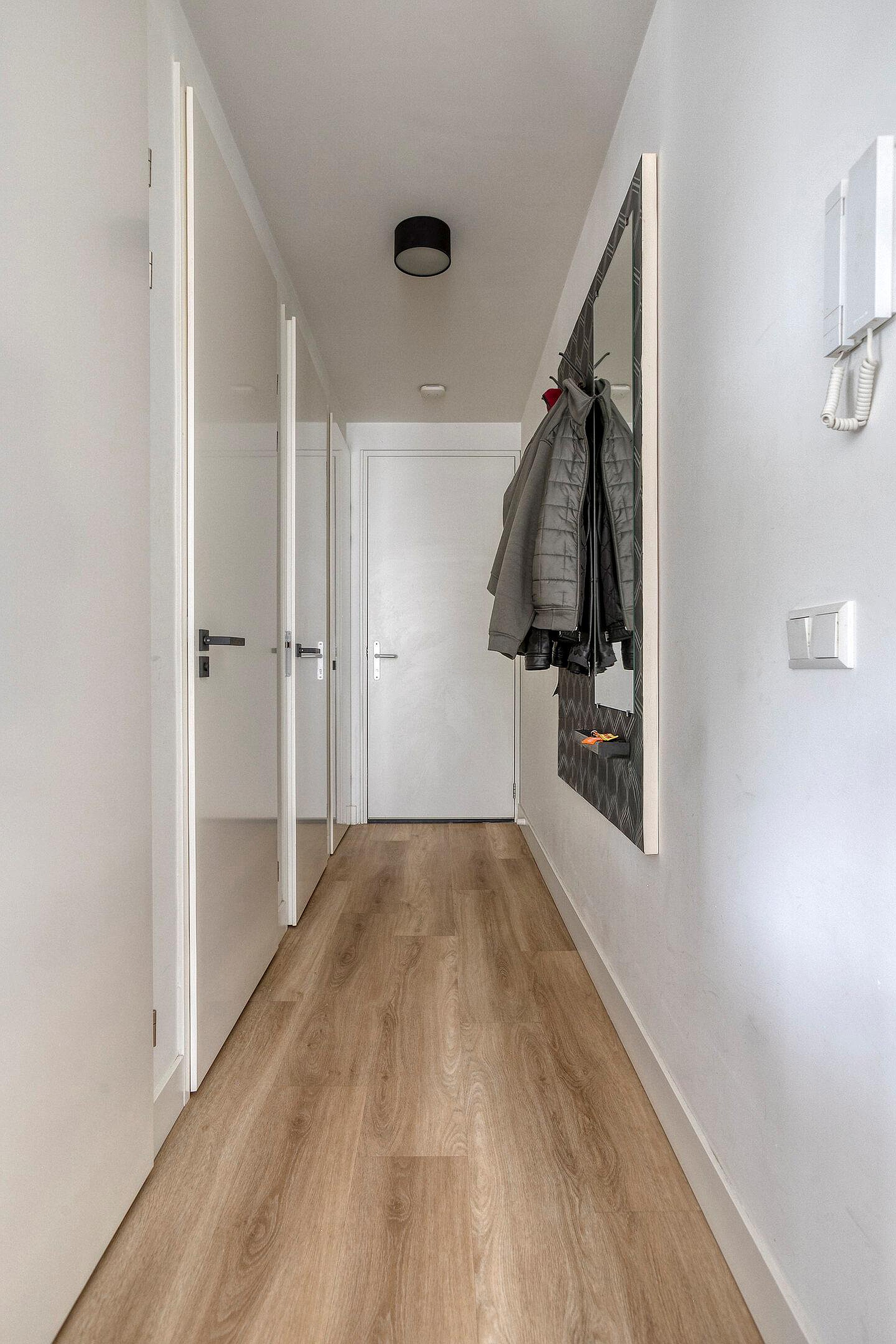 Wanneer u het appartement binnenstapt, komt u in een diepe hal die toegang geeft tot de moderne toiletruimte, de badkamer, een bergkast met witgoedaansluitingen, de meterkast en de living.