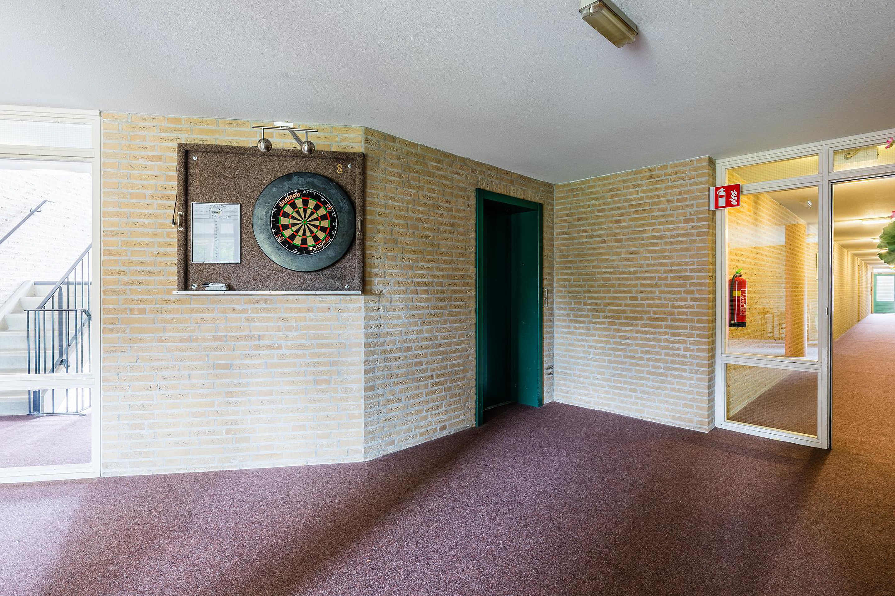 Centrale entree met brievenbussentableau en videofooninstallatie. De ontvangsthal geeft toegang tot het trappenhuis, de liftinstallatie en het achtergelegen, afgesloten parkeerterrein.