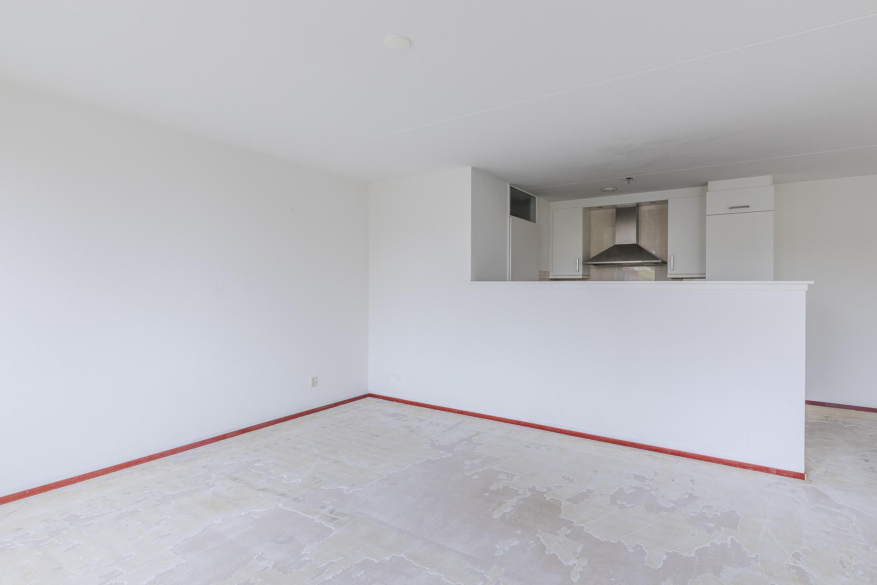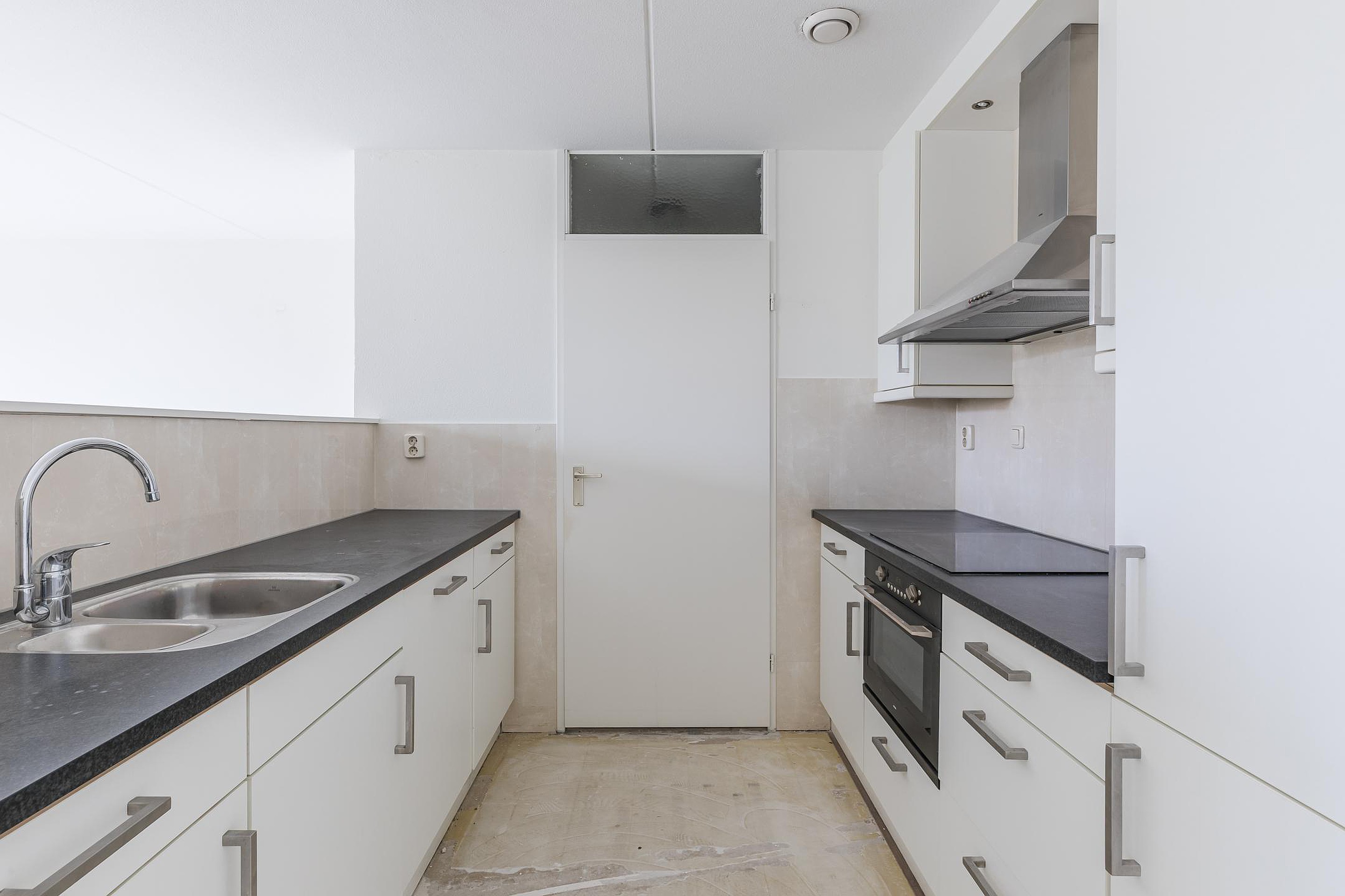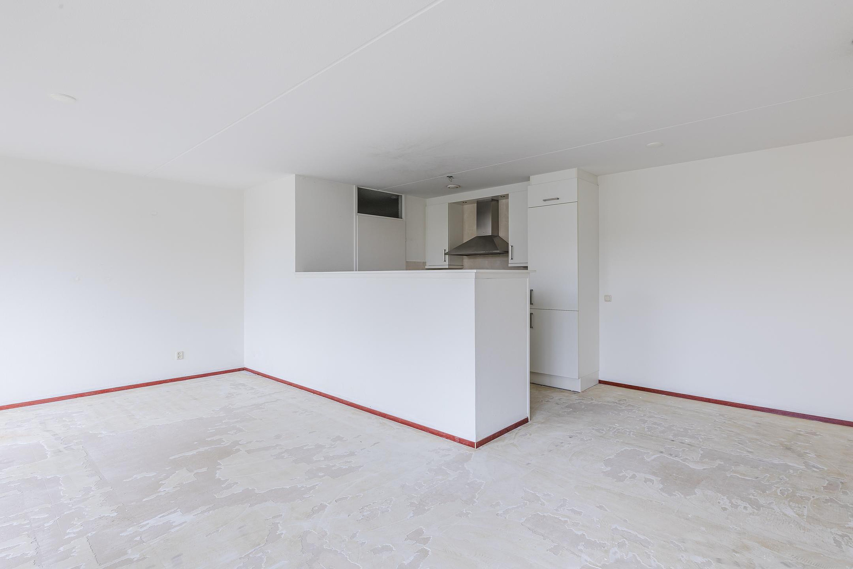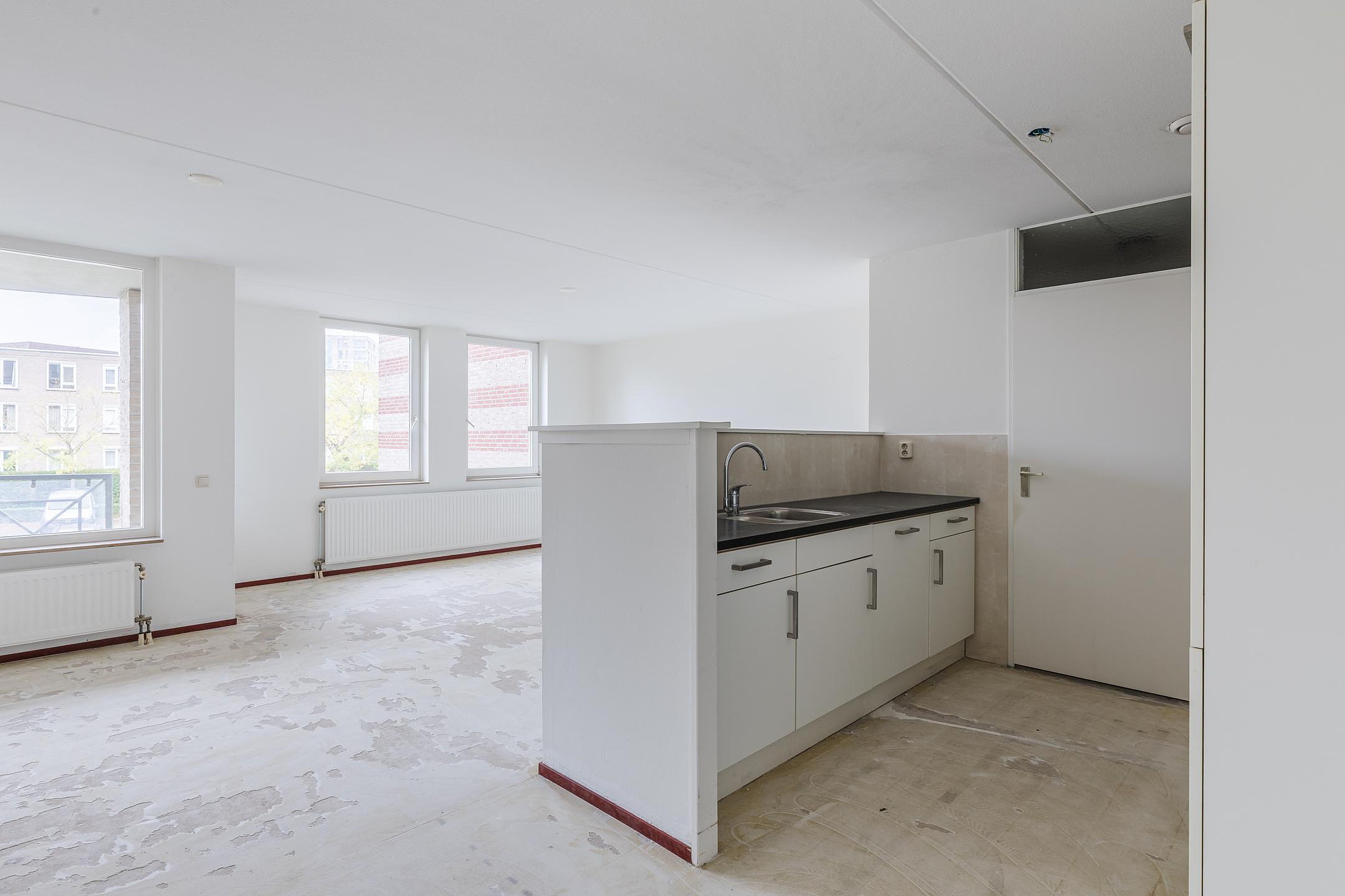 Het appartement is gelegen op de 1e verdieping en is bereikbaar middels trap en lift. De entree/ hal geeft toegang tot de ruime, lichte woonkamer van ca. 38m2. De woonkamer is praktisch van opzet en heeft grote raampartijen. Middels een loopdeur is er toegang tot het balkon. De open keuken is ingericht met een inductiekookplaat, afzuigkap, combi-oven, vaatwasser, koelkast en diepvries. Vanuit de keuken is er toegang tot de bijkeuken. Hier bevinden zich de witgoedaansluitingen.