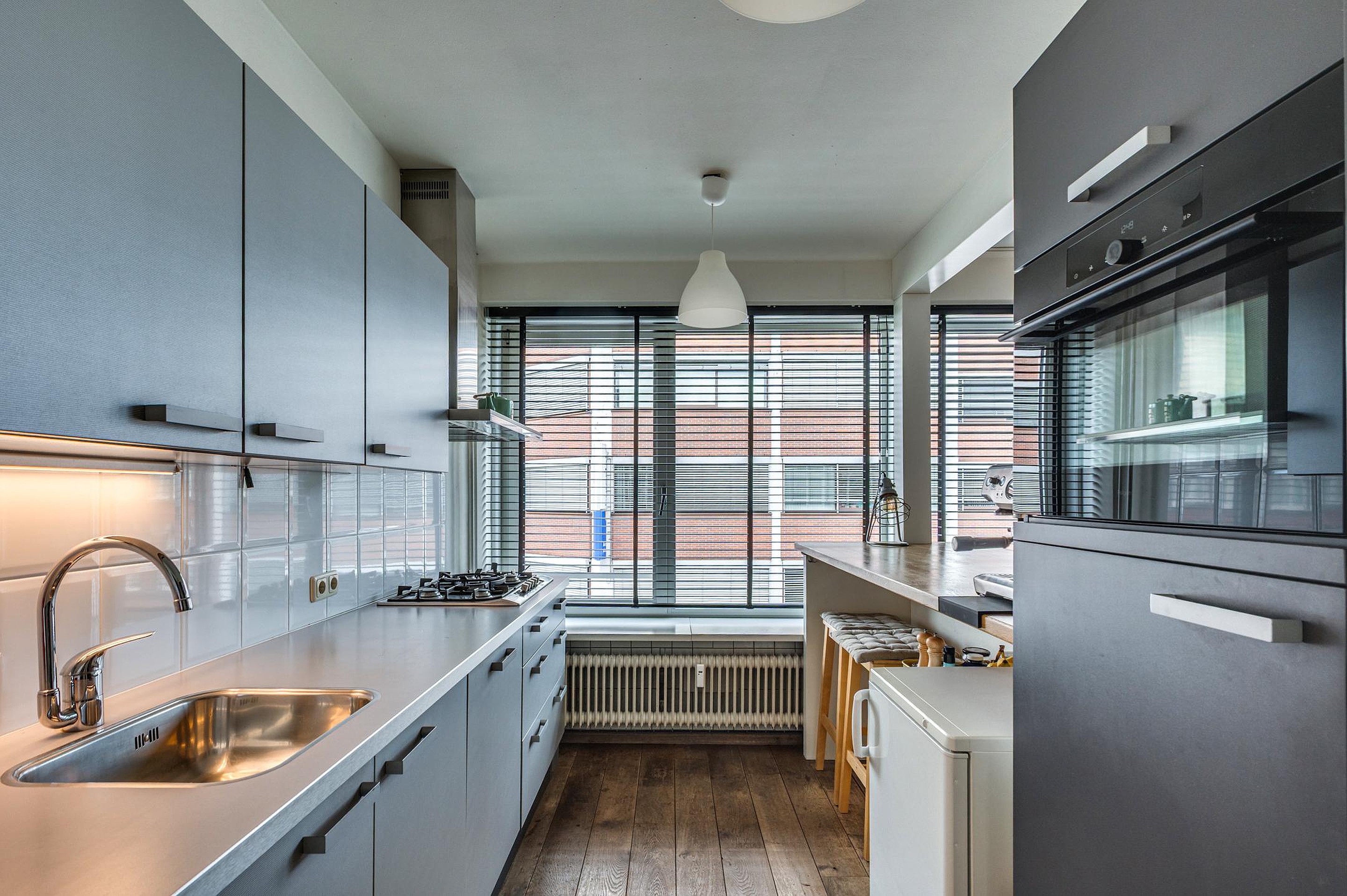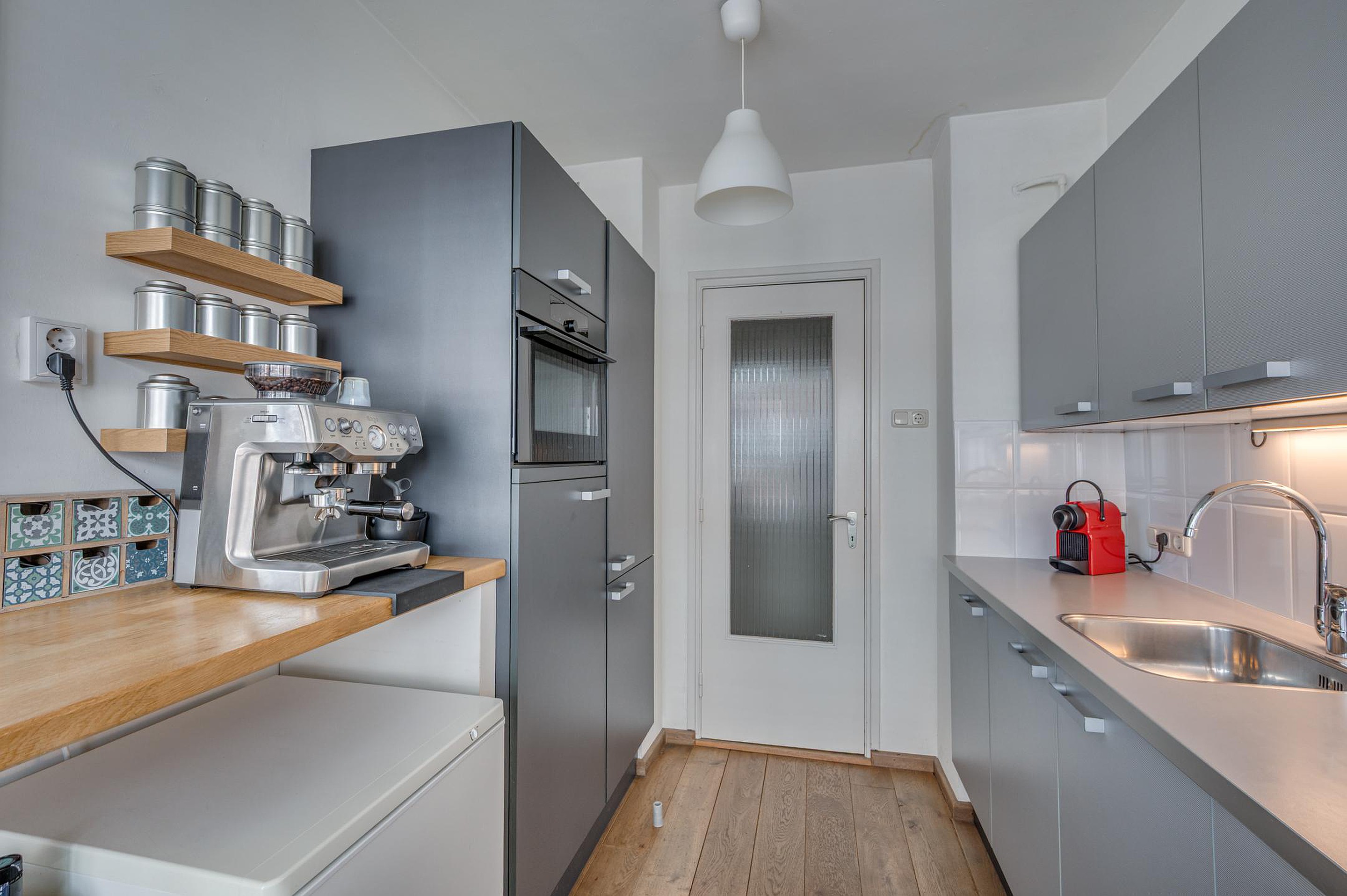 De gesloten keuken (9m2) is praktisch ingericht en voorzien van een complete inbouwcombinatie, waaronder een koelkast, diepvries, gaskookplaat, afzuigkap, combimagnetron en vaatwasser.