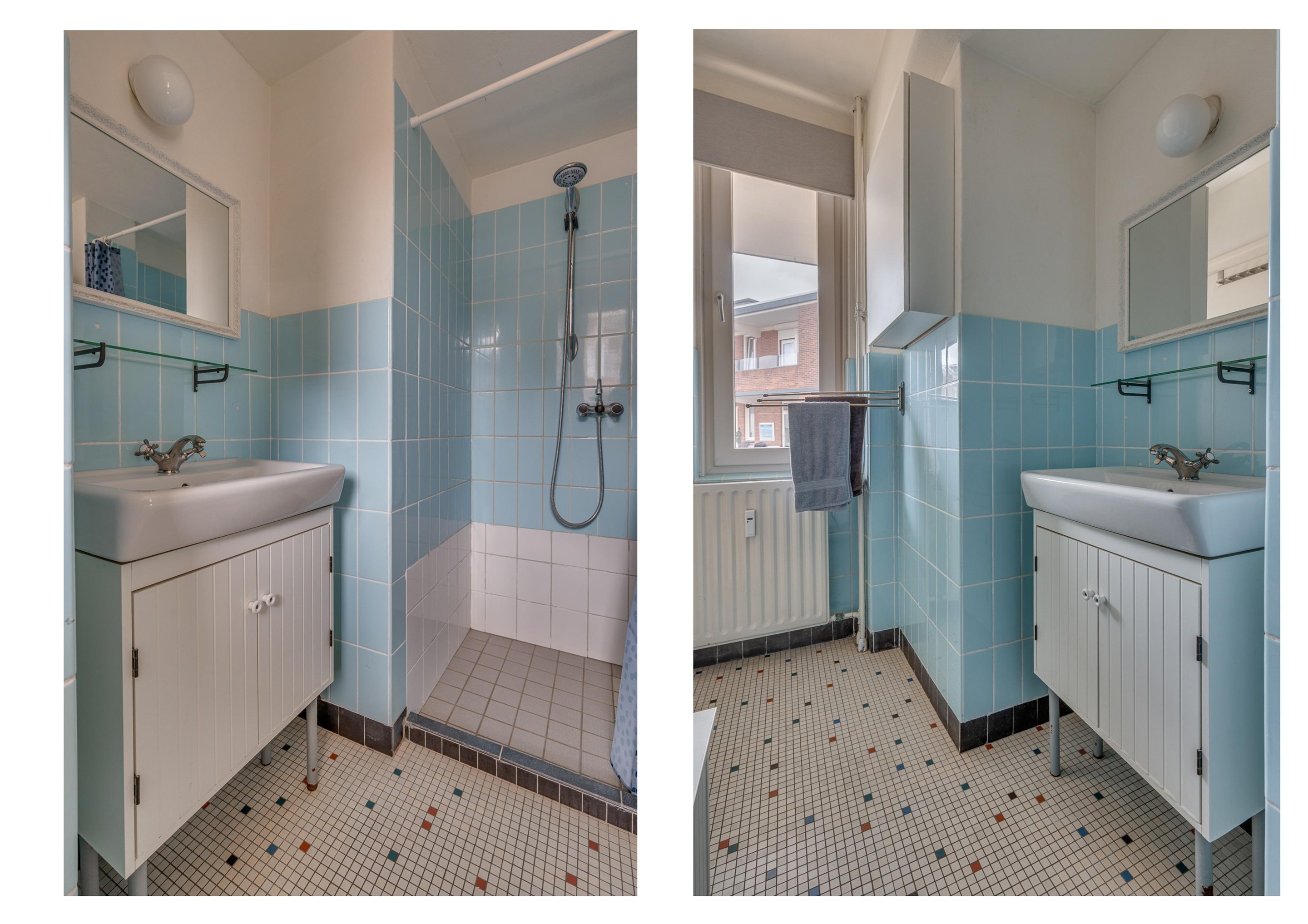 - Badkamer, netjes fris betegeld met douche en wastafelmeubel.