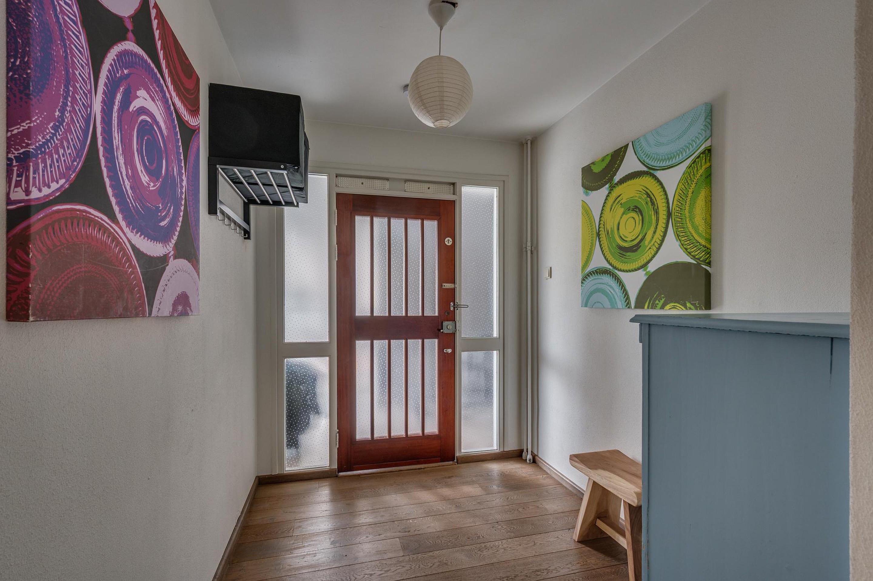 Via de sfeervolle entree bereikt u de hal, die toegang biedt tot alle vertrekken. Het toilet is netjes betegeld en voorzien van een fonteintje. De ruime en lichte woonkamer (28m2) vormt het hart van de woning en is afgewerkt met een fraaie eikenhouten vloer, wat zorgt voor een warme en uitnodigende uitstraling.