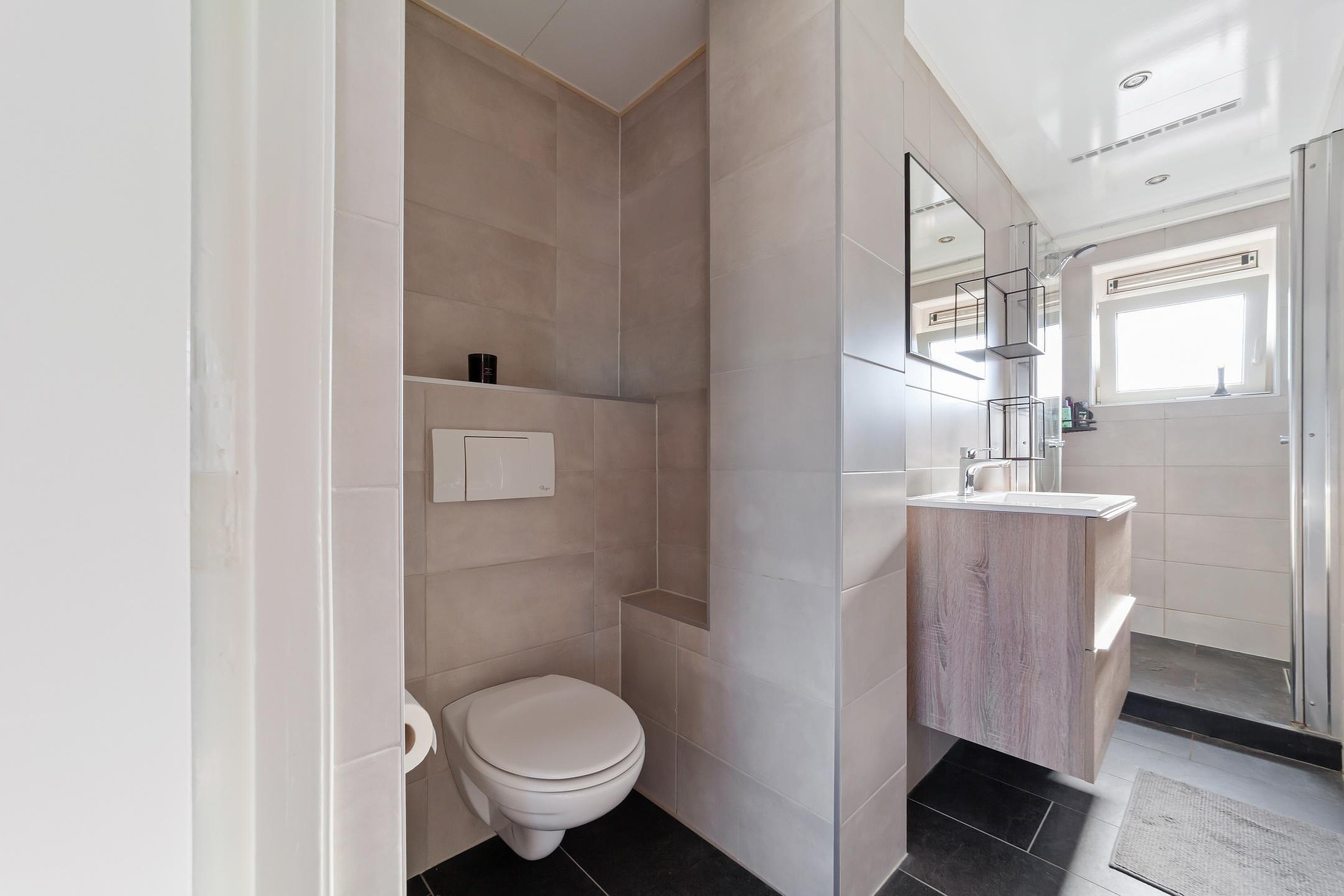 De moderne badkamer is vernieuwd in 2020 en voorzien van o.a. licht grijze wandtegels, douche, wastafelmeubel, handdoekenradiator en wandcloset.