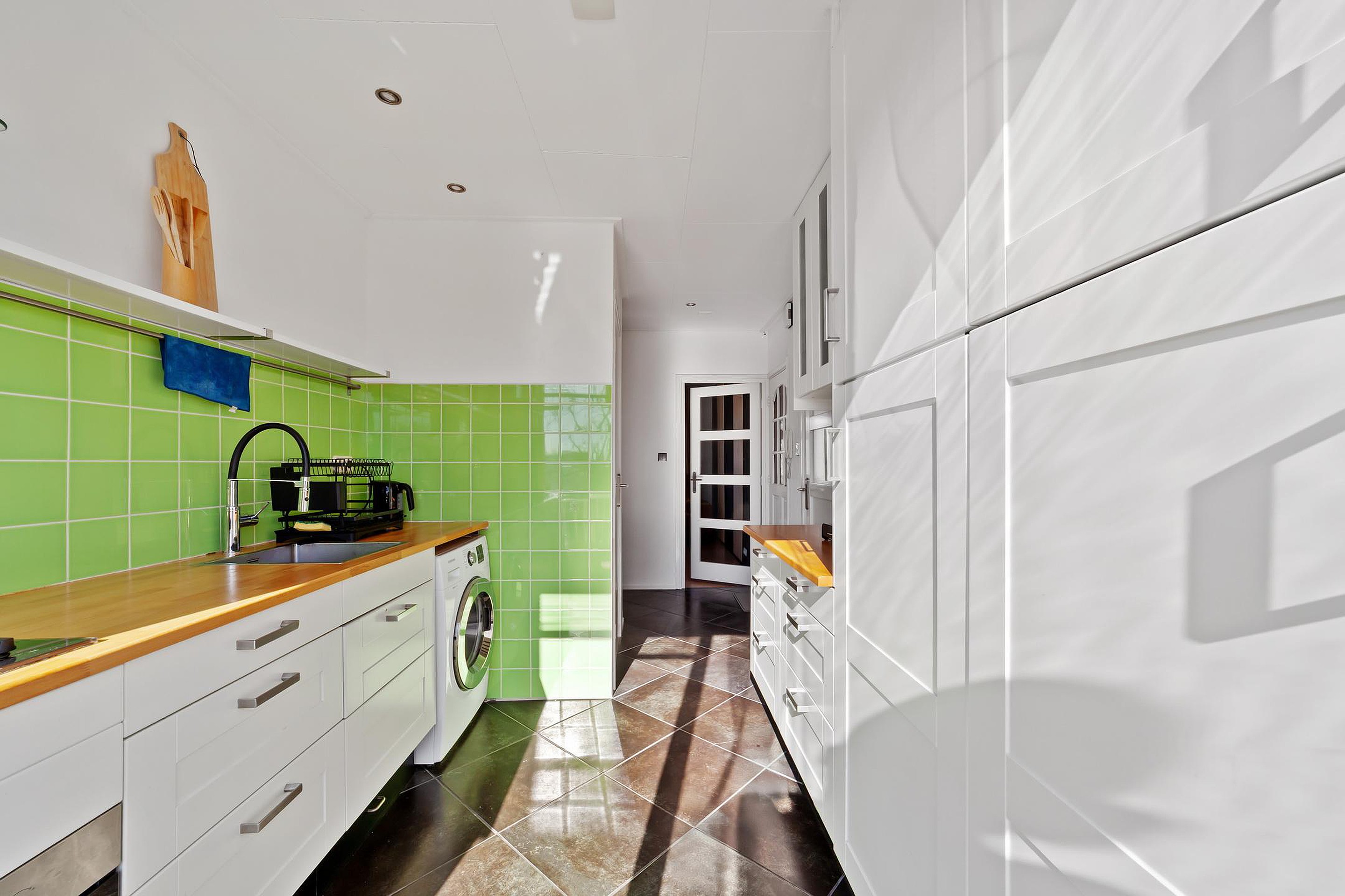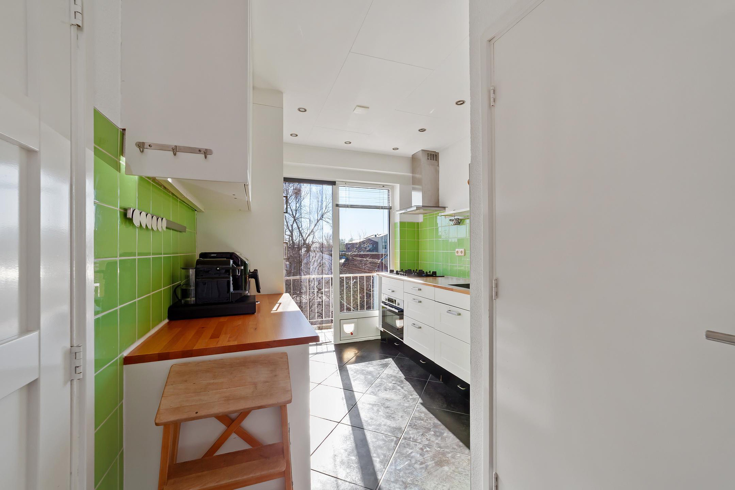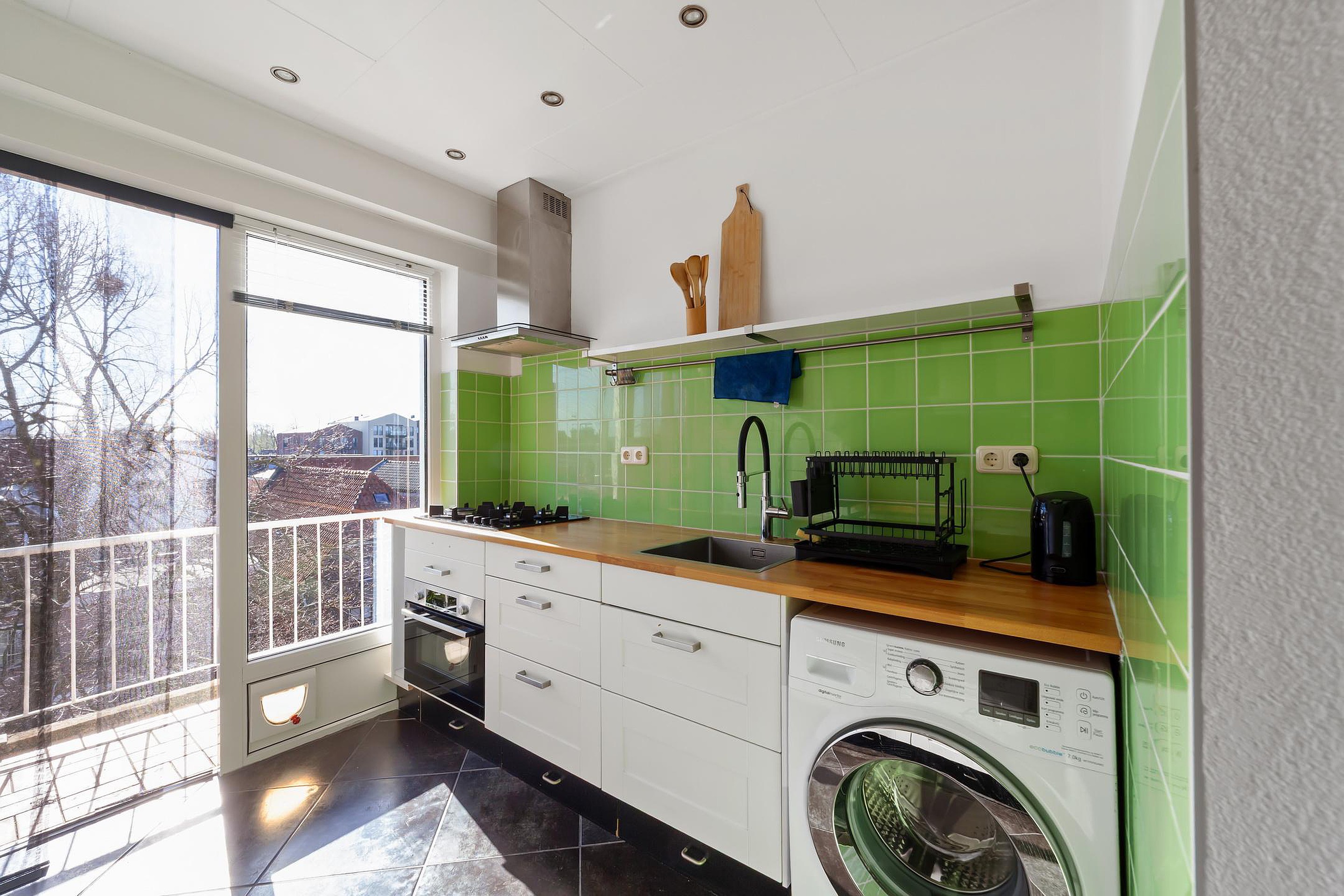 De parallel opgestelde keuken bevindt zich aan de achterzijde van de woning en is voorzien van 4-pits gaskookplaat, combi-oven, RVS-afzuigkap, koelkast, wasmachine aansluiting en opstelplaats voor de Cv-ketel. Vanuit de keuken is het balkon aan de achterzijde toegankelijk.