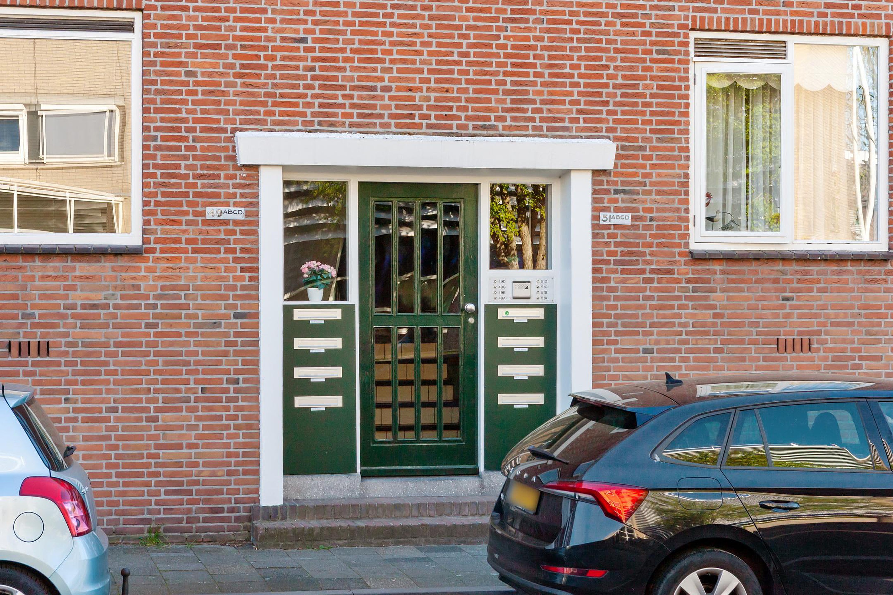 Afgesloten portiek met bellentableau met intercom en brievenbussen. Vanuit de hal is de berging in de onderbouw te bereiken.