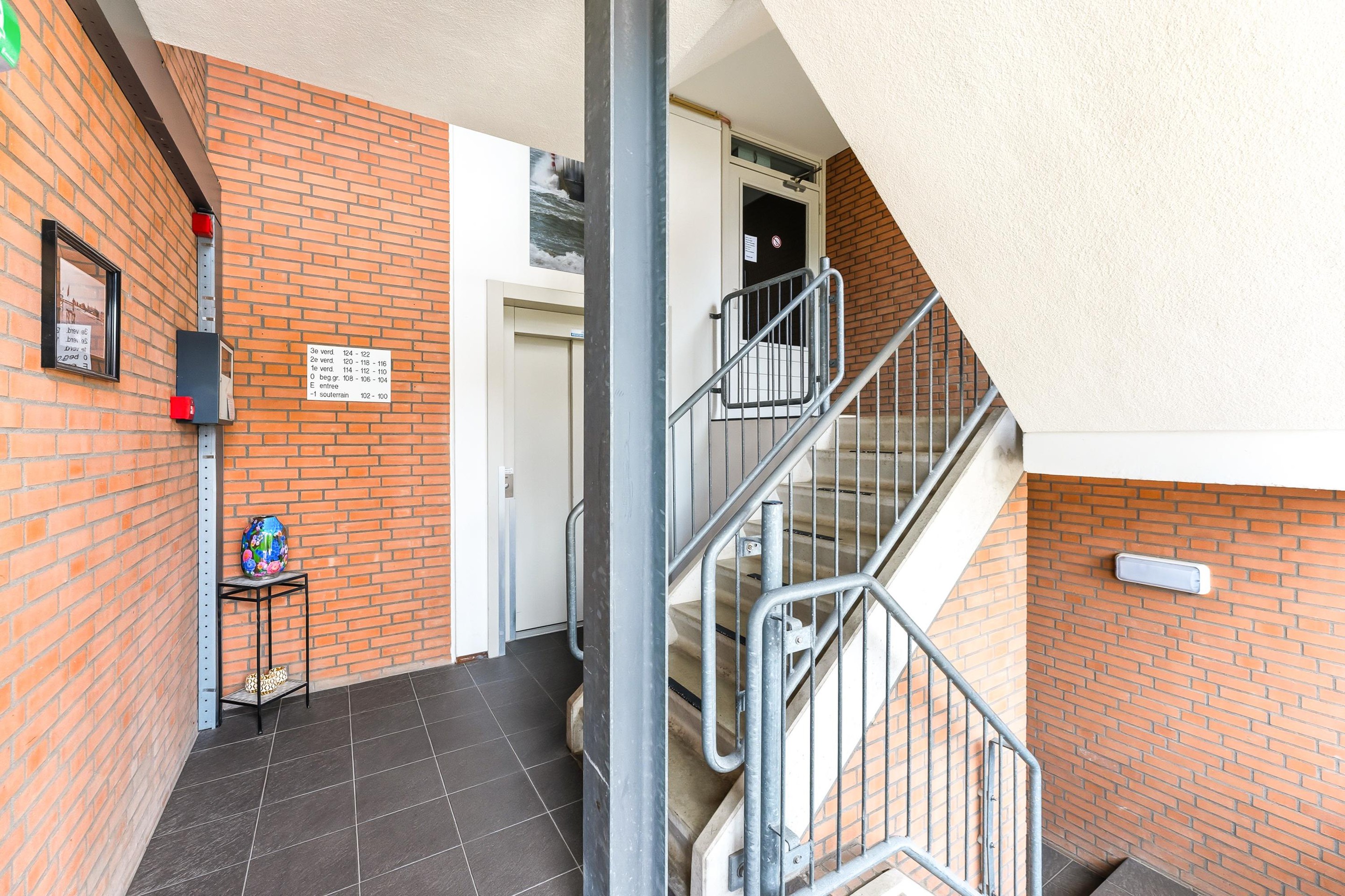 Afgesloten entree, hal met videofoon het trappenhuis en toegang tot de lift.