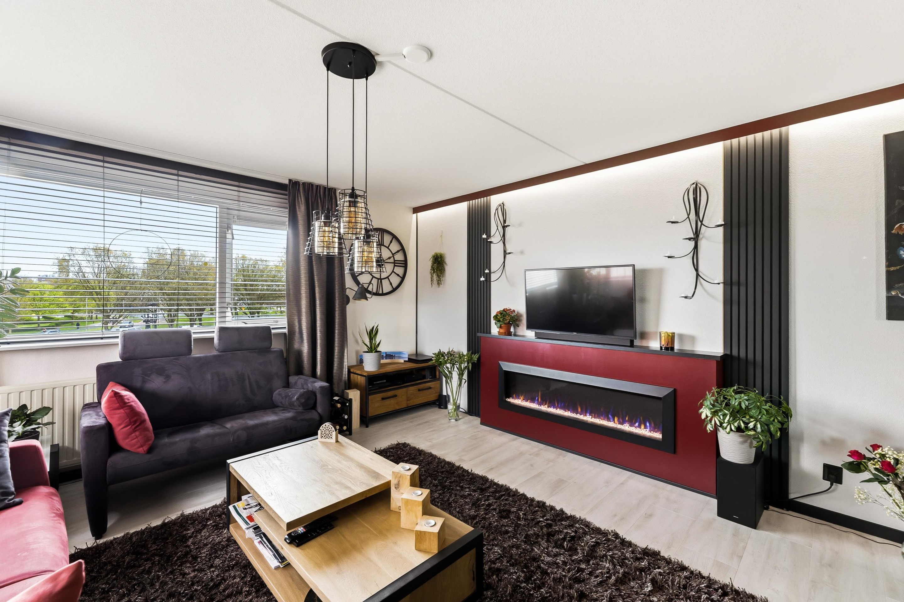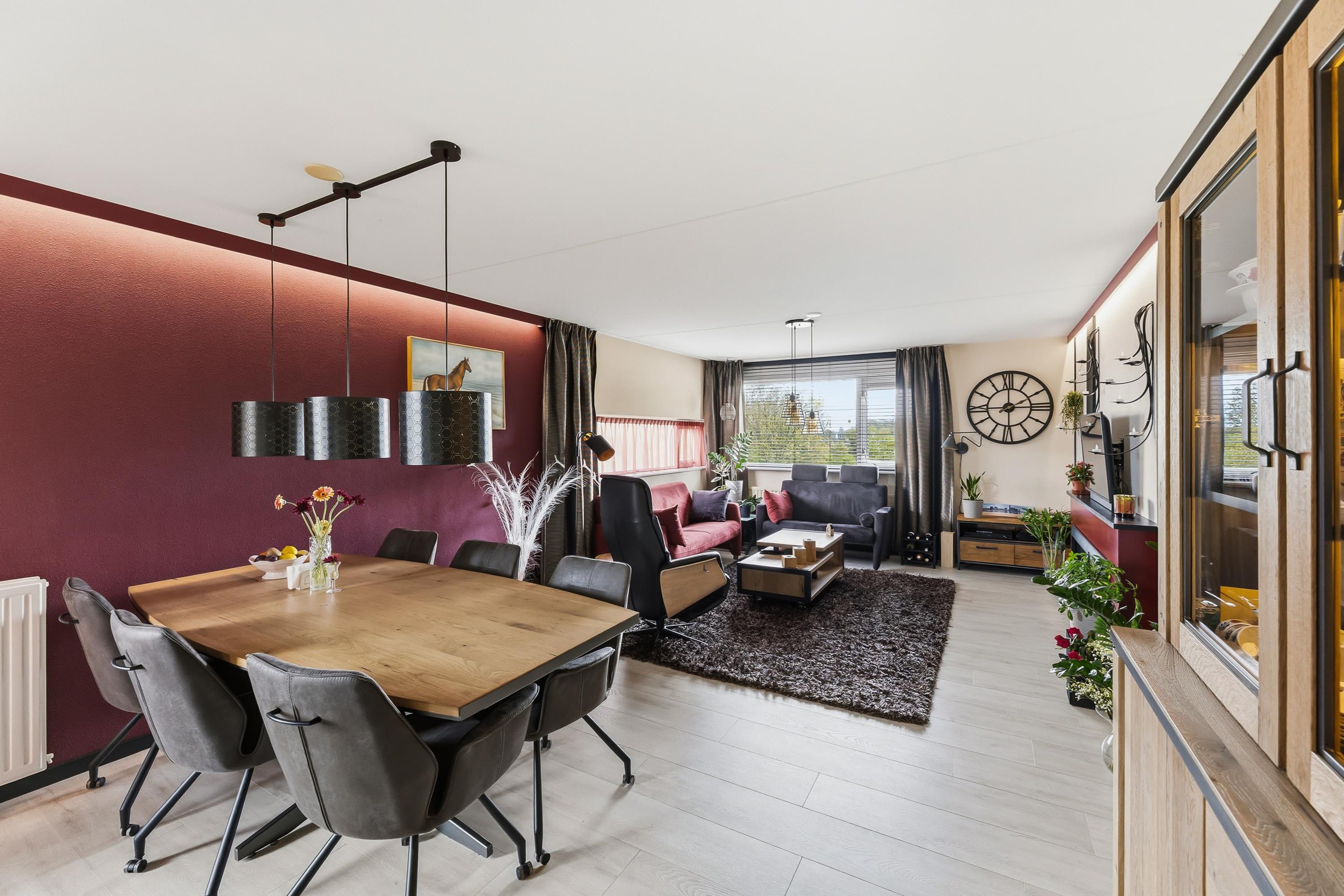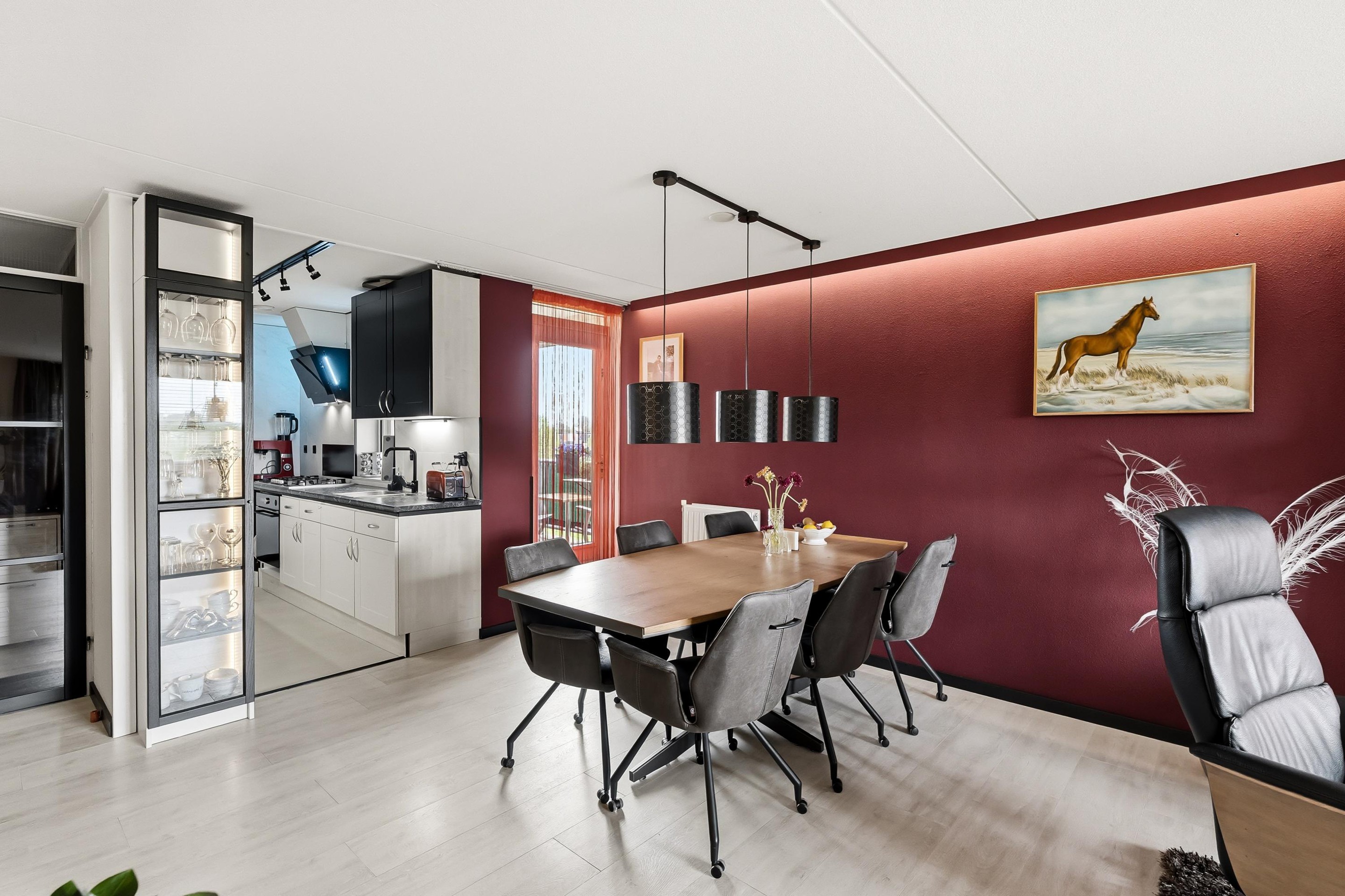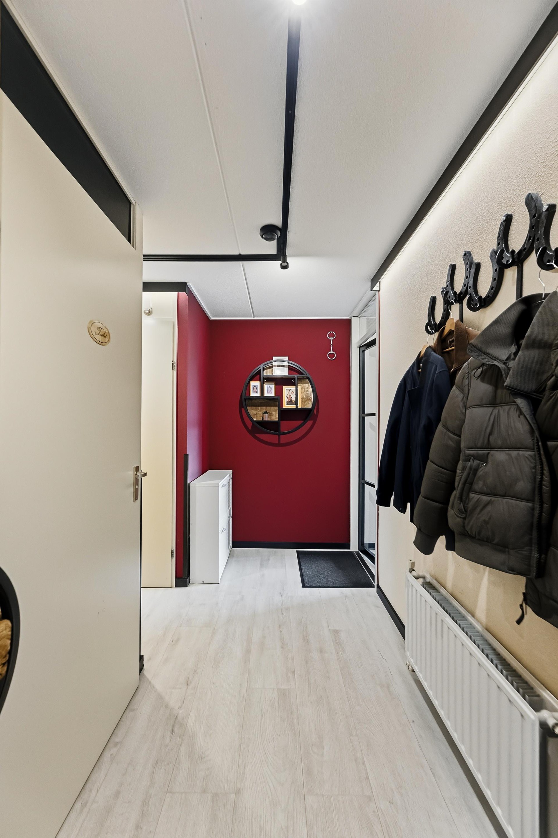 Nagenoeg in het hele appartement ligt een “strandhuis” laminaat afgewerkt met hoge zwarte plinten.