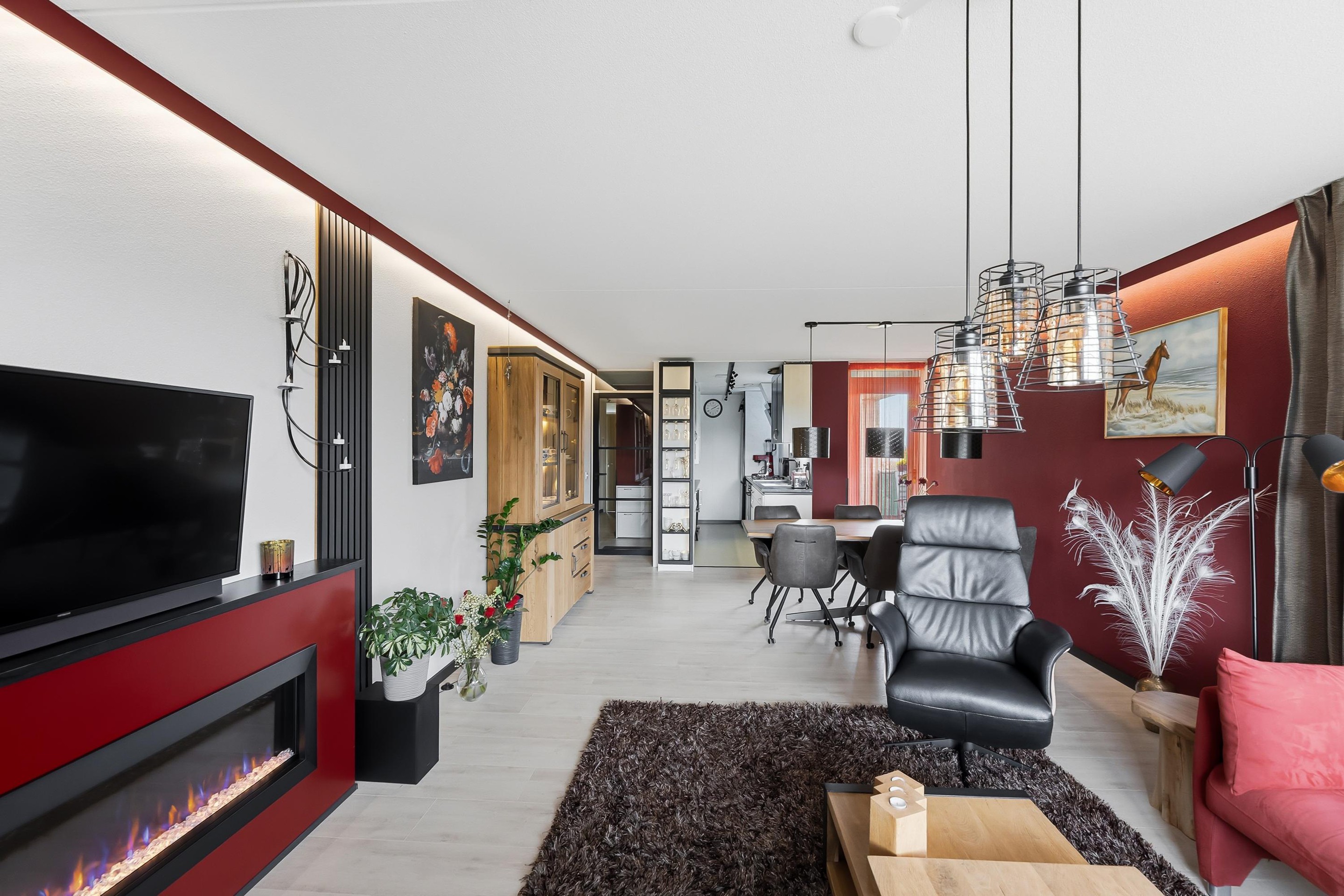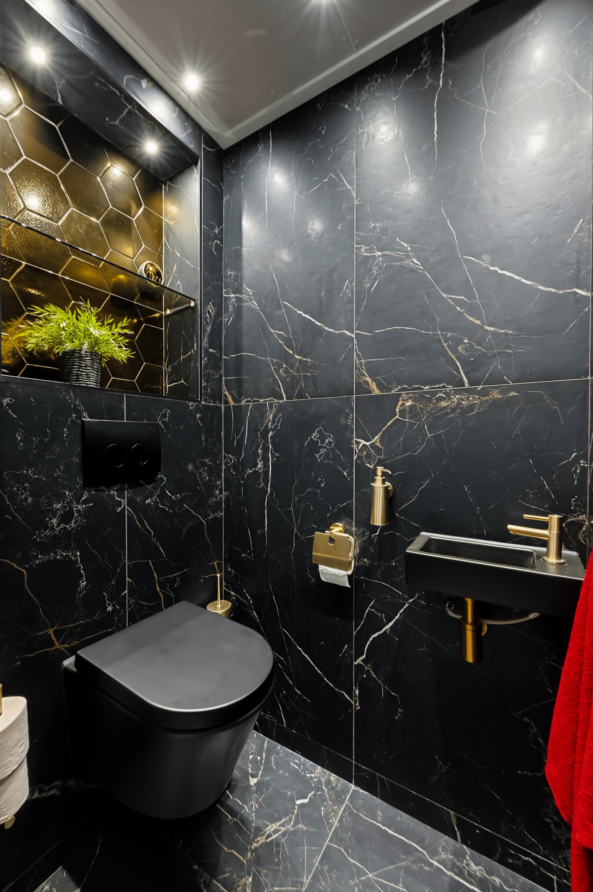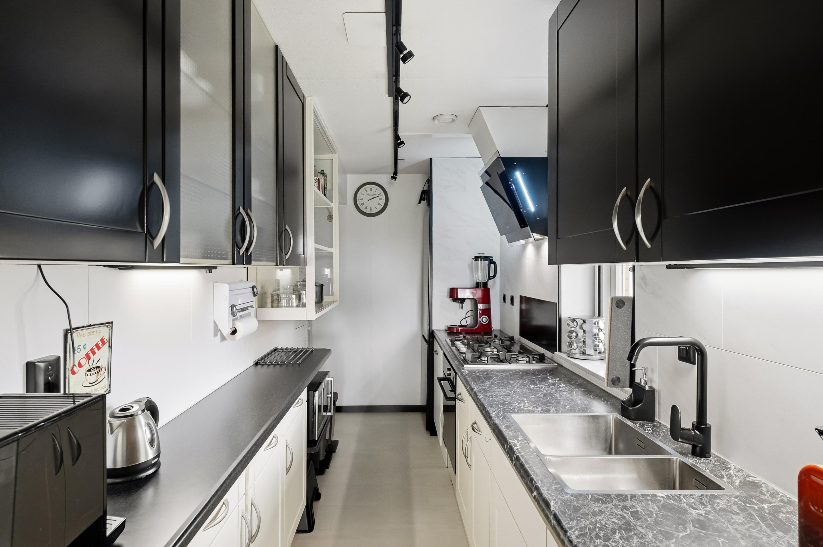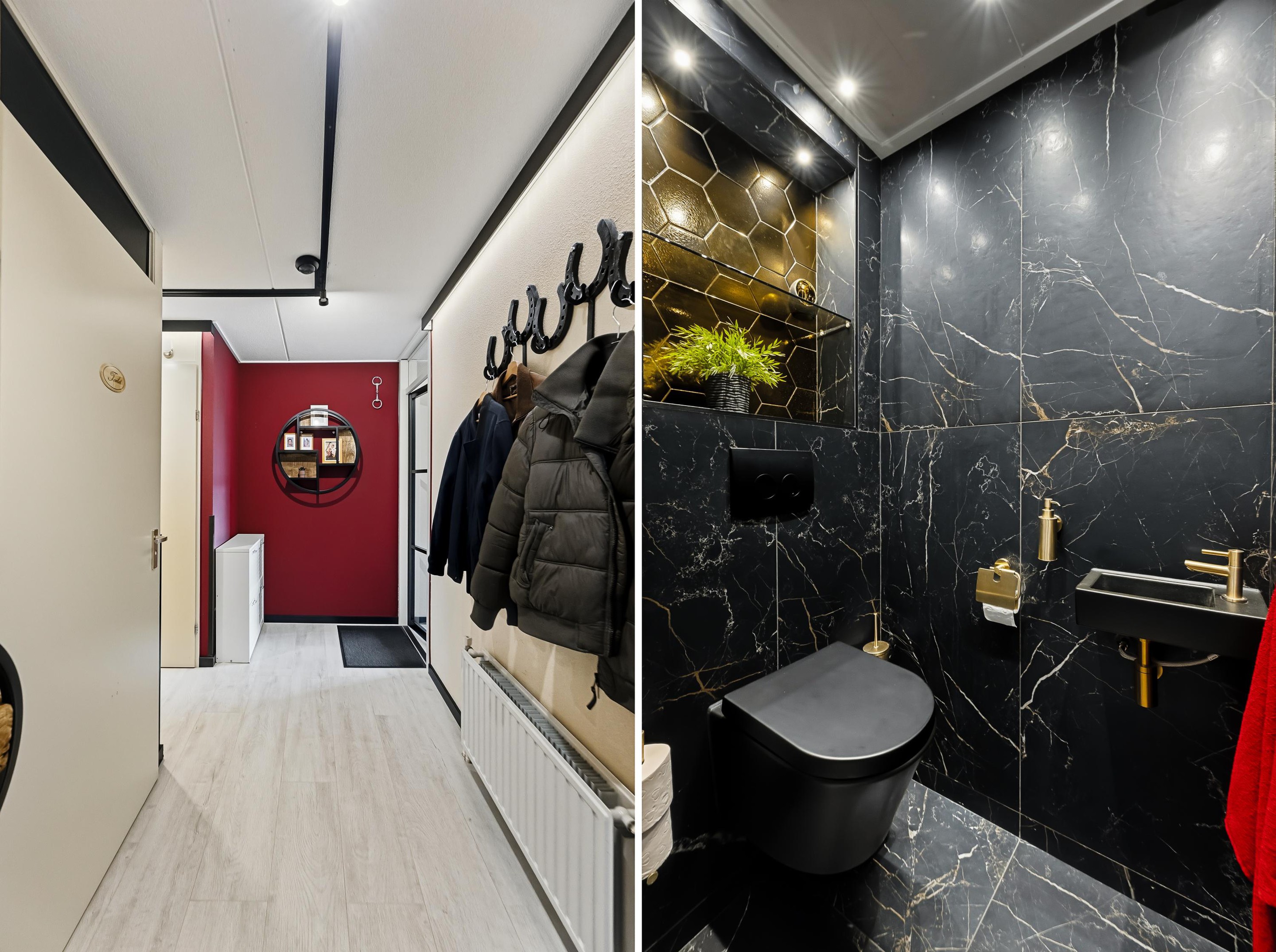 Appartement: entree, hal, toilet voorzien van matzwarte marmer-look tegels gecombineerd goud-craquelé kleurige tegeltjes in hexagon-vorm. De zwarte voegjes zijn verrassend afgewerkt met messing splintertjes. De woonkamer heeft toegang tot het balkon en de halfopen keuken, uitgevoerd in de kleuren zijdeglans, zwart en roomkleur. De bijkeuken is bij de keuken getrokken waardoor extra ruimte is ontstaan. Er is aan weerszijde een werkblad, een XXL 90 cm gaskookplaat met wok brander, vaatwasser en oven met stoomfunctie. Het geheel wordt compleet gemaakt met een design afzuigkap en meerdere vormen van LED verlichting.