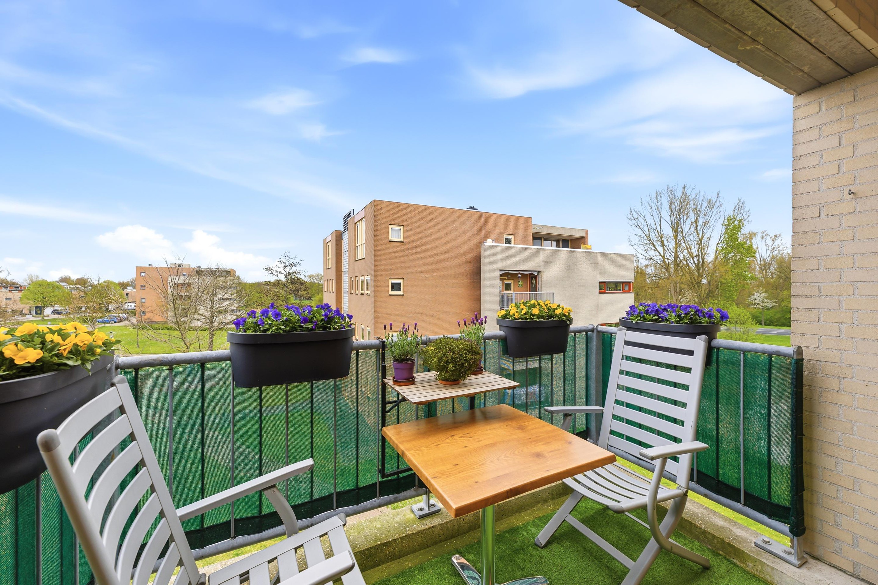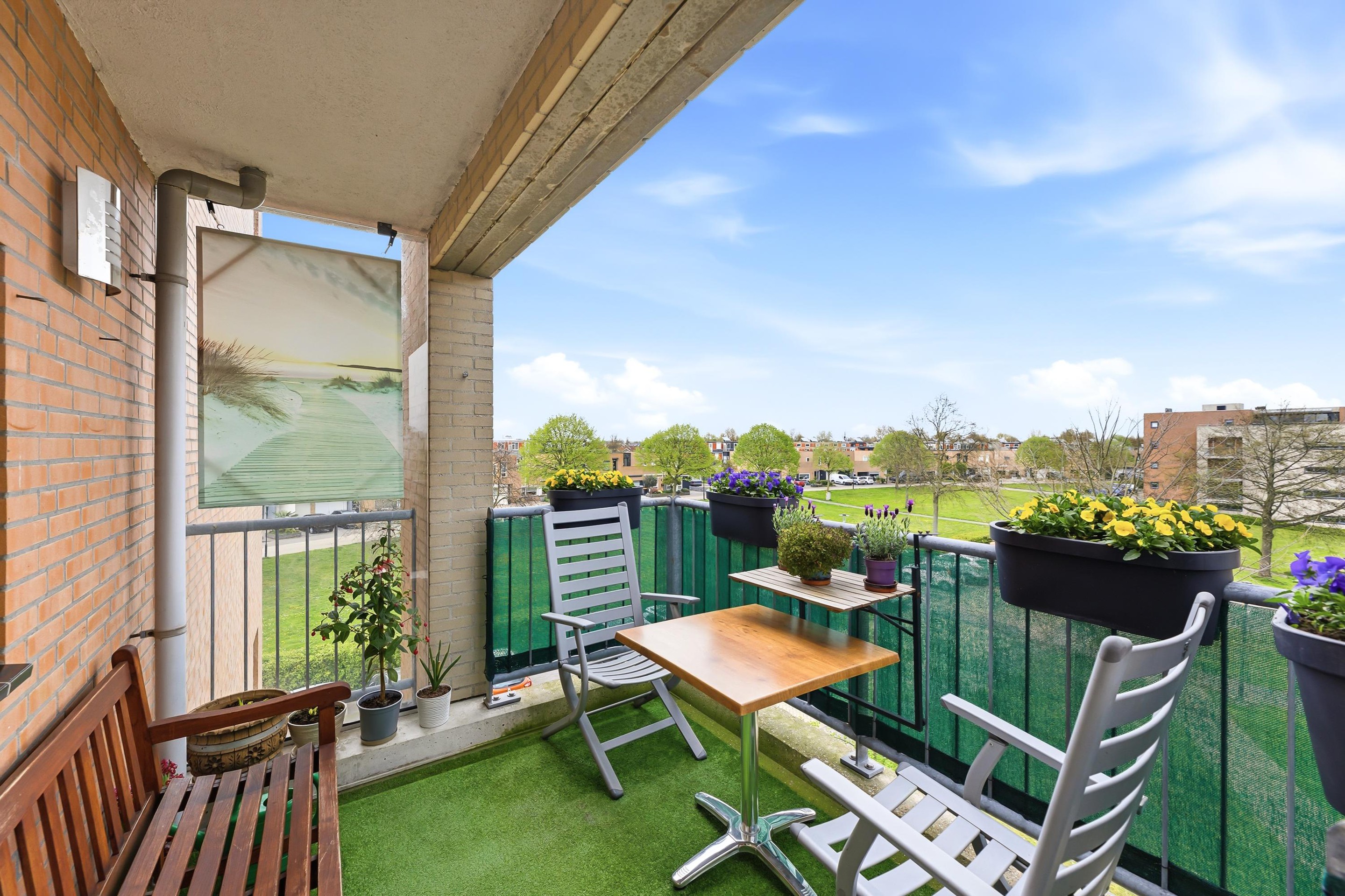 Op het balkon is het in de ochtend goed toeven in de zon terwijl het in de middag en avond juist aangenaam uit de zon is en zijn doeken of parasols overbodig.