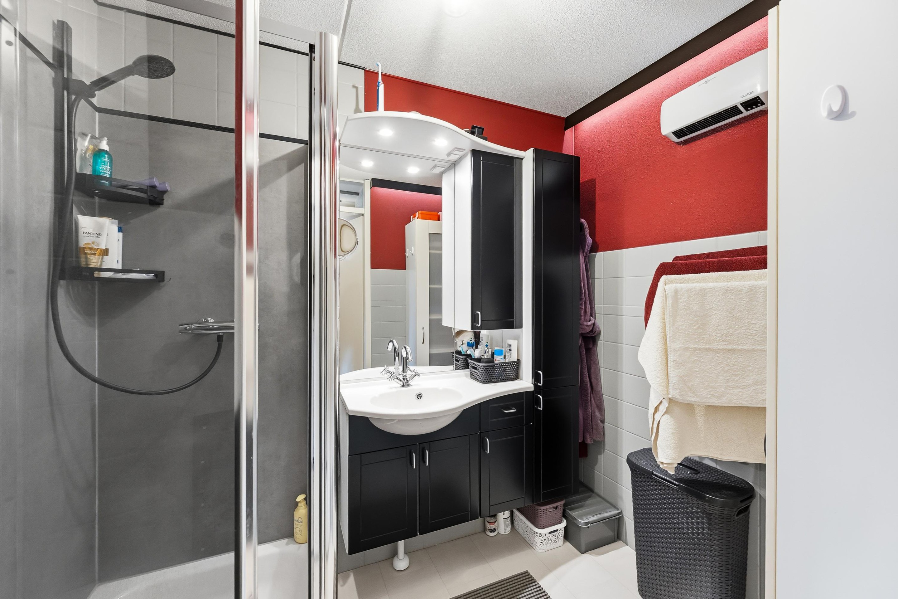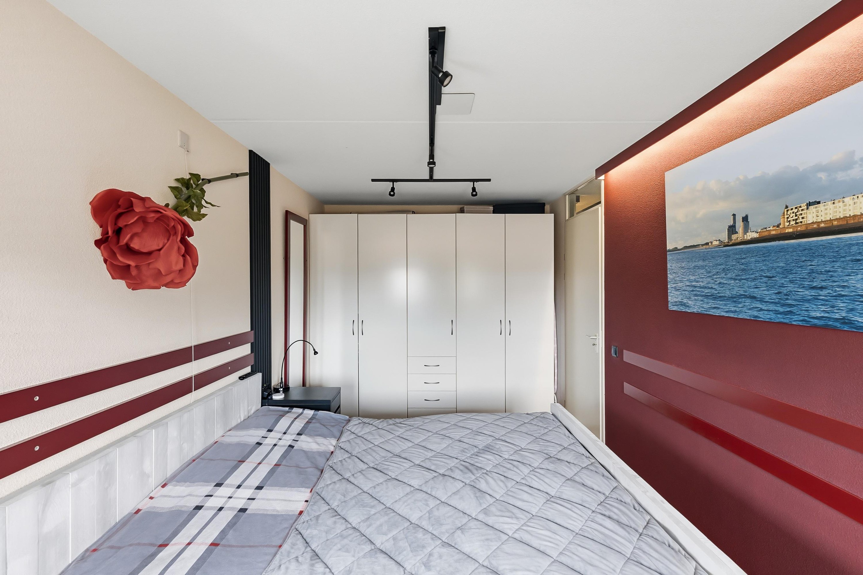 De badkamer met betonlook en zwarte accessoires is voorzien van heteluchtverwarming die in korte tijd de temperatuur aangenaam maakt. In zowel de keuken als de badkamer is een wasmachine aansluiting. De twee fijne slaapkamers hebben een prima afmeting.