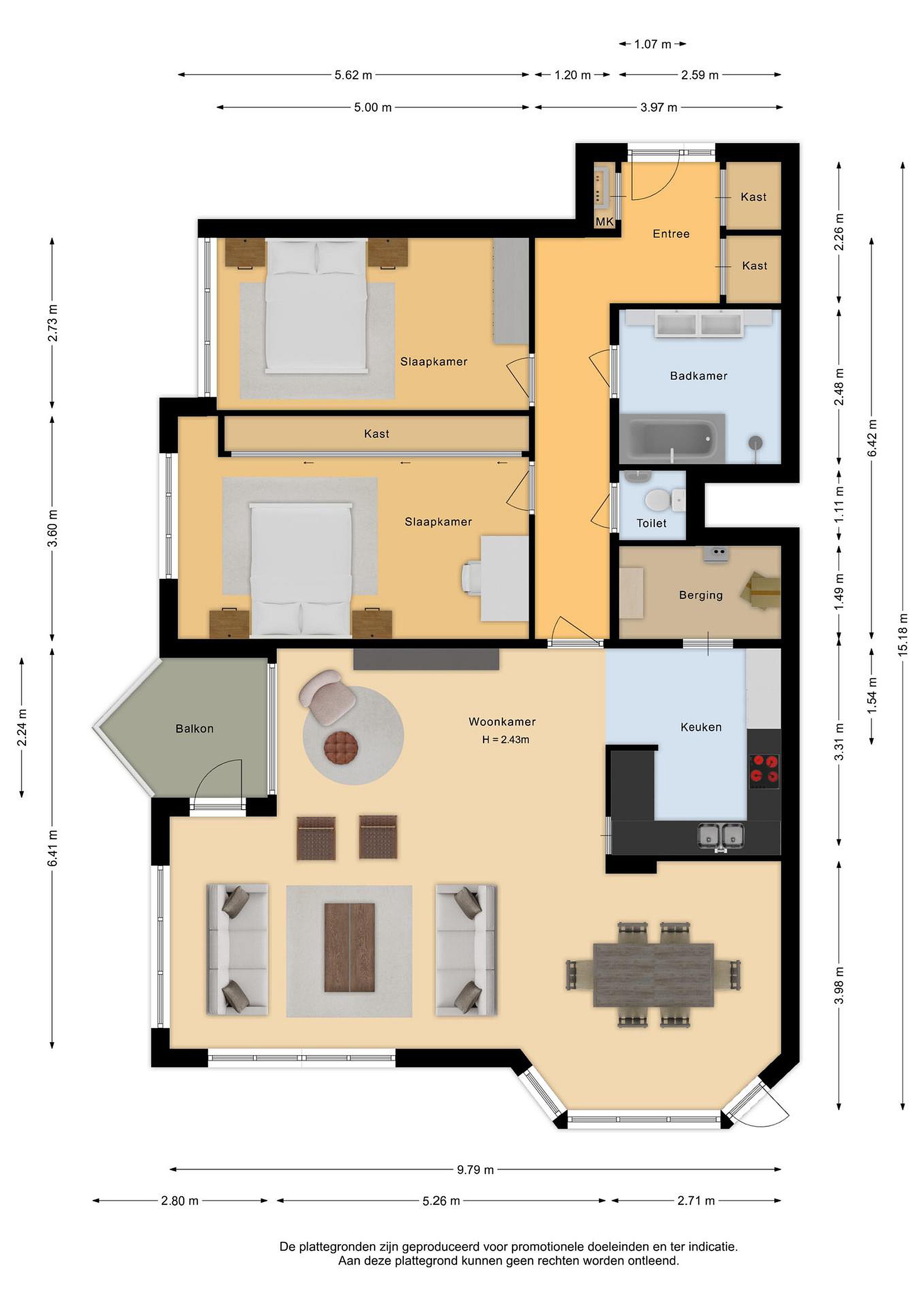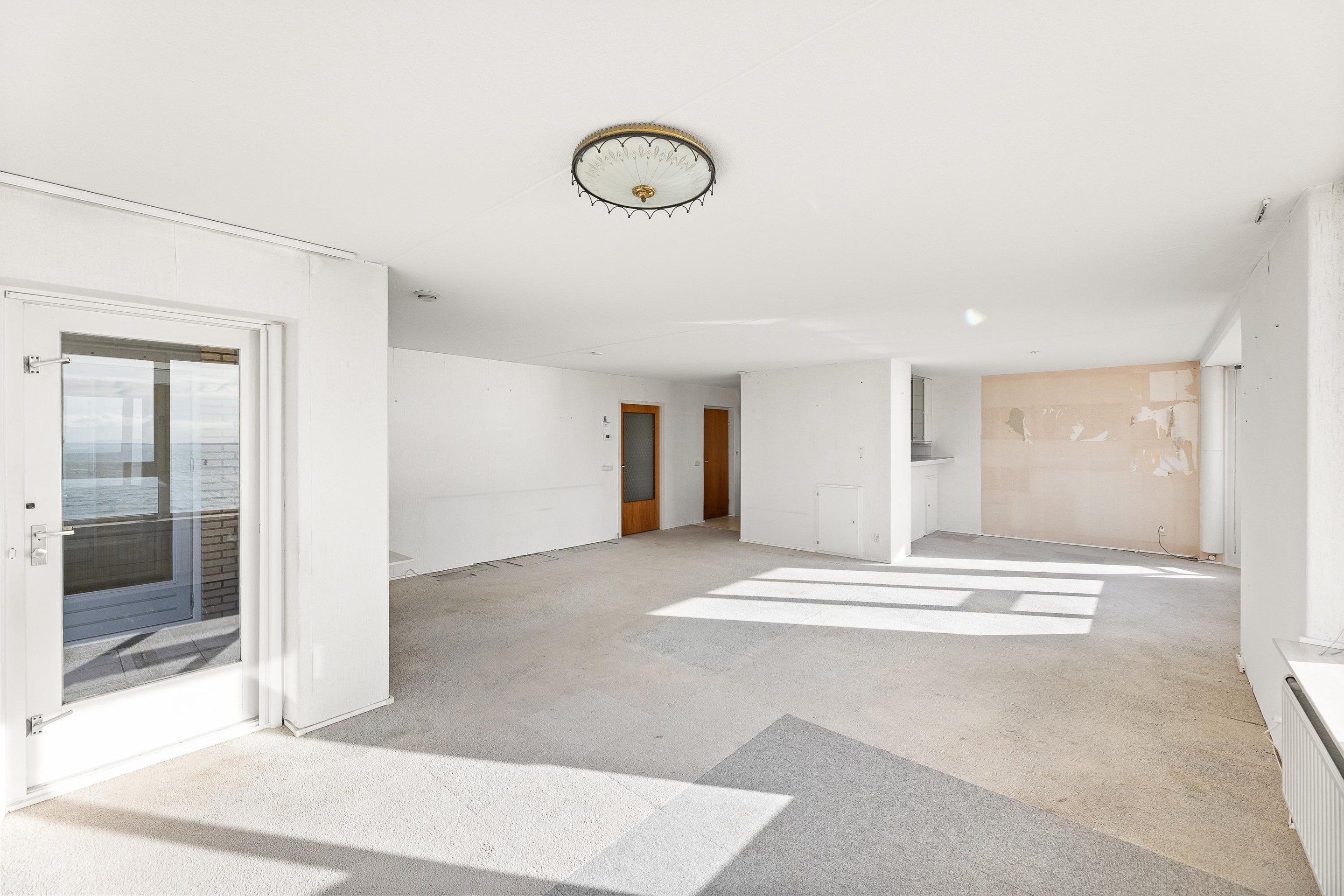 Entree, hal met meterkast. De woonkamer is uitermate ruim bemeten en is speels ingedeeld met fenomenale zichtlijnen een “zee” van lichtinval. Vanaf de hal heeft u toegang tot de meterkast, de badkamer, twee slaapkamers, de toiletruimte en de woonkamer.