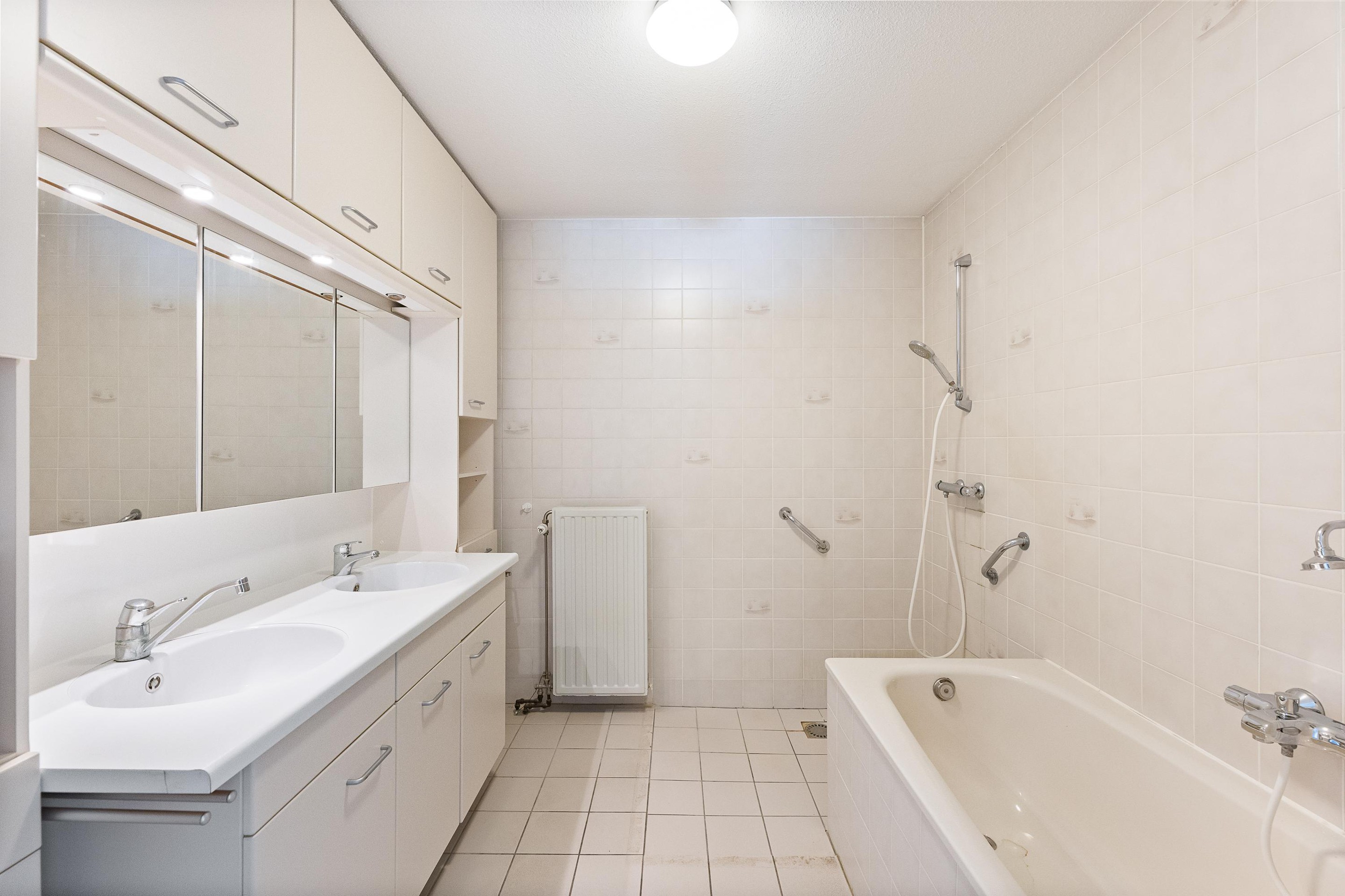 De badkamer is geheel betegeld en is uitgevoerd met een douche, ligbad, en een wastafelmeubel met dubbele wastafel en veel kastruimte