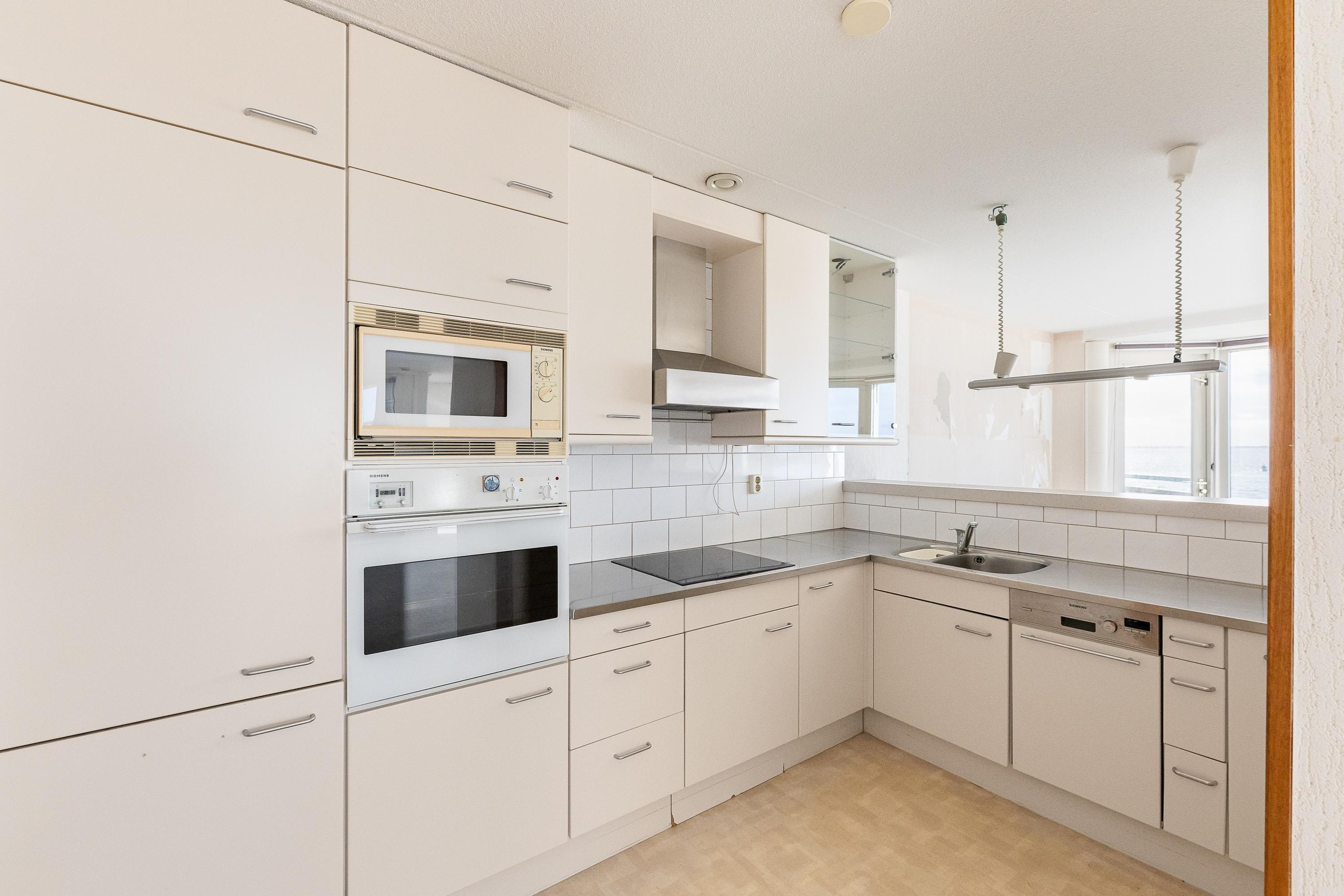 De neutrale keuken is in een U-vorm opgesteld. Deze beschikt over diverse inbouwapparatuur w.o oven, magnetron, inductiekookplaat koelkast en afzuigkap. Ook vanuit de keuken is er een prachtig uitzicht en kijkt u uit over de zee.