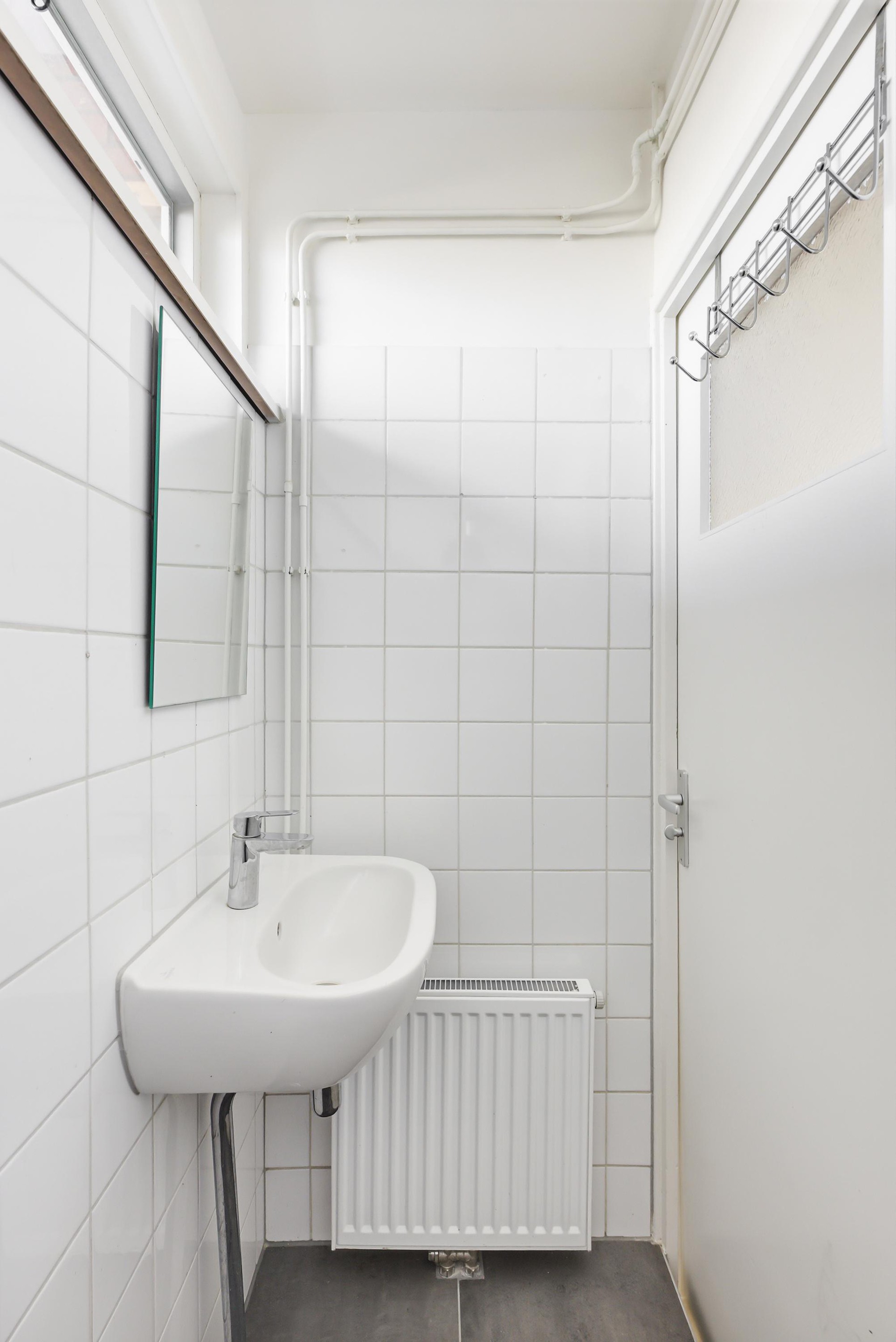 hal met toiletruimte, ruime moderne keuken (ca. 7 m2) voorzien van onder- en bovenkasten, lades, gaskookplaat en afzuigkap. Tevens bevindt zich hier de wasmachine-aansluiting en opstelling c.v.-combiketel. Ook is er ruimte om een vaatwasser te plaatsen. Vanuit de keuken is er toegang tot een klein, maar zonnig balkon. De lichte woonkamer (ca. 18 m2) met veel lichtinval is voorzien van een vaste kast en een schouw. Verder zijn er 2 slaapkamers aanwezig (ca. 10 m2 en 11 m2). De badkamer is eenvoudig, maar netjes van uitvoering voorzien van een wastafel.