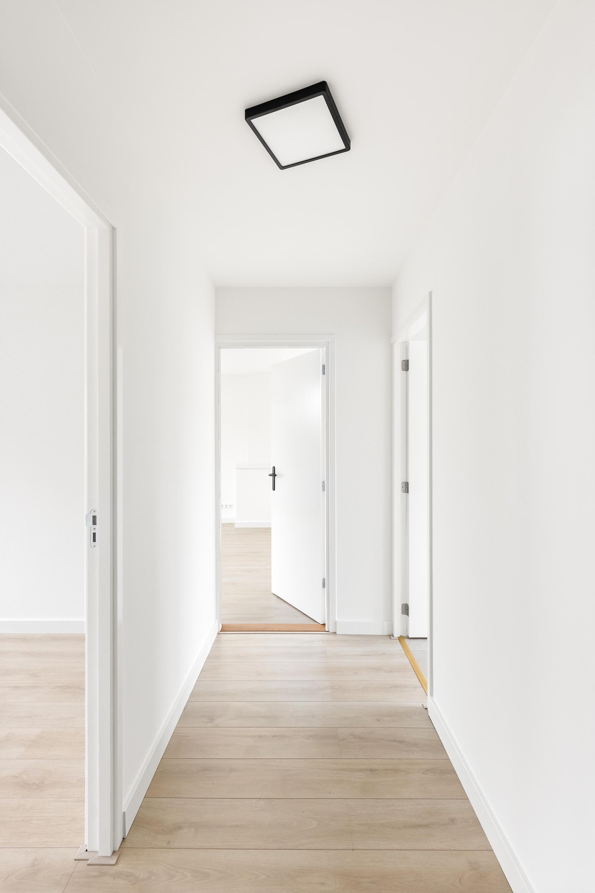 Appartement: hal met nieuwe toiletruimte, 2 slaapkamers (ca. 10 en 11 m2), lichte woonkamer (ca. 18 m2) met laminaatvloer, schouw en vaste kast. Nieuwe hoekkeuken met onder- en bovenkasten, carrouselkast, lades en diverse inbouwapparatuur zoals een inductiekookplaat, afzuigkap en een koelkast. Er is ruimte voor een vaatwasser of een vriezer. Tevens bevindt zich hier in de keuken een wasmachine-aansluiting en opstelling c.v.-combiketel (Nefit Proline, bouwjaar 2025). Vanuit de keuken is er toegang tot een balkon gelegen op het noordwesten. De nieuwe badkamer en toilet, zijn betegeld met witte tegels, gecombineerd met mooie tegels in een natuurtint en verder voorzien van een inloopdouche, wastafel met meubel en een spiegel.