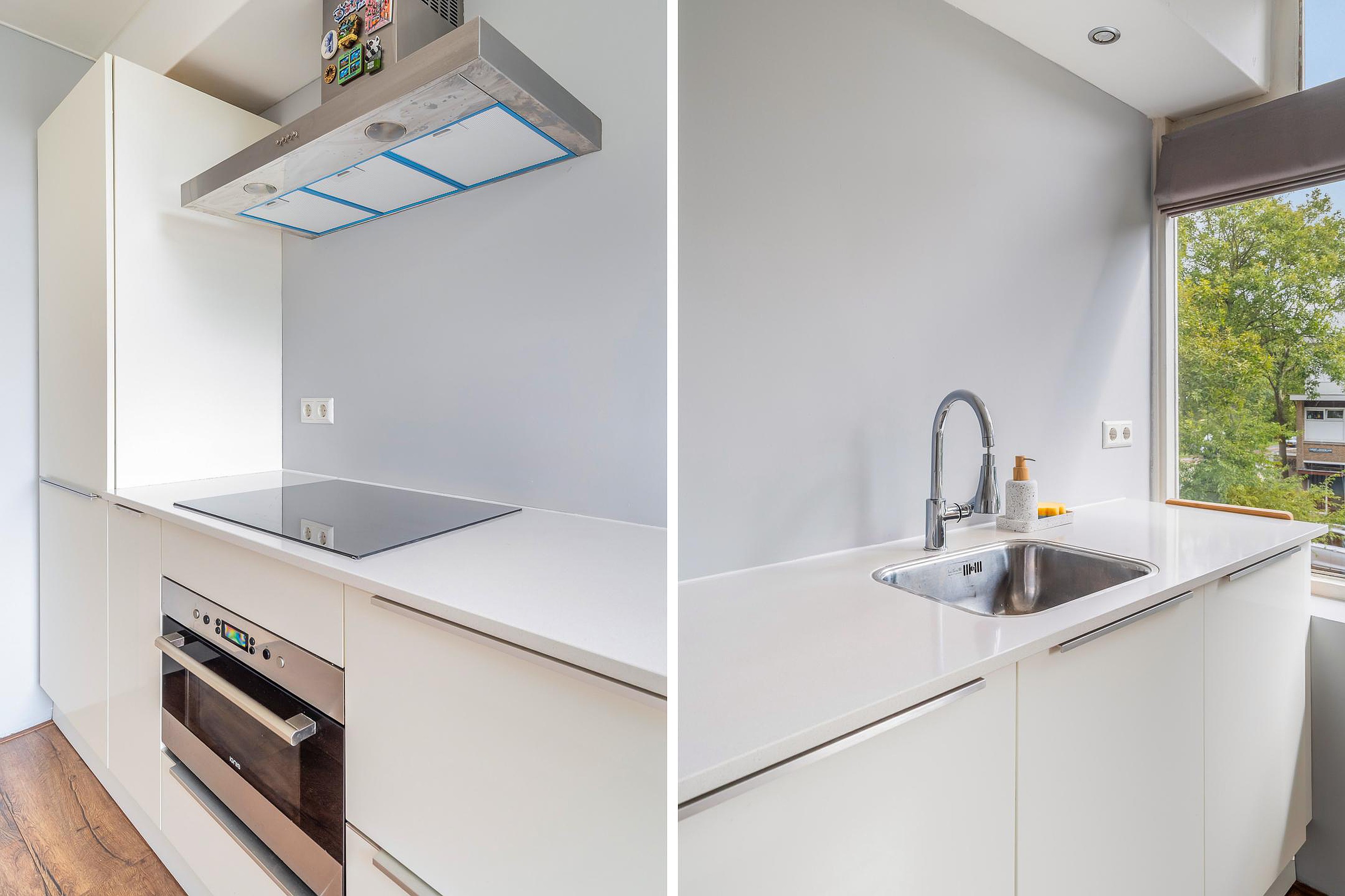 De keuken is in 2016 vernieuwd en uitgevoerd in hoogglans wit met een wit composiet aanrechtblad. Voorzien van inbouwapparatuur zoals een 4-zone inductiekookplaat, afzuigkap, combi-oven, koel-/vriescombinatie en spoelbak – hier wordt koken weer leuk!