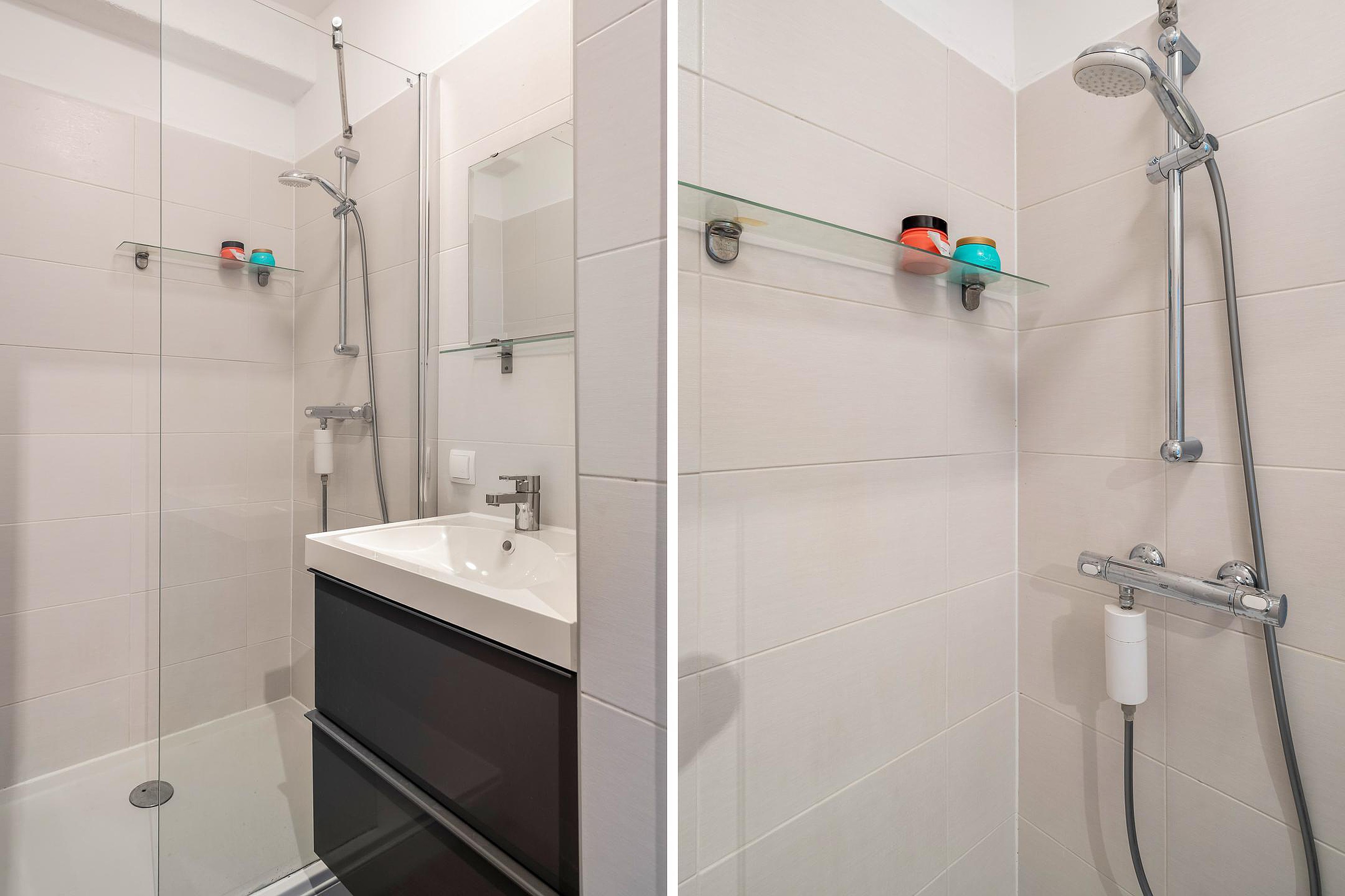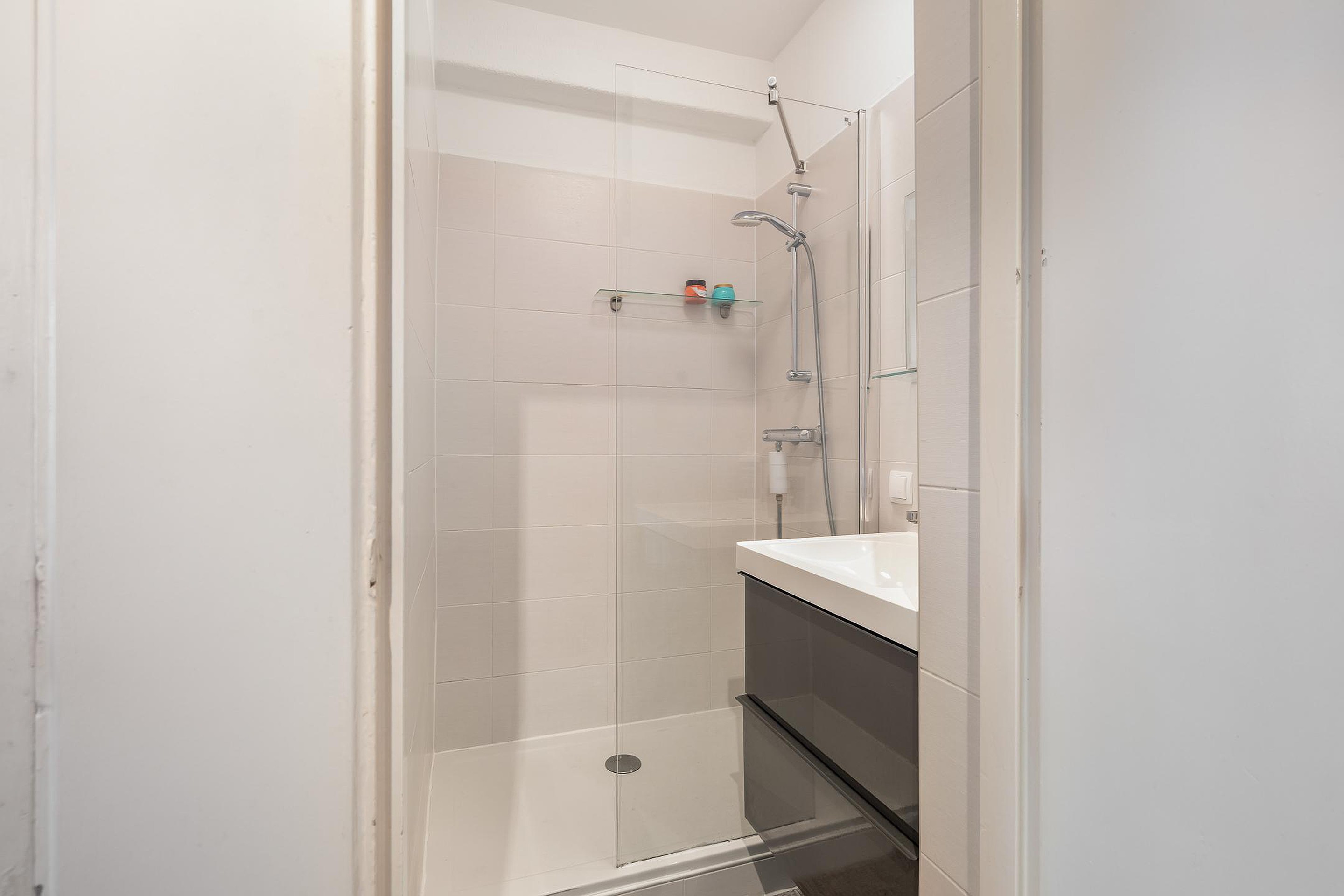 De moderne badkamer is netjes afgewerkt en beschikt over een inloopdouche en een stijlvol wastafelmeubel. Het separate toilet is bereikbaar via de hal.