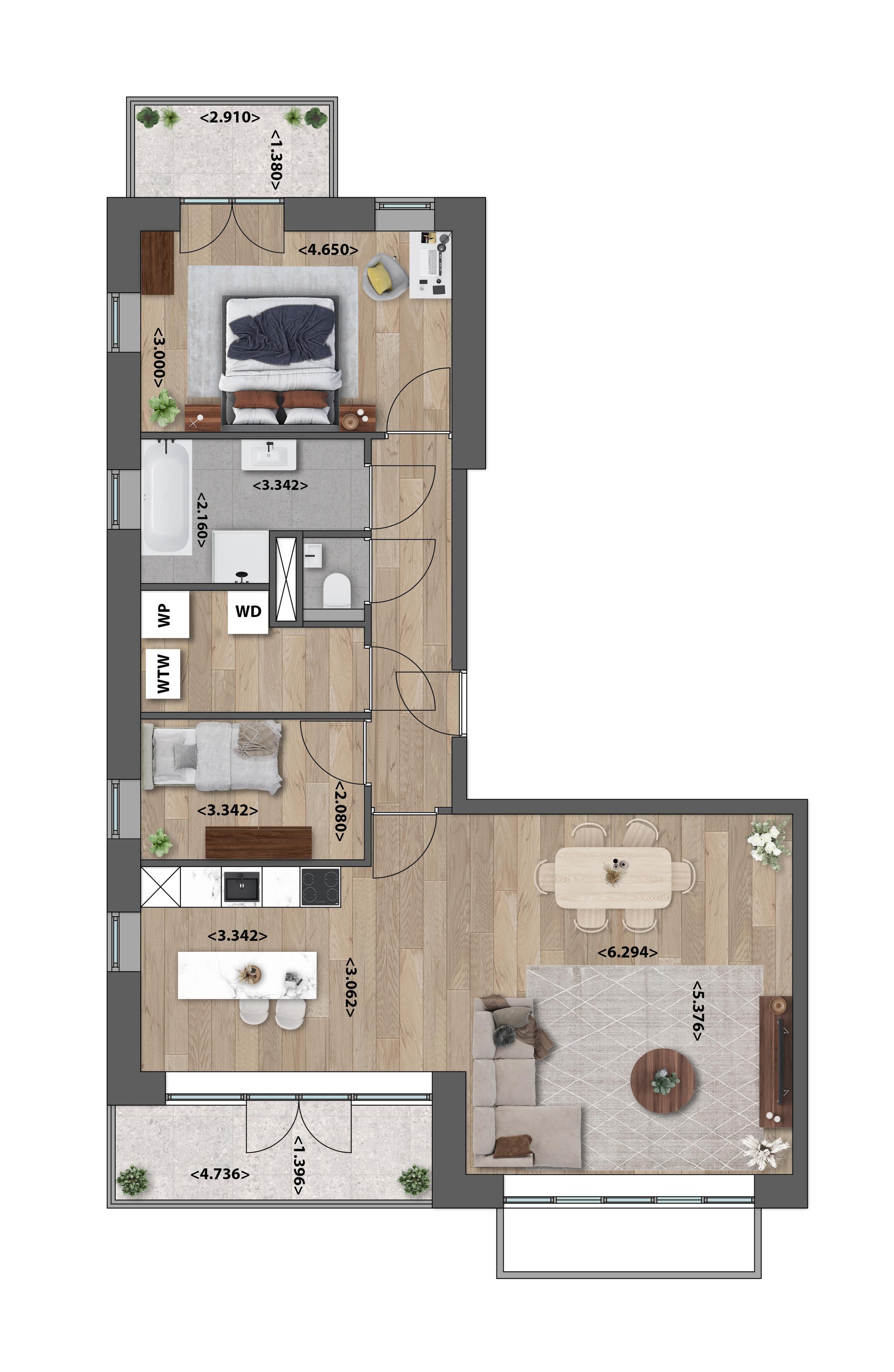 Het westelijk balkon (ca. 7 m2) ligt aan de woonzijde en biedt volop ruimte om te ontspannen na het werk, met middag- en avondzon tot in de late uurtjes.