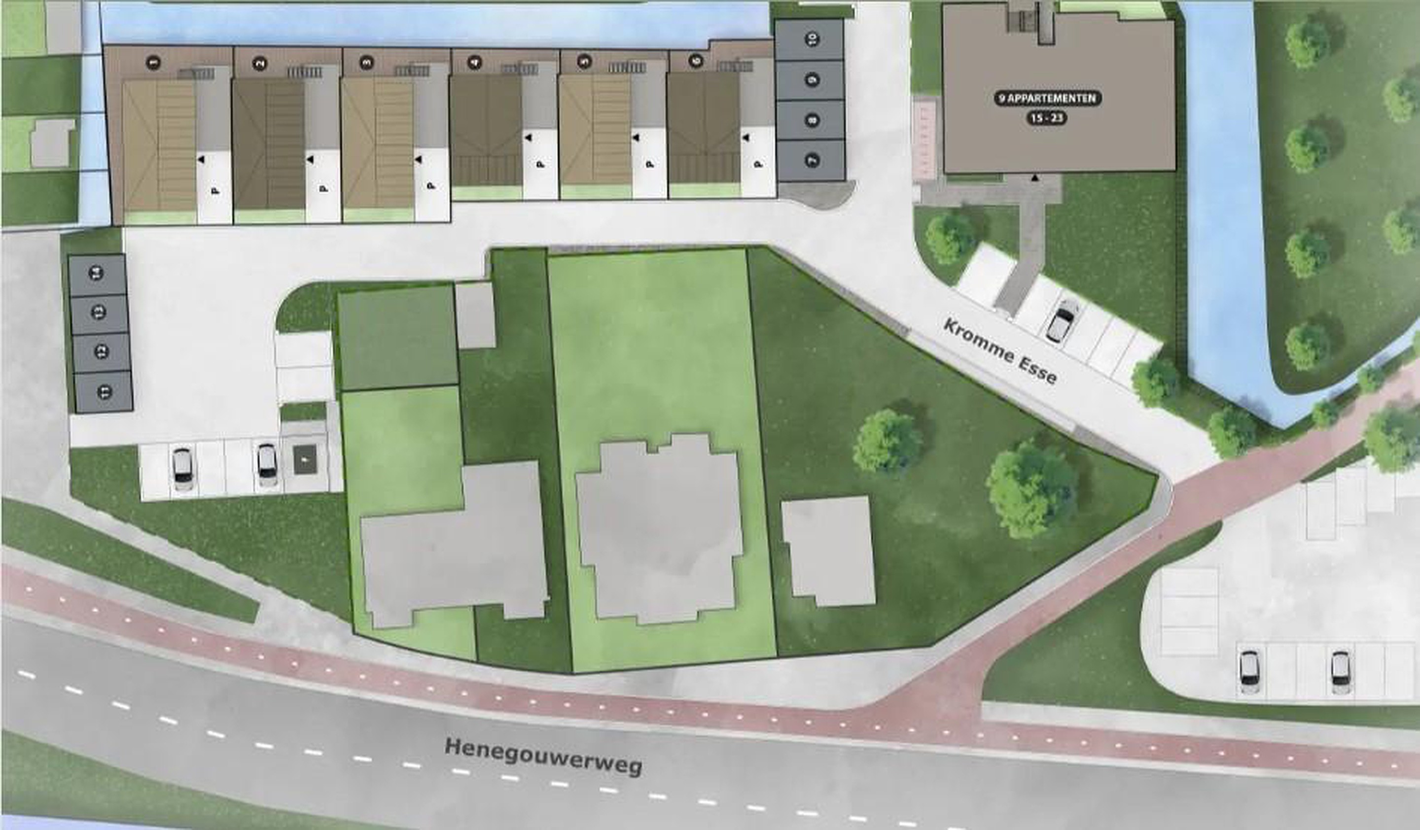 Het nieuwbouwplan aan de Henegouwerweg bestaat uit zes vrijstaande woningen en negen appartementen. Het nieuwbouwplan is ruim opgezet en tegelijkertijd kleinschalig en knus, in de kern van Waddinxveen. Rondom de woningen is er veel groen en water zichtbaar, waarbij het natuurlijke karakter eruit springt.