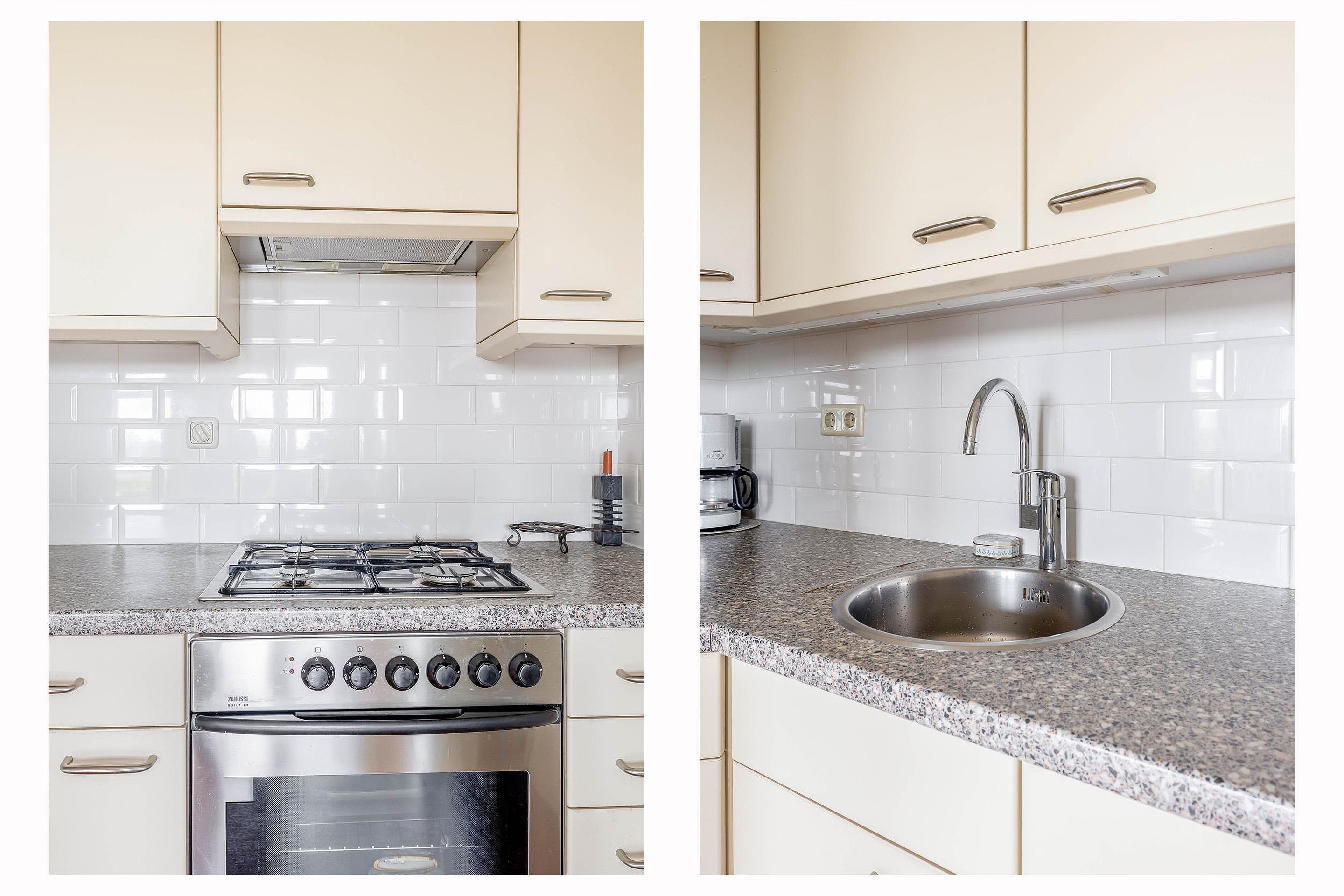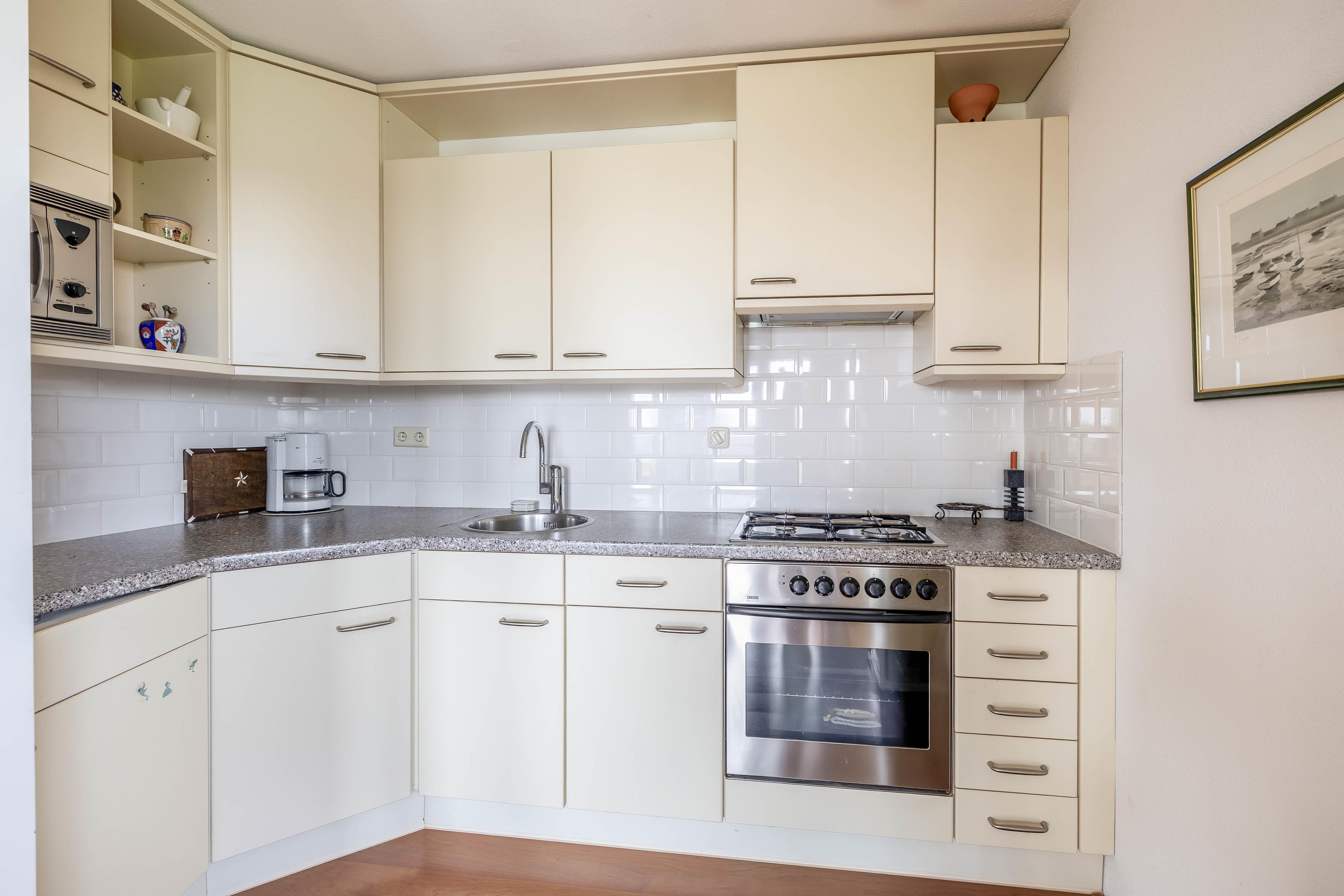 - Wonen en koken: De lichte woonkamer is een heerlijke plek om te ontspannen met een weids uitzicht en veel privacy door de ligging aan de polderzijde. De open keuken is halfopen, L-vormig opgesteld en voorzien van een koelkast, gaskookplaat en afzuigschouw.