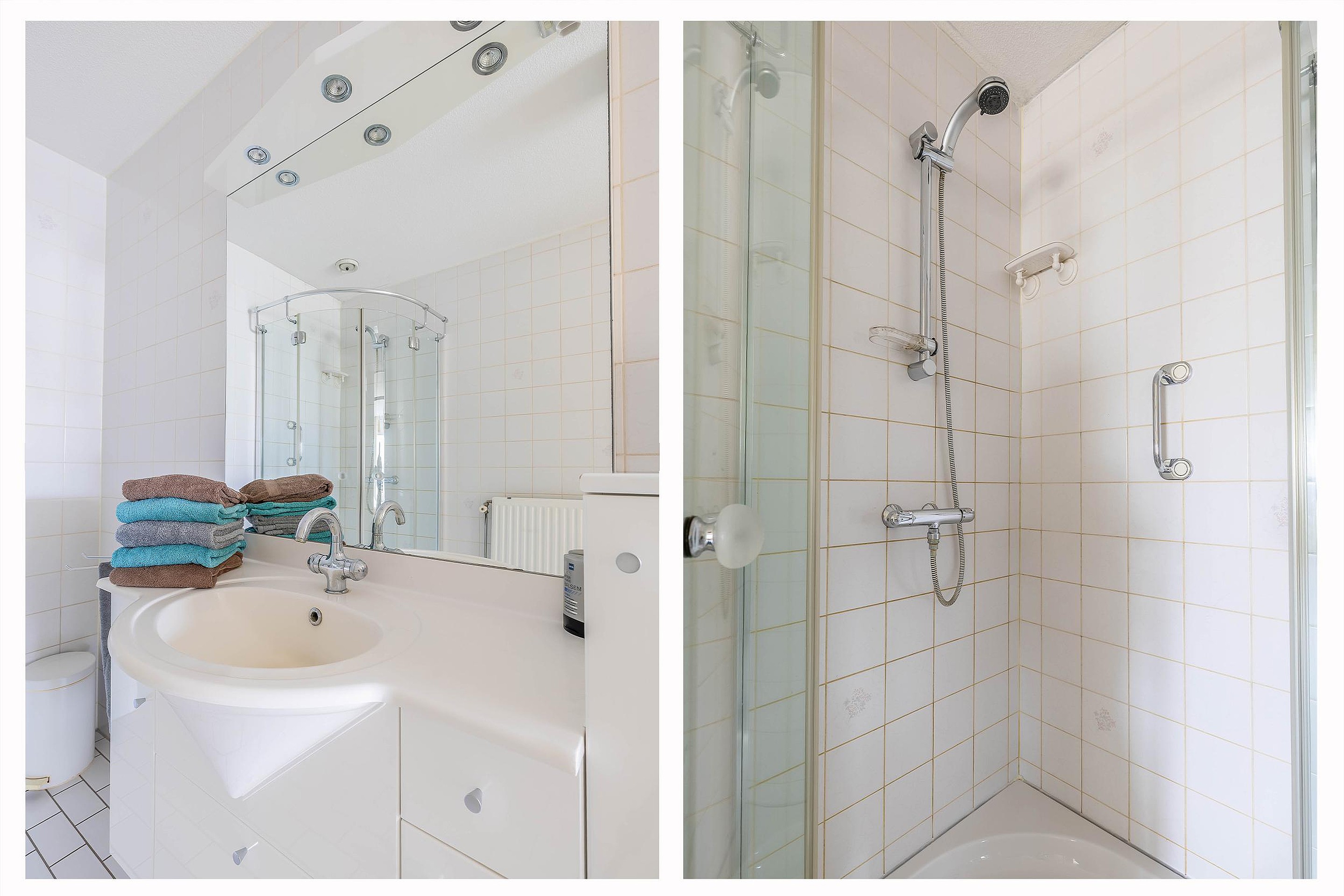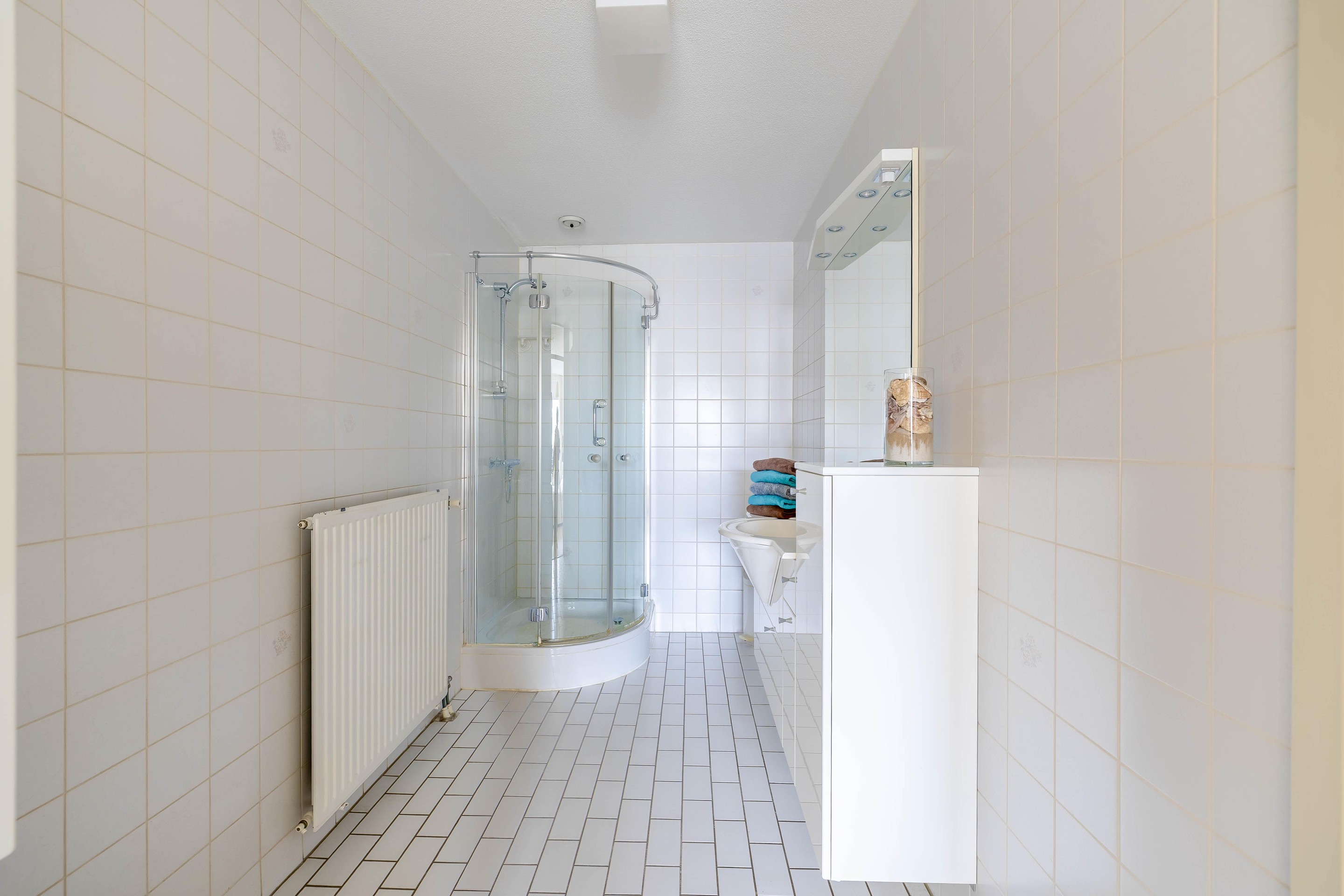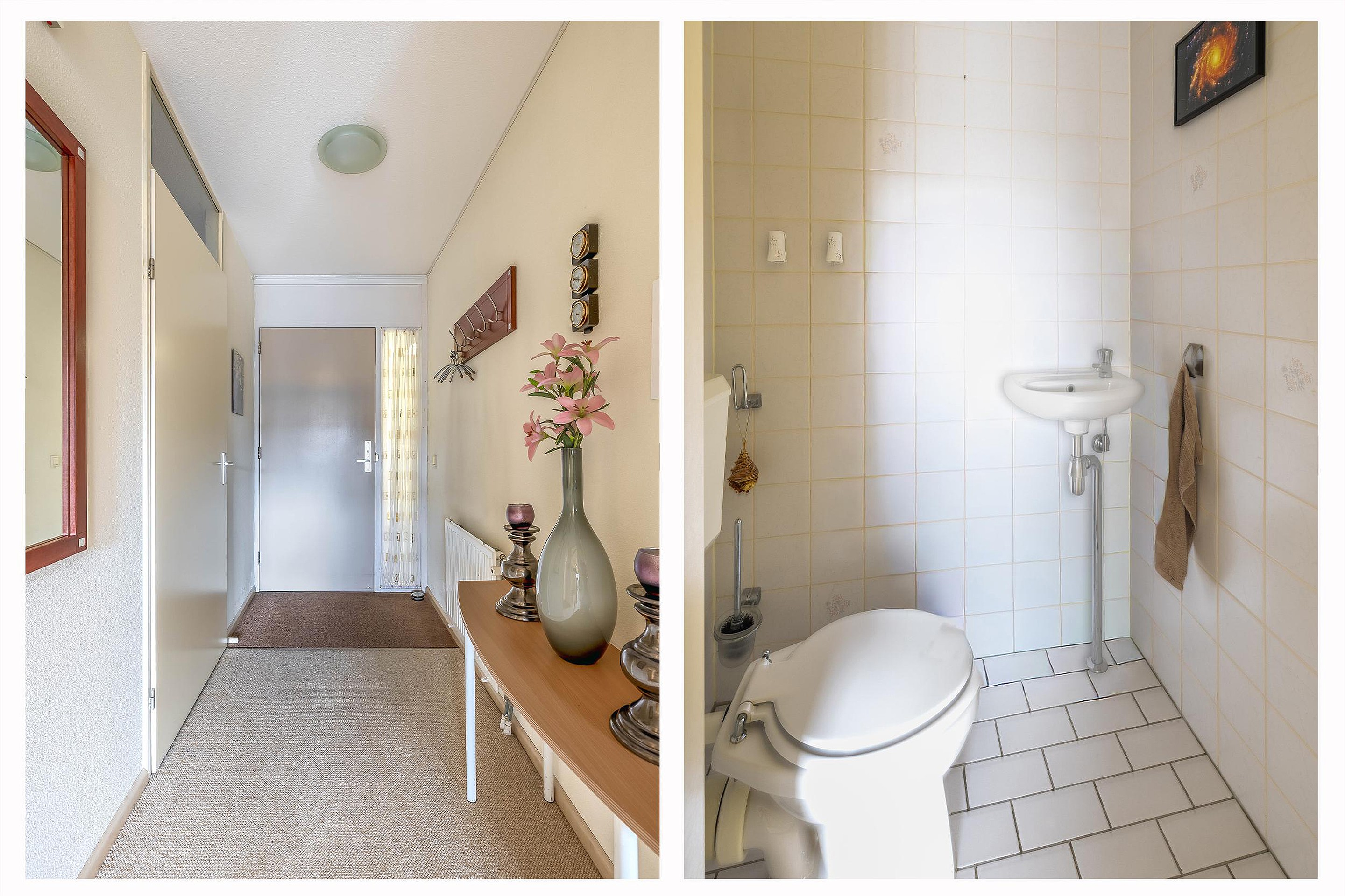 Entree met ruime hal die toegang geeft tot alle vertrekken. Direct bij binnenkomst bevindt zich de cv-/bergruimte met Intergas HR-ketel (2014) en mechanische ventilatie-unit. Verderop een deels licht betegelde toiletruimte met toilet en fonteintje. De badkamer is geheel licht betegeld en voorzien van een douche, wastafelmeubel met spiegelkast en aansluitingen voor wasmachine en droger.