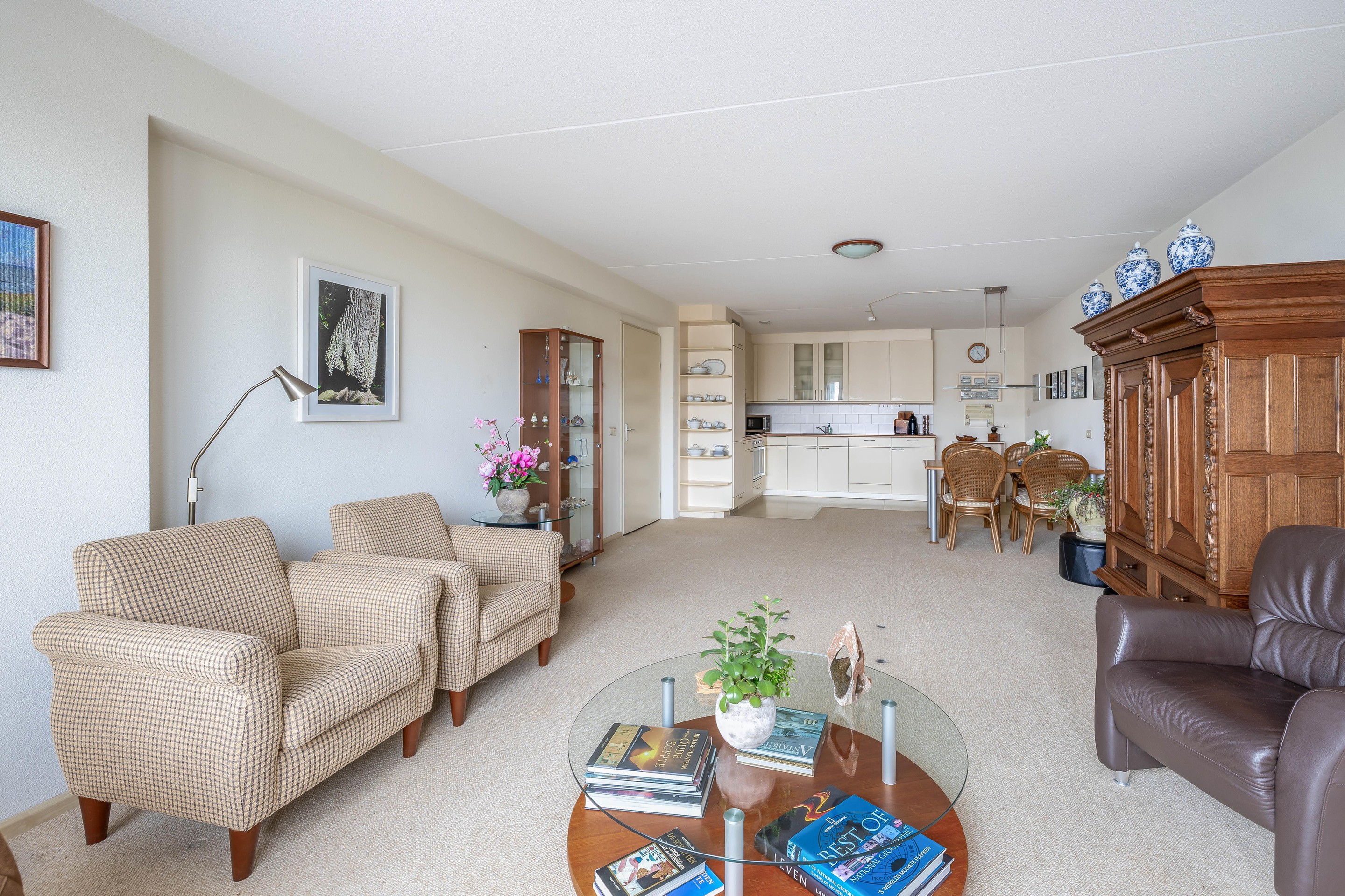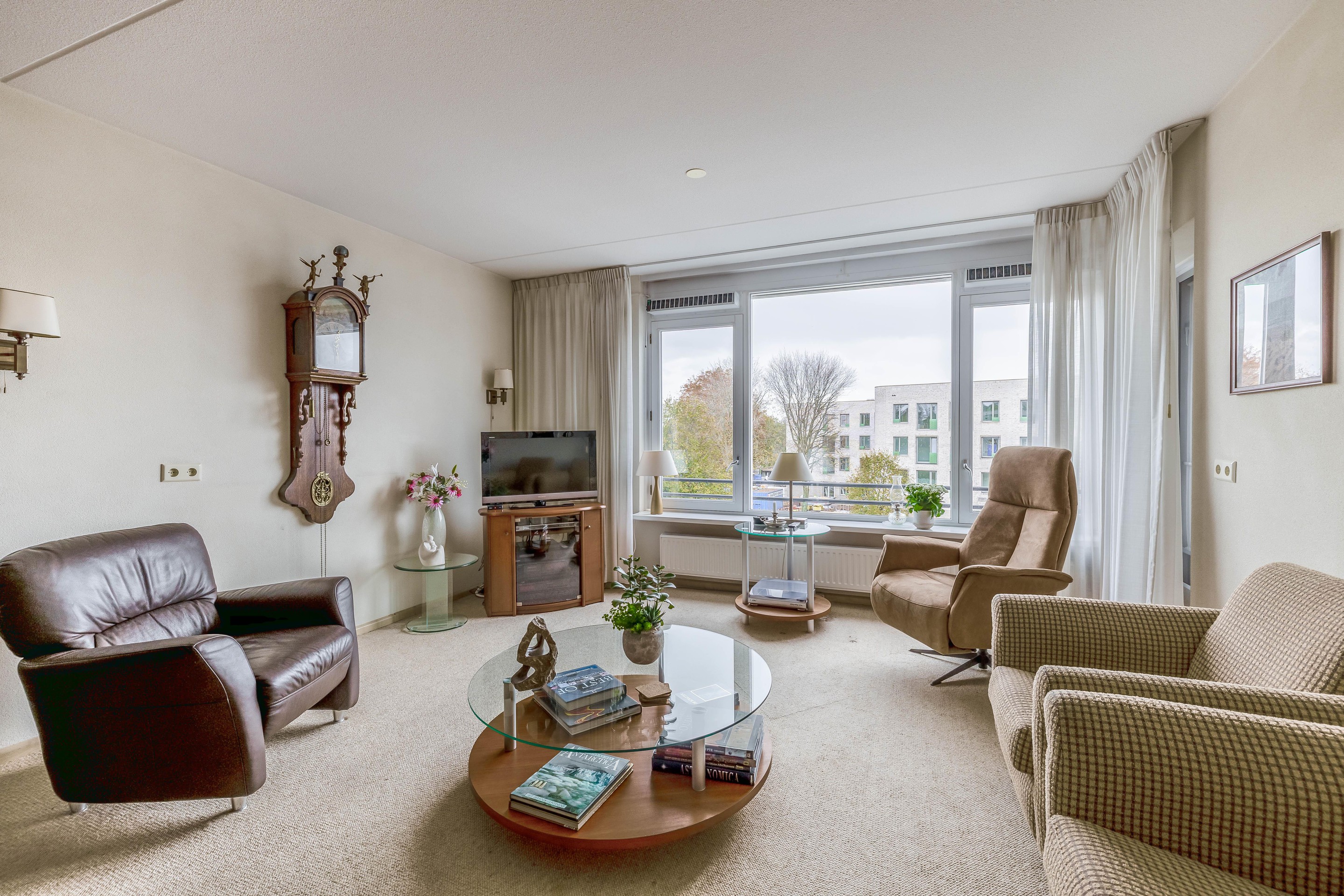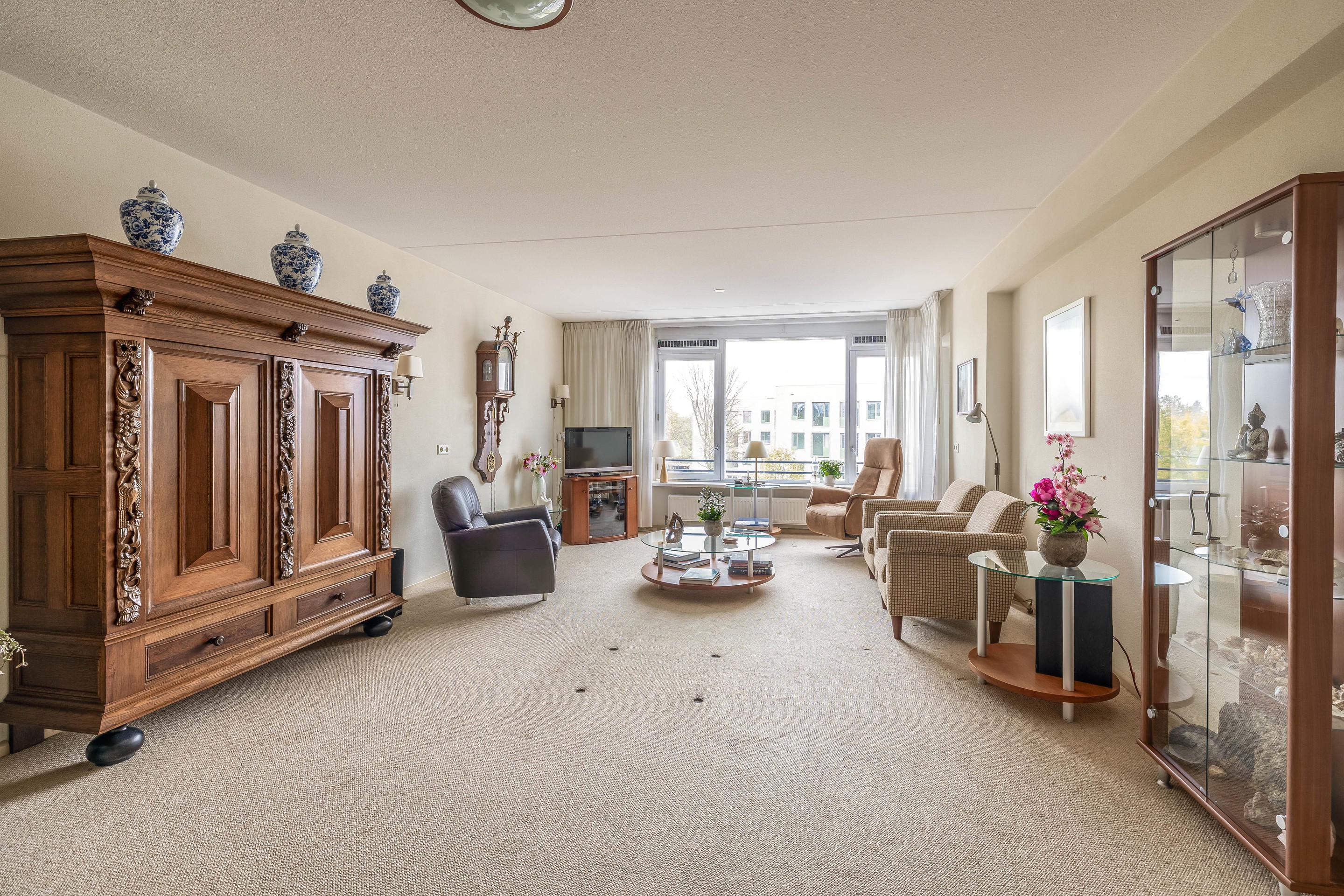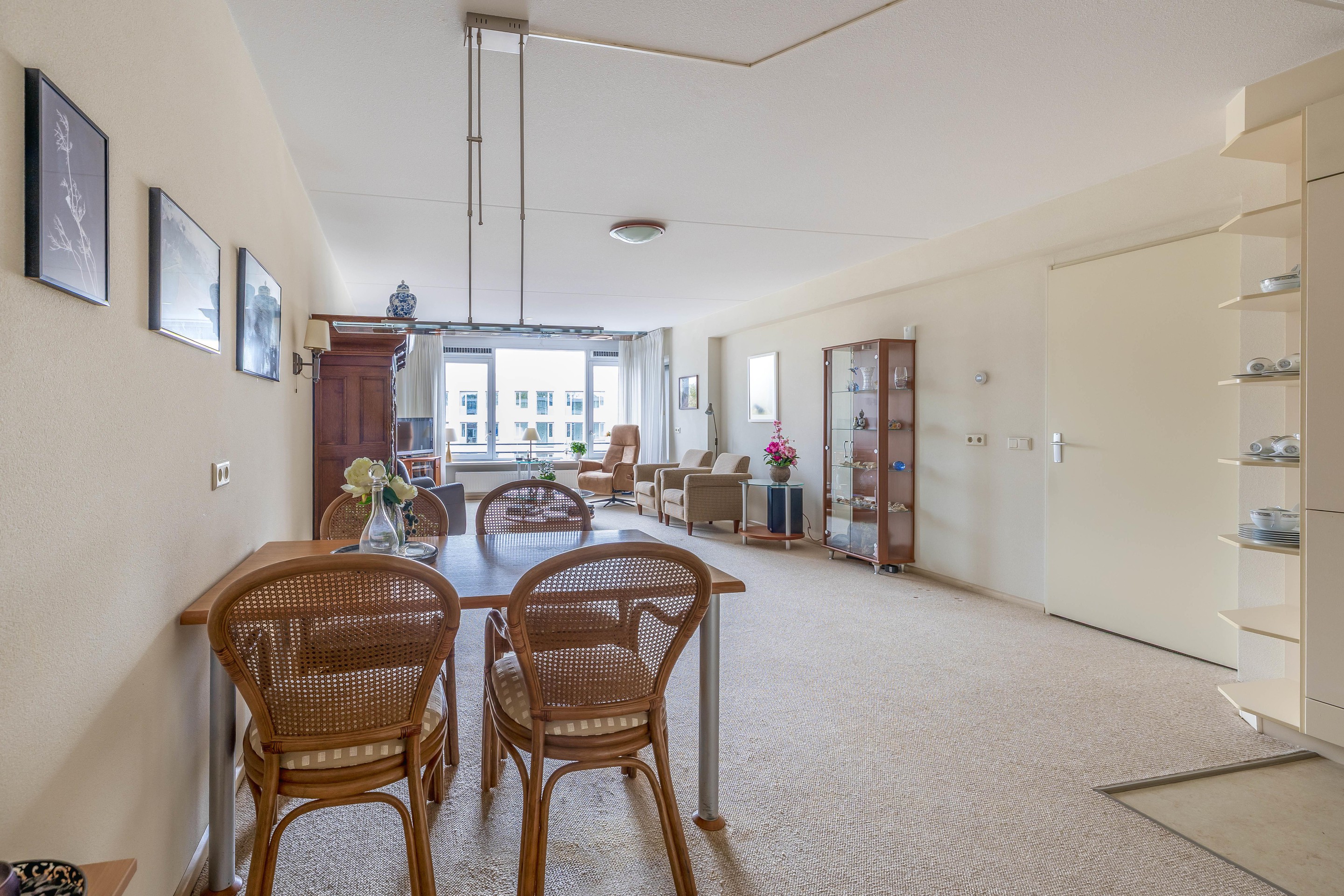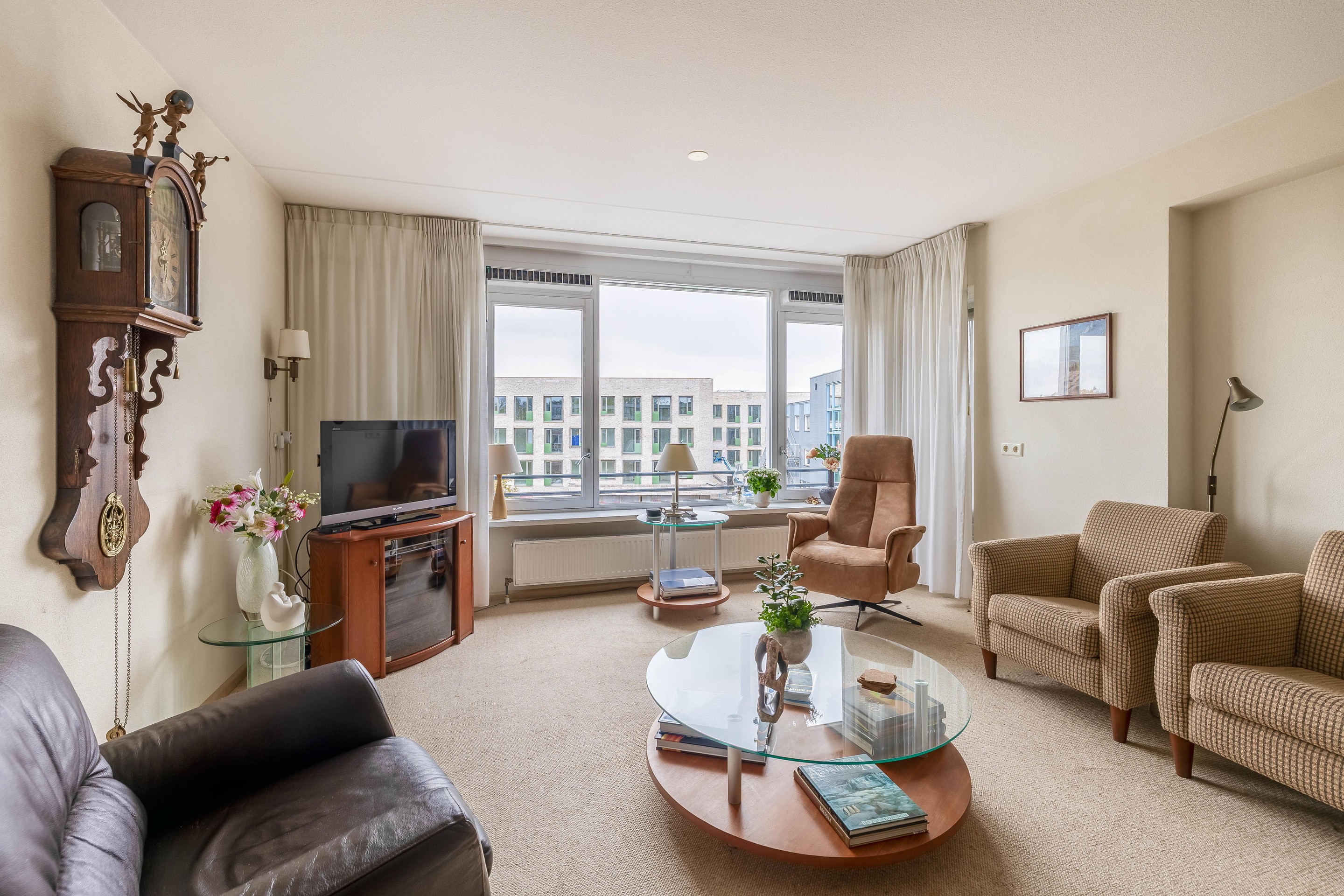 De ruime en lichte woonkamer ligt eveneens aan de achterzijde en biedt een fraai uitzicht over de omgeving - een uitzicht dat eigenlijk nooit verveelt. Vanuit de woonkamer heb je toegang tot het deels inpandige balkon van circa 11 m2. De woonkamer staat in open verbinding met de keuken en samen vormen zij een royale leefruimte van ongeveer 44 m2.