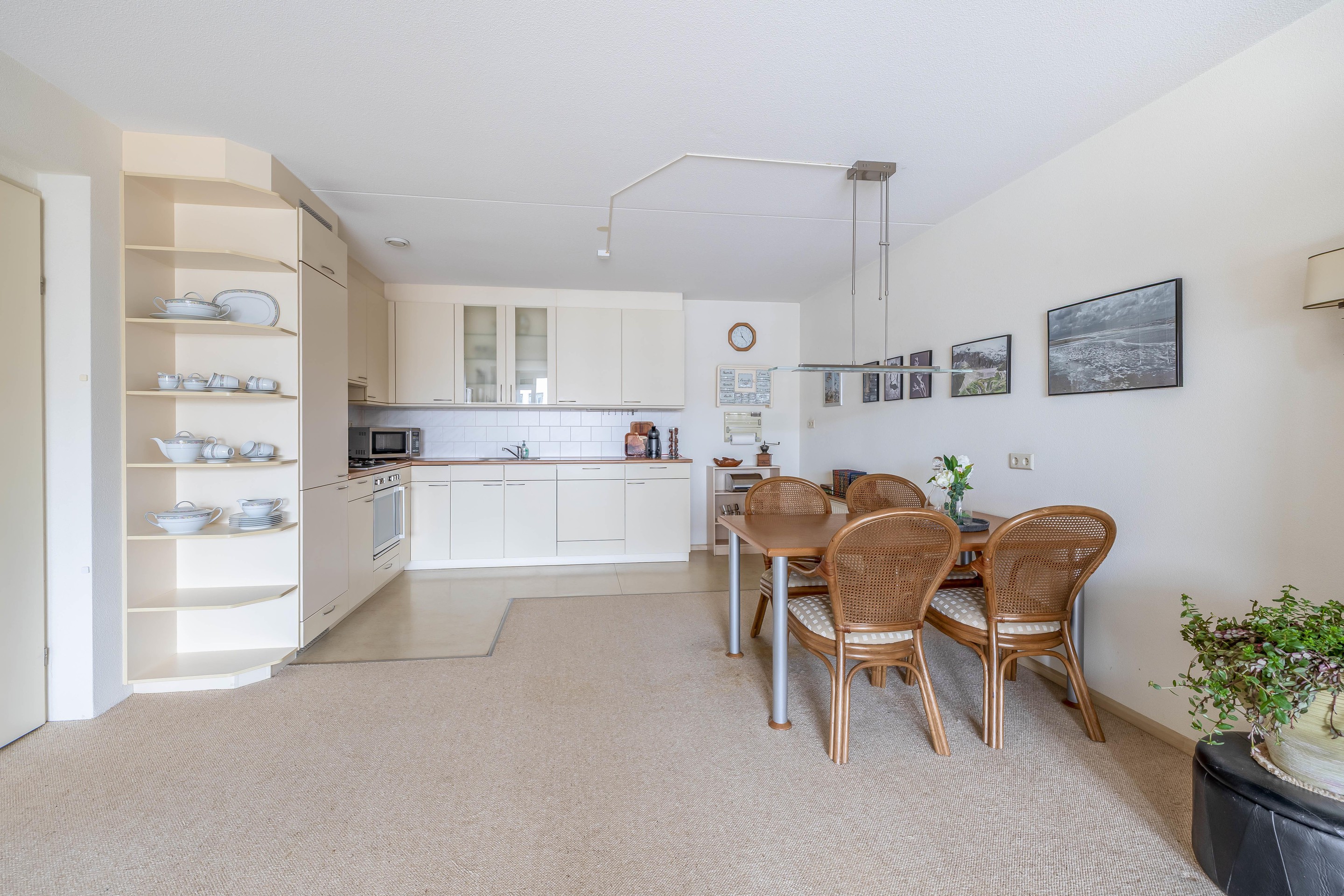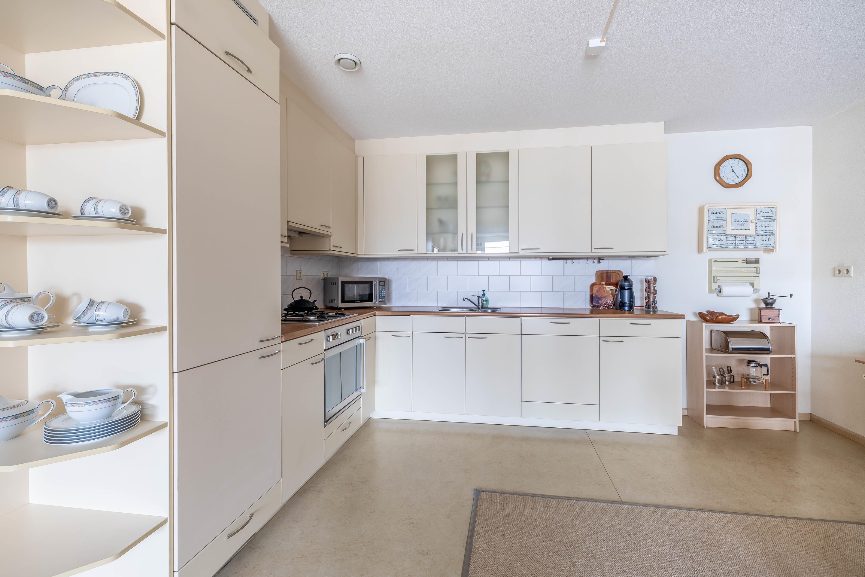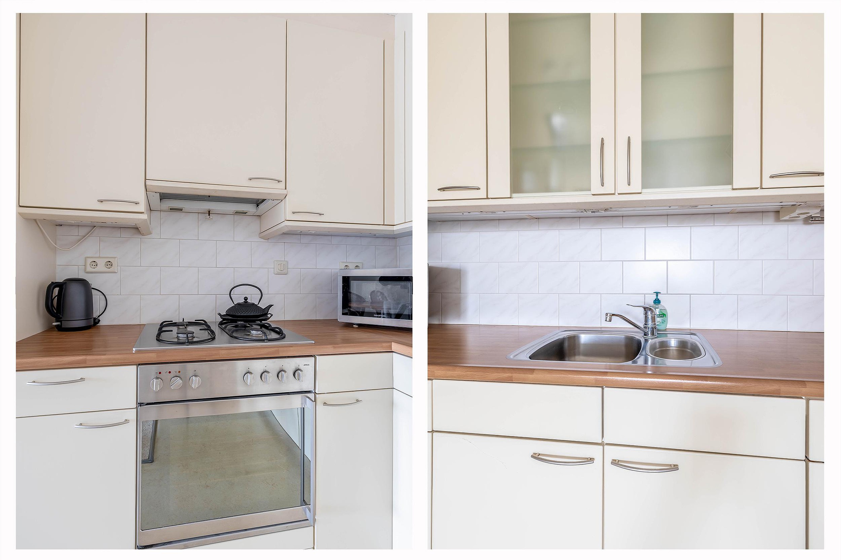 De keuken is opgesteld in een ruime L-vorm en voorzien van diverse inbouwapparatuur, waaronder een grote oven, koel-vriescombinatie en vaatwasser.