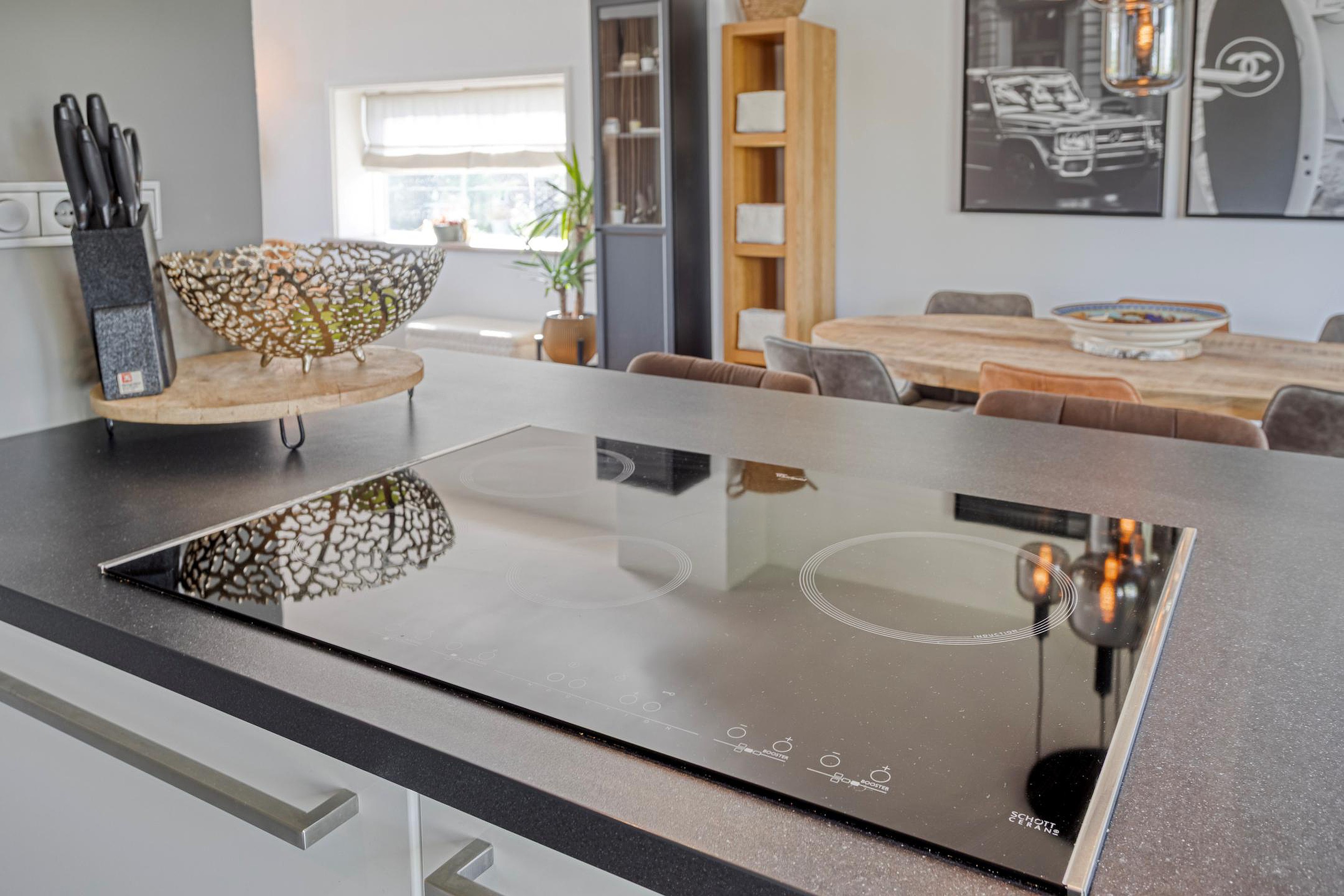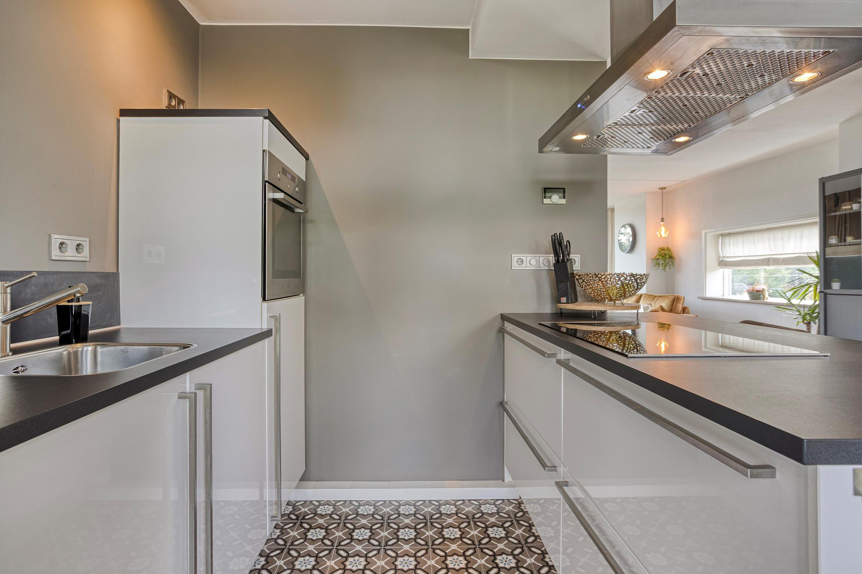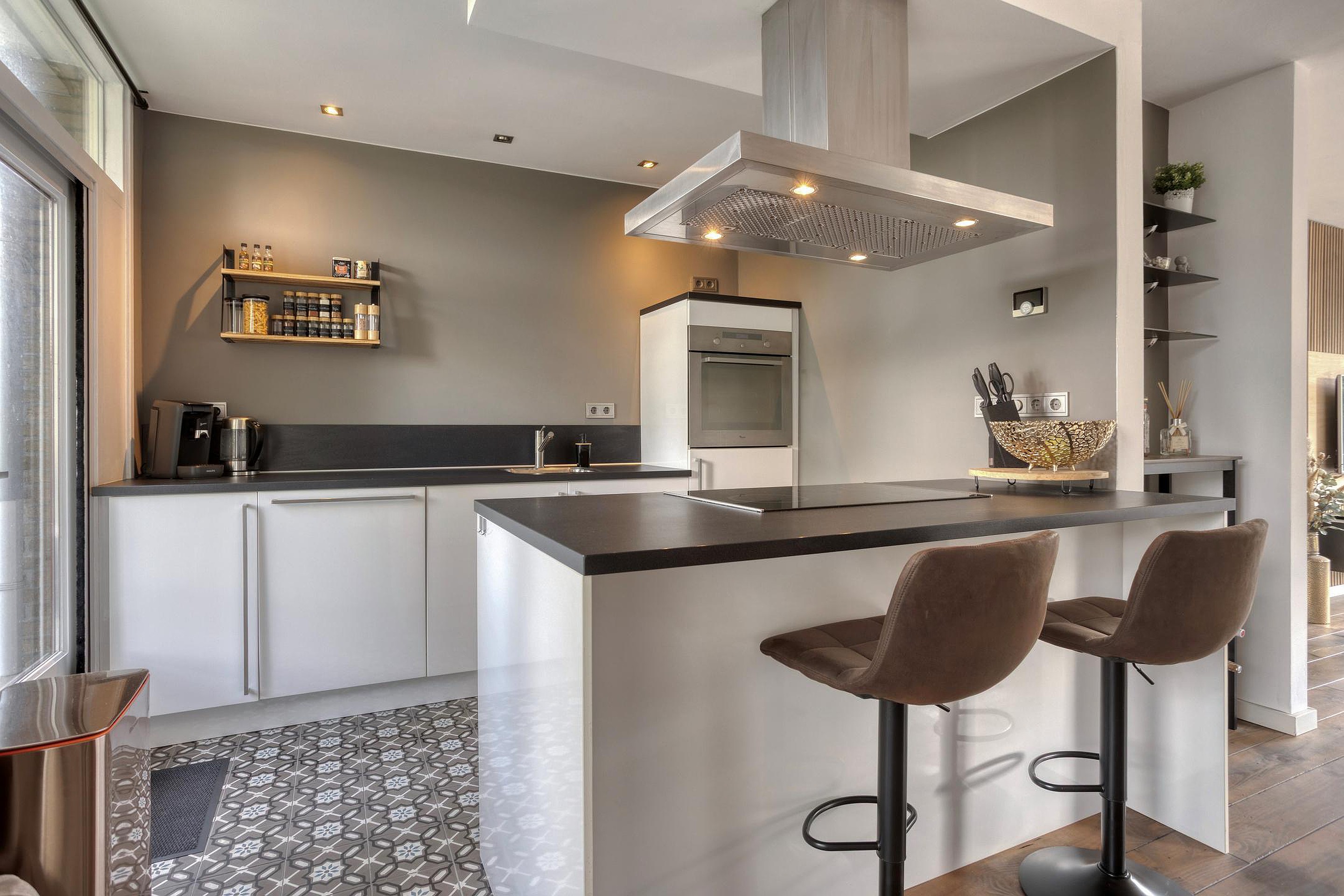 De moderne open keuken is ingericht met een recht keukenmeubel, een kookeiland met ontbijtfunctie, een inductiekookplaat, afzuigkap, oven, koel-/vriescombinatie en een vaatwasser. Op de vloer ligt een cementtegelvloer in Portugese stijl (2019).