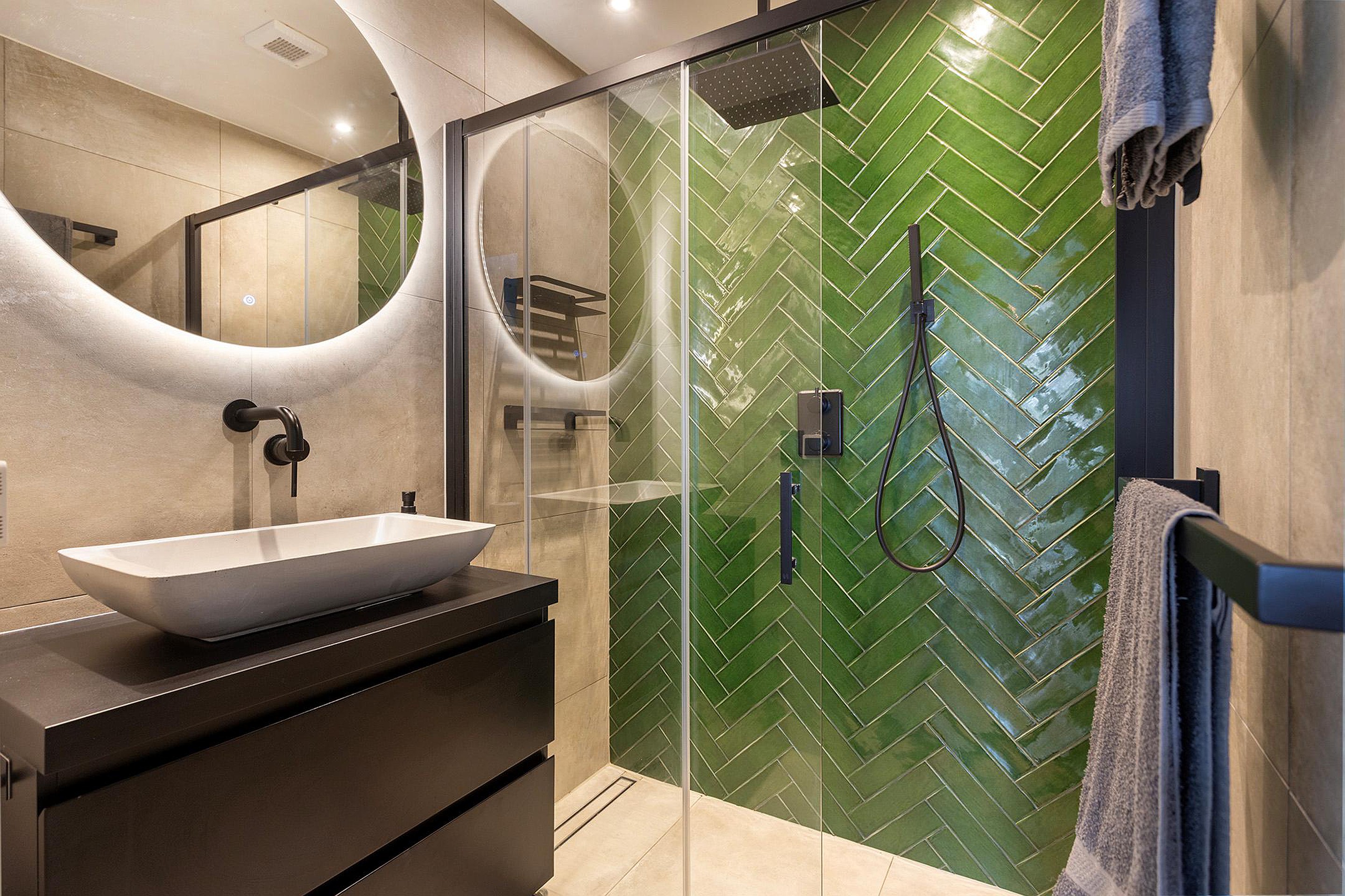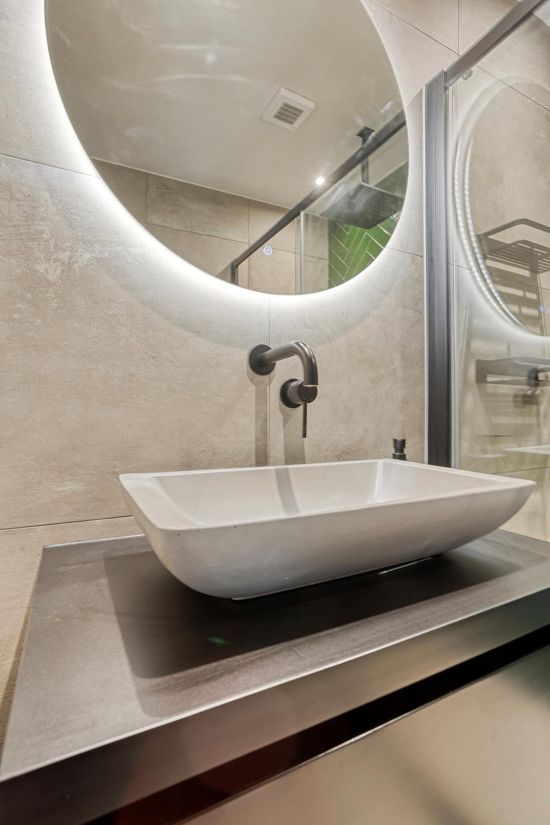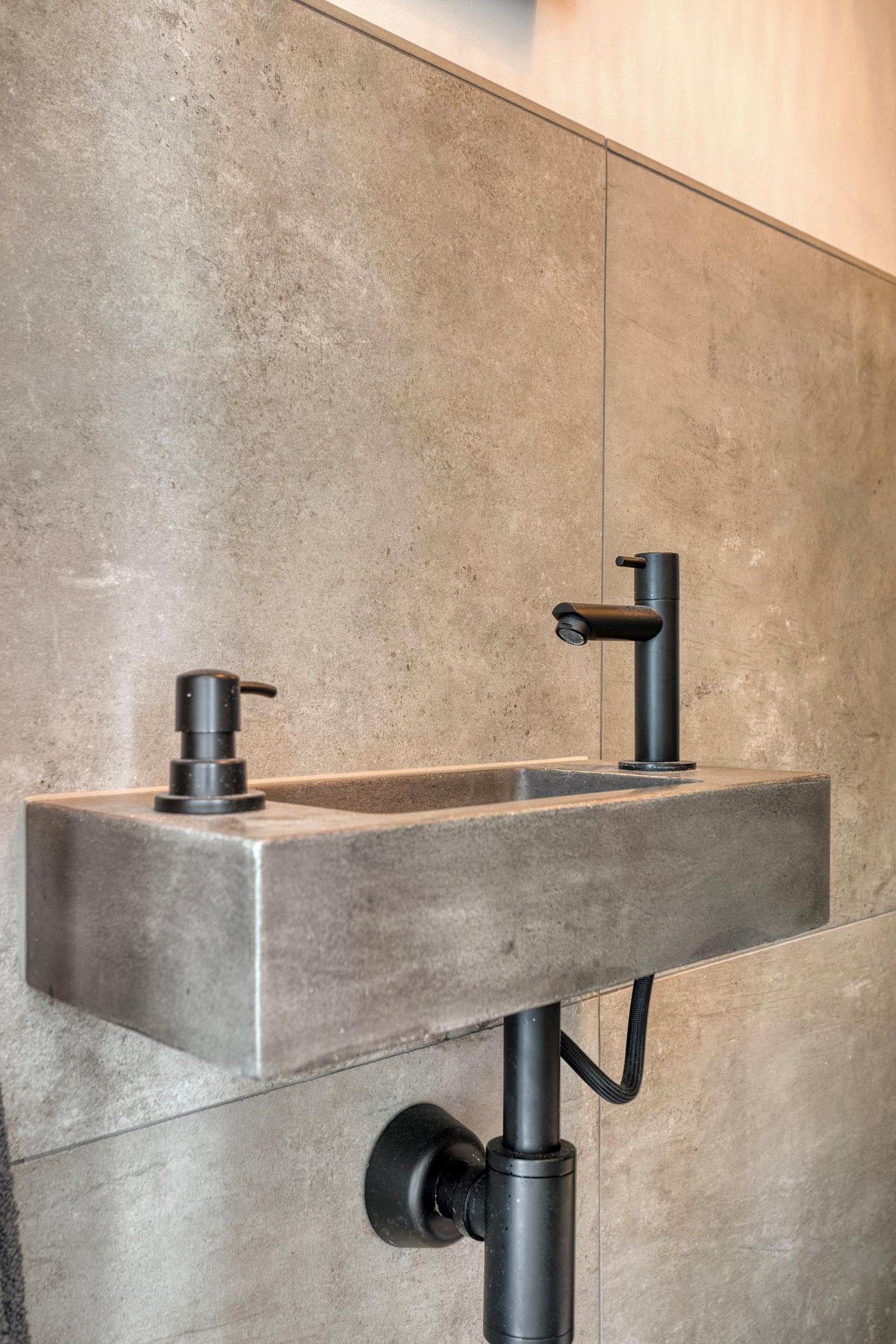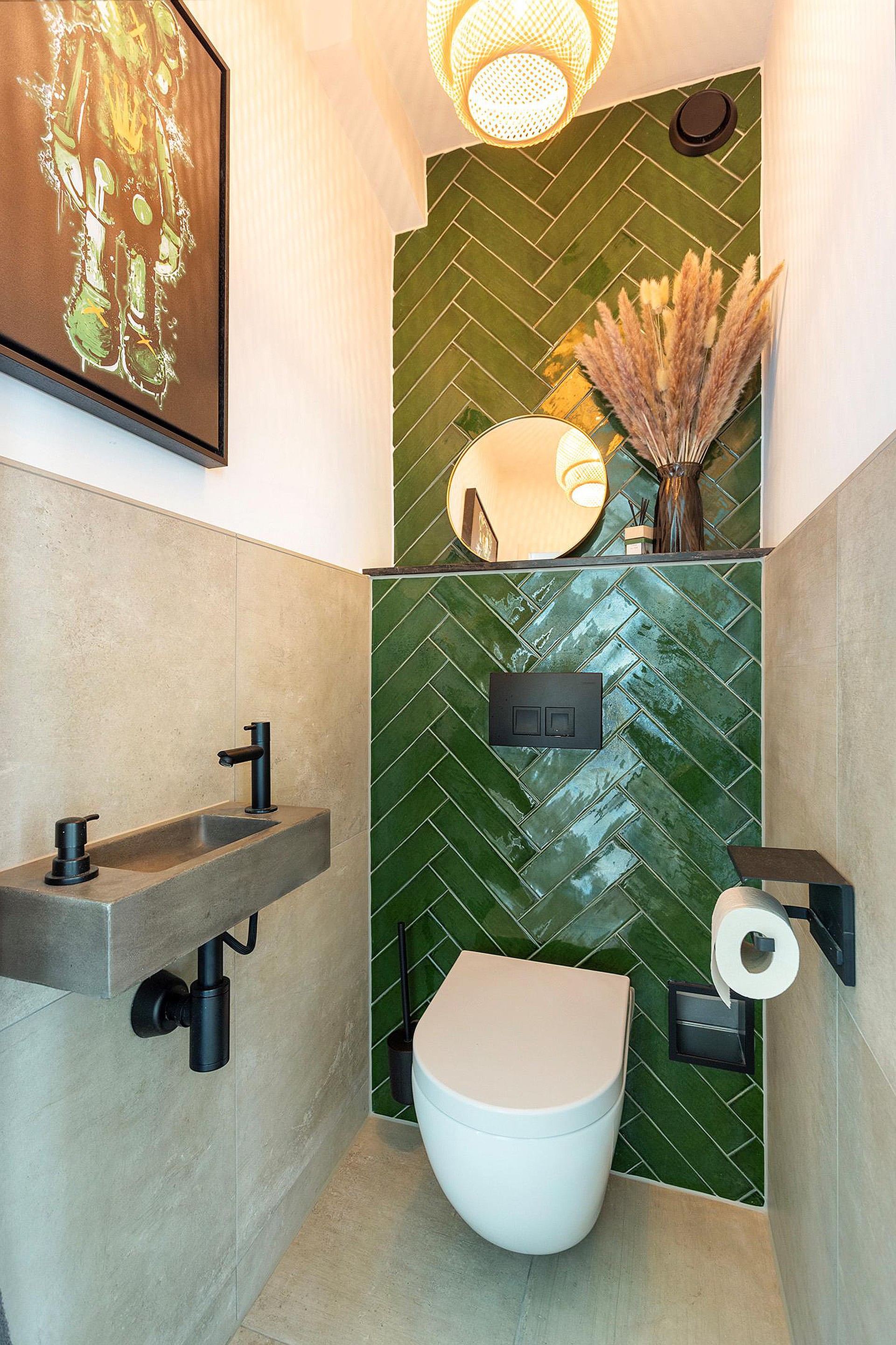 De moderne badkamer (2021) is geheel betegeld en uitgerust met een regendouche, wastafelmeubel met waskom en geïntegreerde kraan, verwarmde en verlichte spiegel, mechanische ventilatie en elektrische vloerverwarming. Naast de badkamer is een separate toiletruimte aanwezig welke eveneens in 2021 is gemoderniseerd.