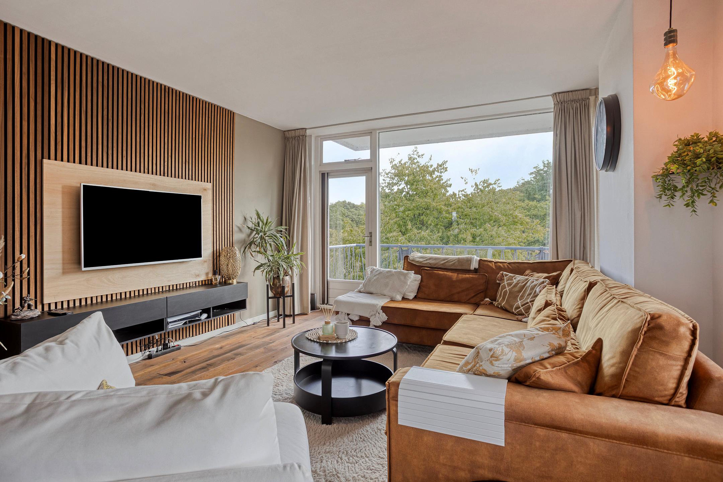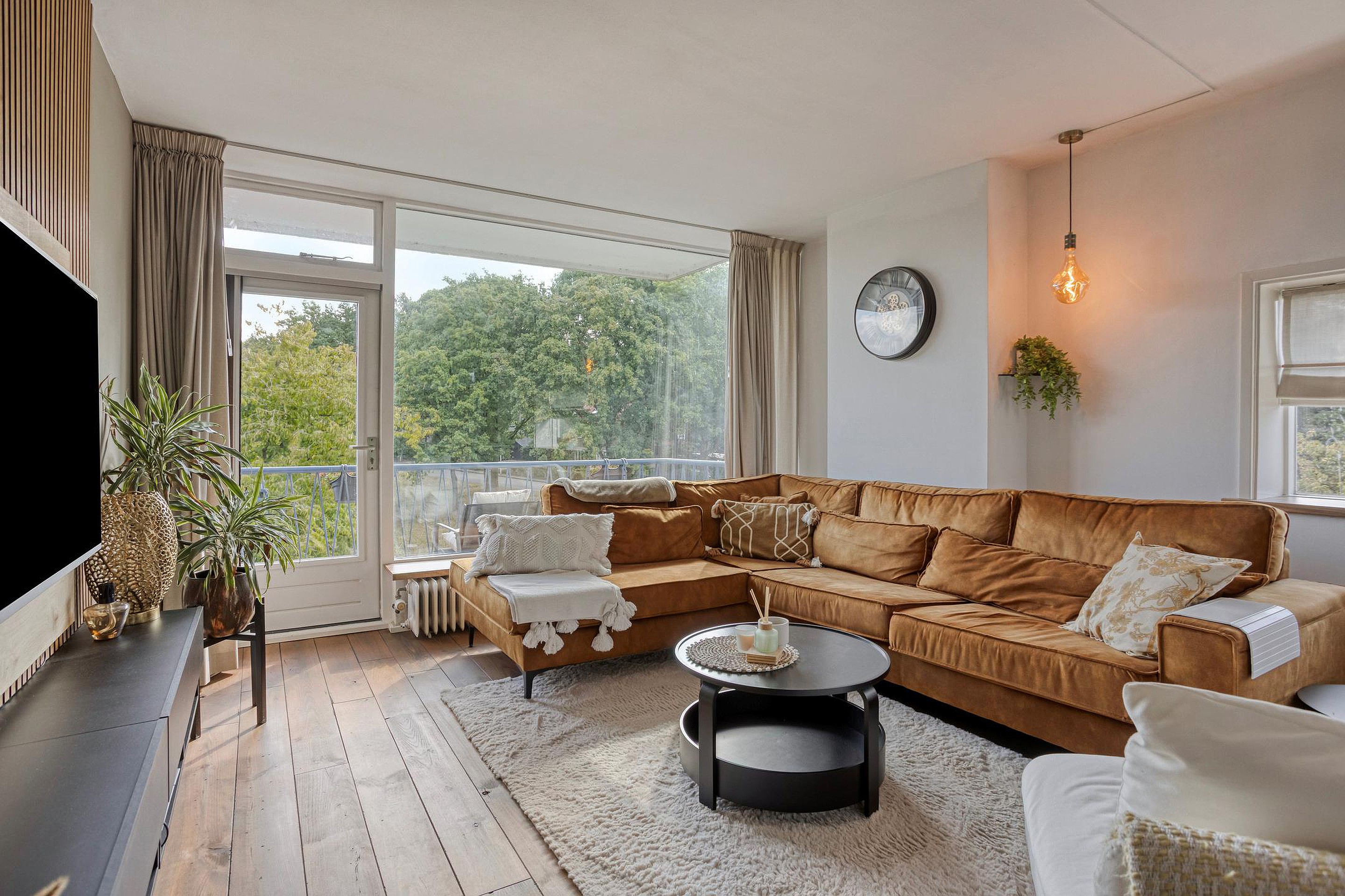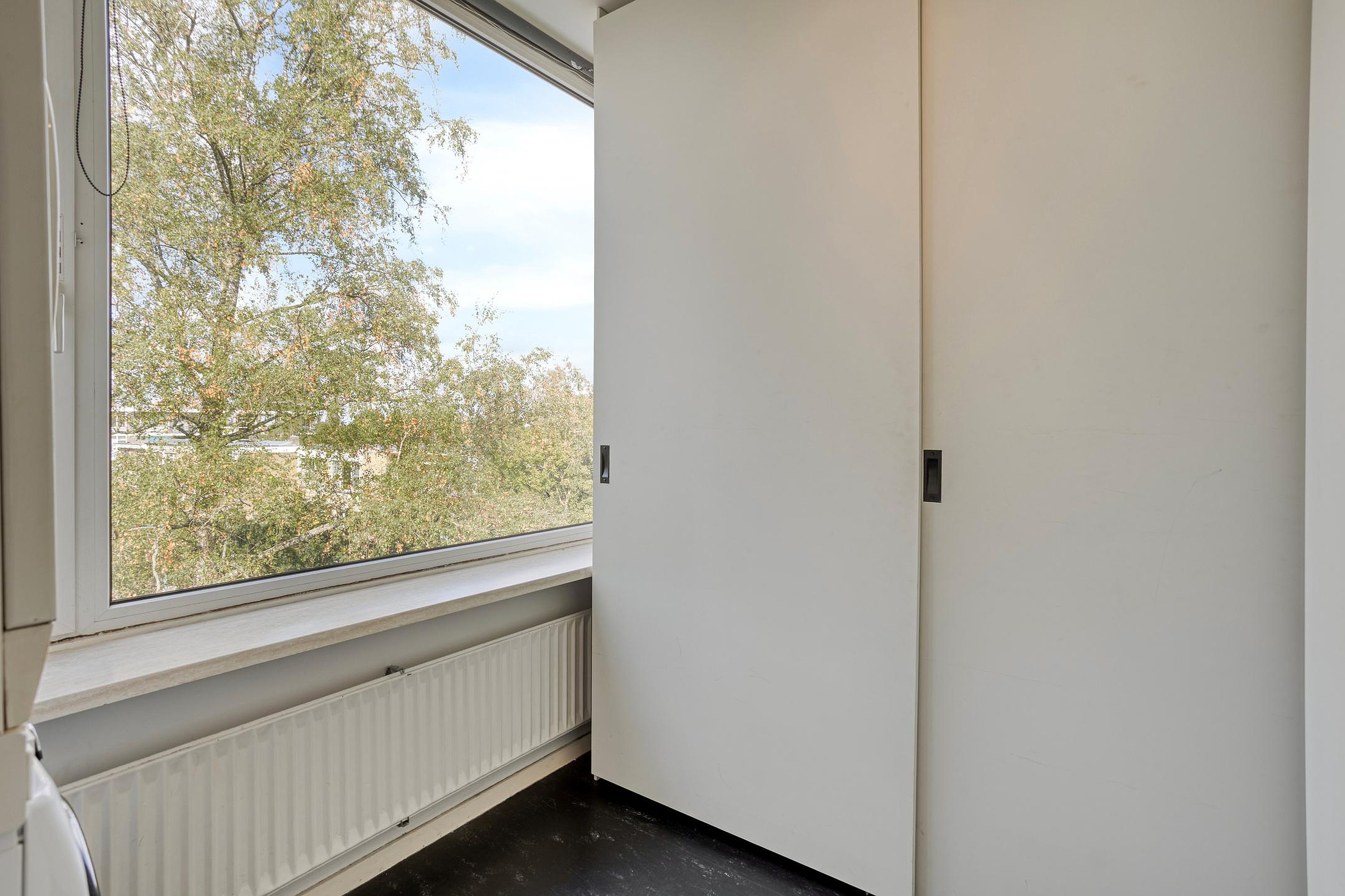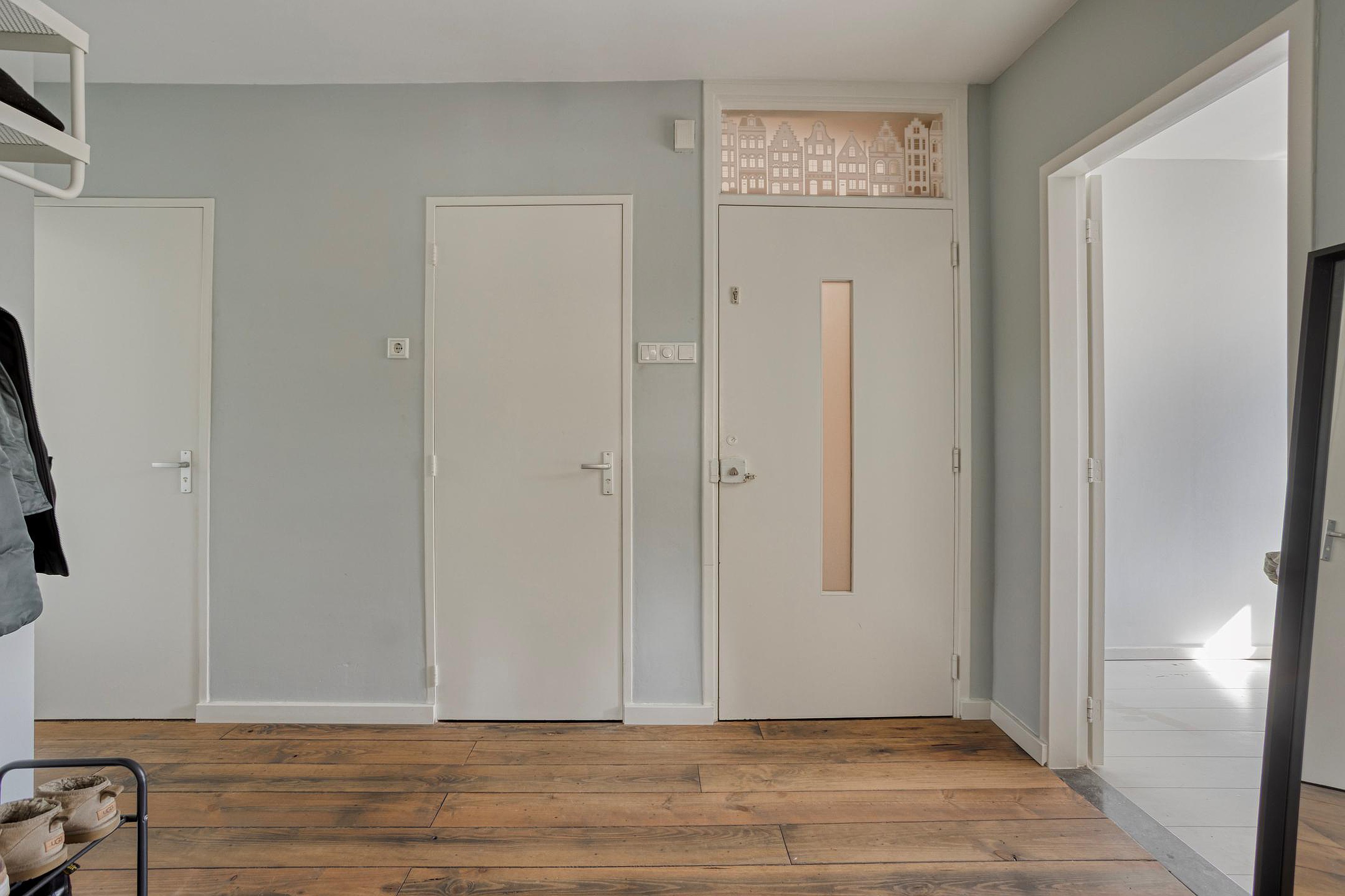 U komt binnen in de ruime hal, waar u de meterkast, ruimte voor een garderobe, een moderne toiletruimte met fontein en de nieuwe badkamer (2021) treft. Vanuit de hal zijn alle woonvertrekken bereikbaar. De ruime woonkamer wordt gevuld met veel lichtinval, door de raampartijen aan 3 zijden en de balkondeuren aan weerszijden. Het appartement is voorzien van een nette afwerking, met lichte wanden en een houten vloer (2019). Er is genoeg ruimte voor een fijne zithoek en een grote eethoek is ook zo geplaatst.