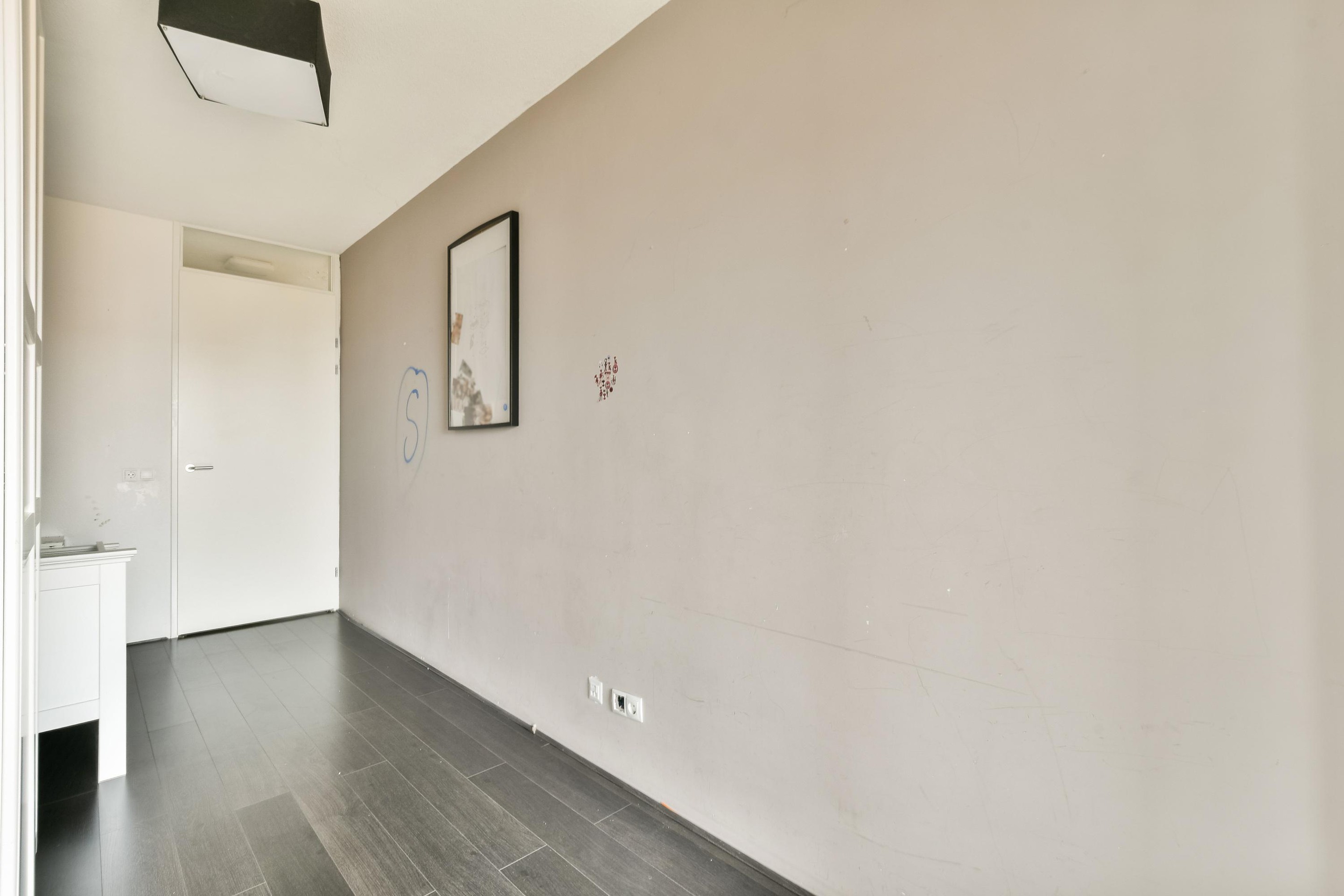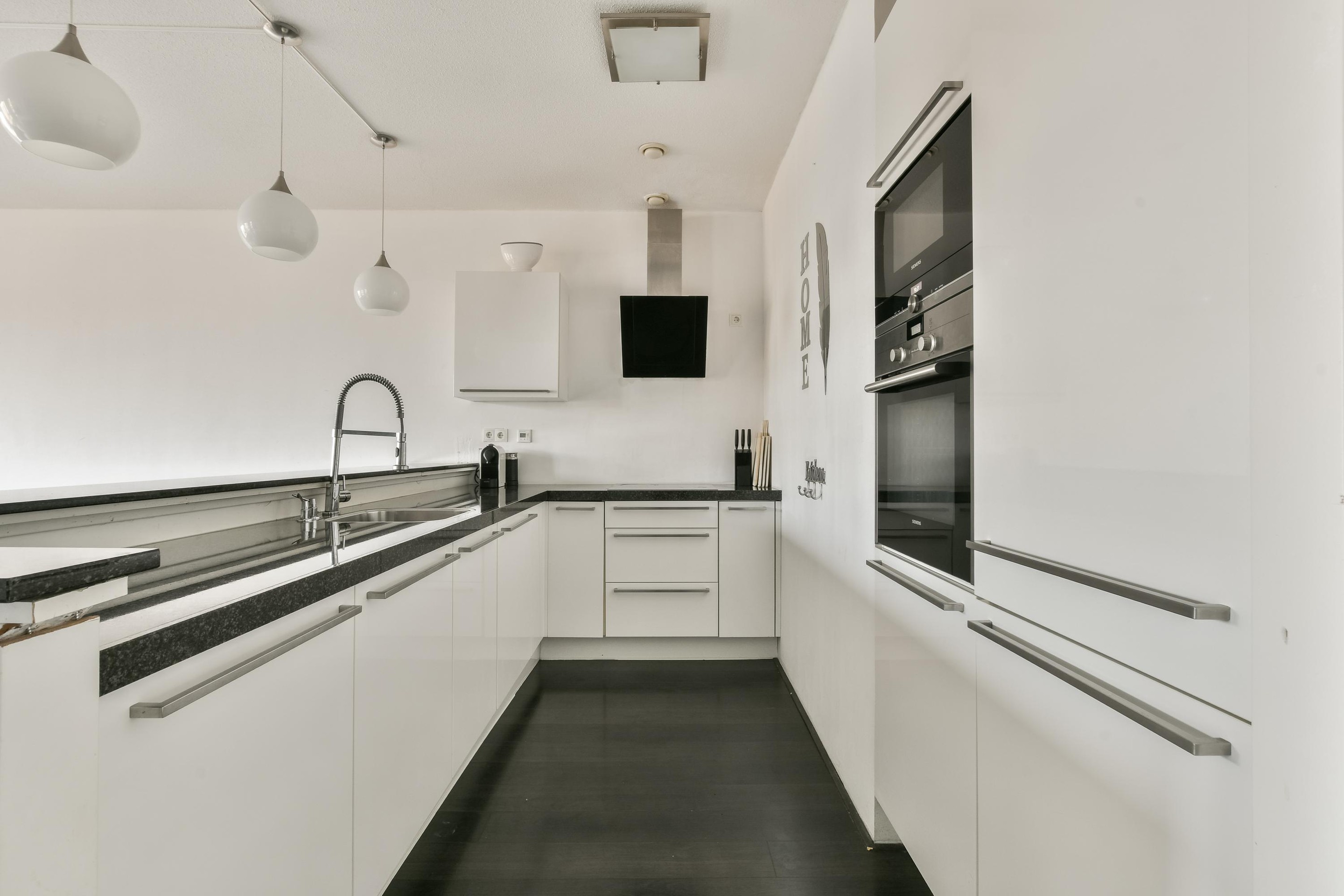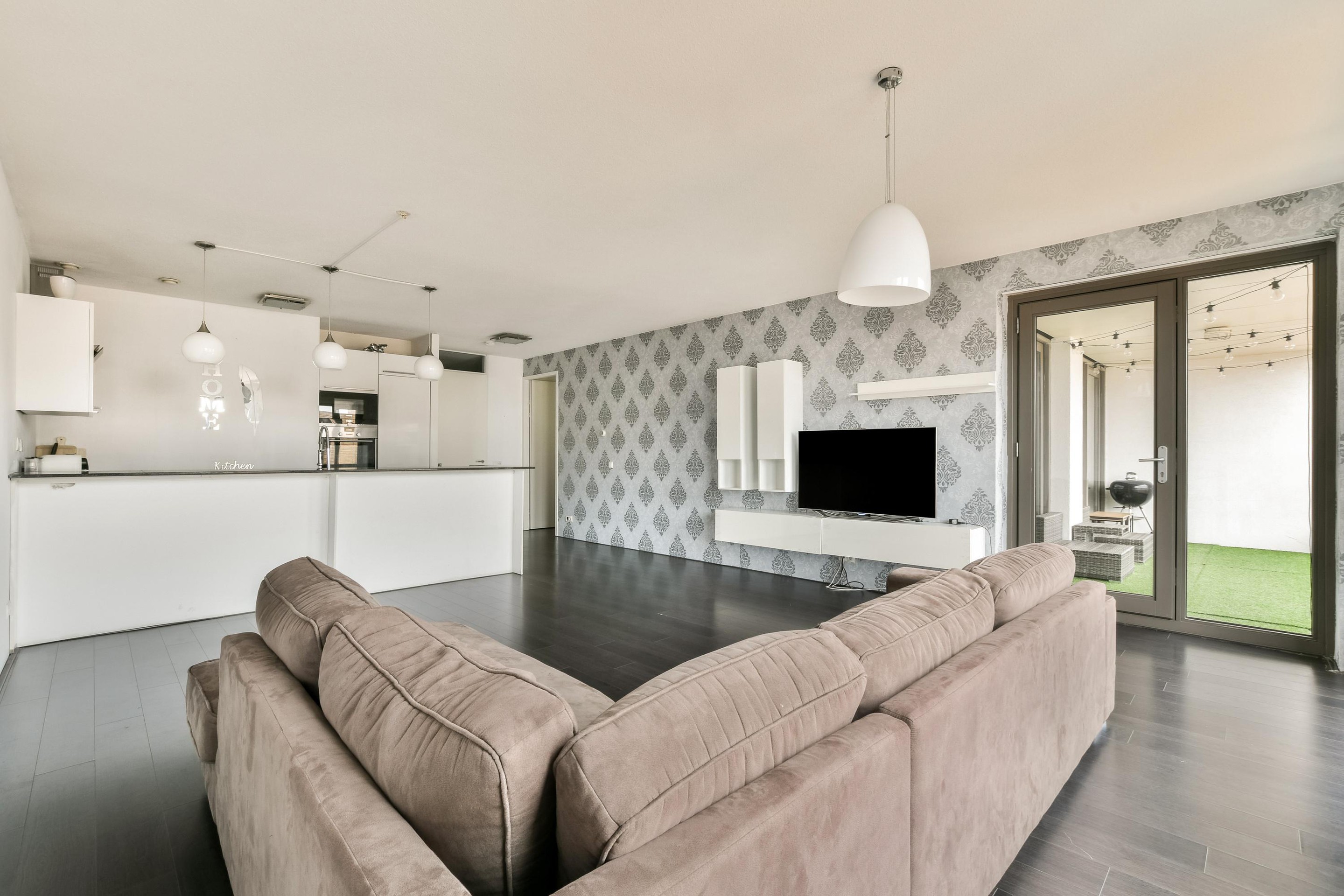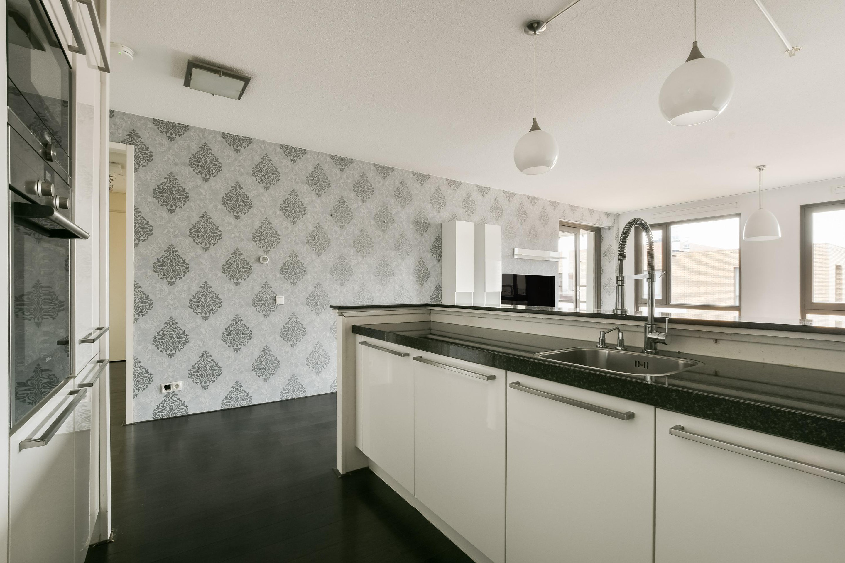 De royale en extra diepe woonkamer is dankzij de grote raampartijen bijzonder licht en biedt toegang tot het ruime balkon. Het balkon is gelegen op het westen, waardoor u tot in de avond kunt genieten van de zon en uitkijkt op het verzorgde binnenplein van de omliggende appartementencomplexen.