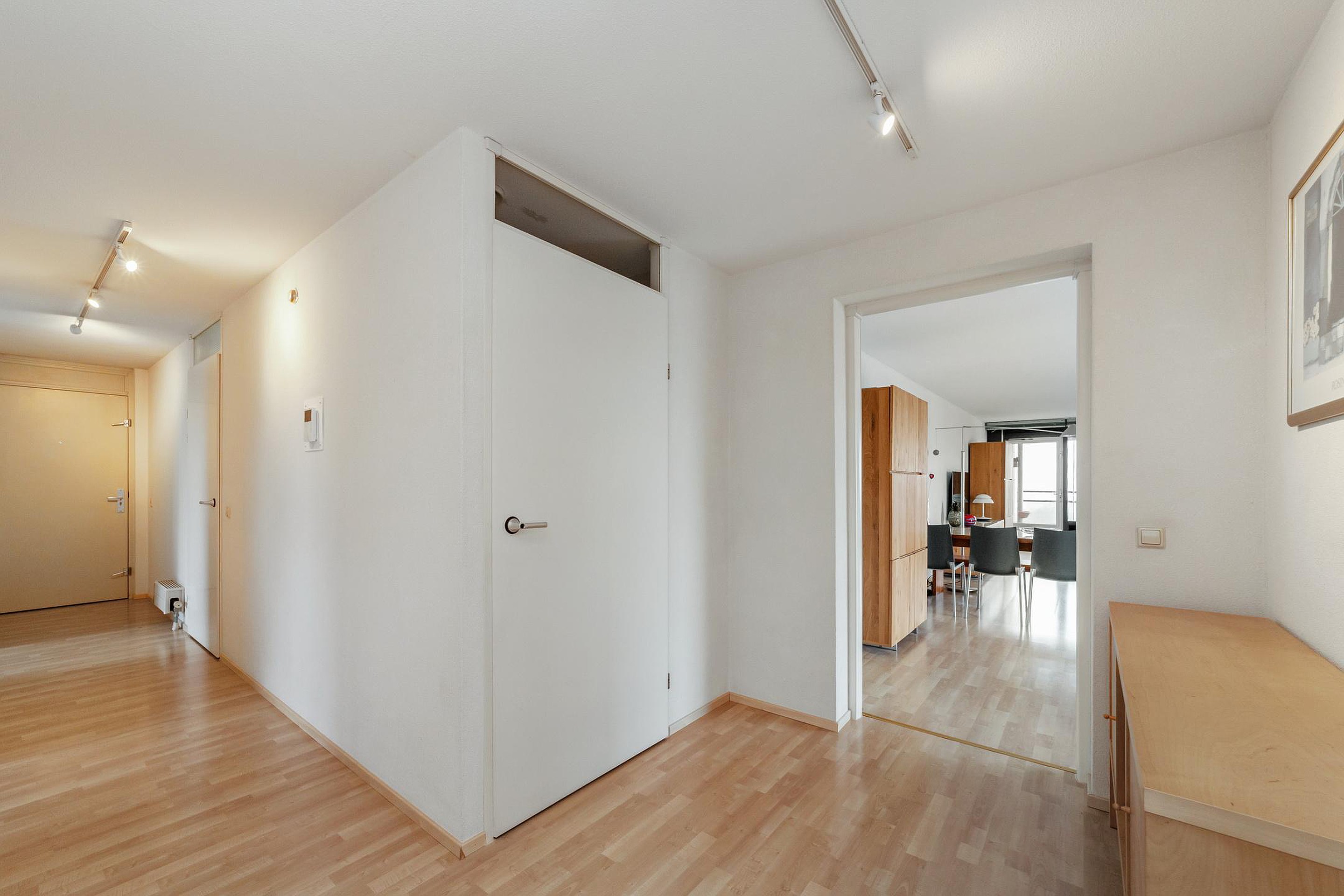 The well-maintained complex has a neat and spacious reception hall. Here you'll find the doorbell panel with video intercom, well-organized mailboxes, the elevators, and direct access to the shared bicycle storage room.